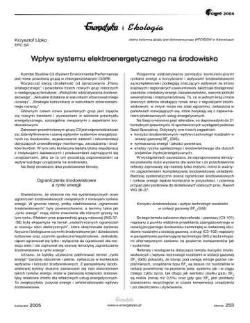 Krzysztof Lipko Jedna kolumna działu jest dotowana przez WFOŚiGW w Katowicach EPC SA Wpływ systemu elektroenergetycznego na środowisko Komitet Studiów C3 (System Environmental Performance) jest nowo powołaną grupą w zreorganizowanym CIGRE. Rozpoczął swoją działalność od opracowania „Planu strategicznego” i powołania trzech nowych grup roboczych o następującej tematyce: „Wskaźniki oddziaływania środowiskowego”, „Aktualne działania w warunkach zrównoważonego rozwoju”, „Strategie komunikacji w warunkach zrównoważonego rozwoju”. Głównym celem nowo powołanych grup jest zajęcie się nowymi trendami i wyzwaniami w sektorze przemysłu energetycznego, szczególnie związanymi z aspektami środowiskowymi. Zakresem przedmiotowym grupy C3 jest odpowiedzialność za: zidentyfikowanie i ocenę wpływów systemów energetycznych na środowisko, wypracowanie zaleceń i rekomendacji dotyczących prawidłowego monitoringu, zarządzania i środków kontroli. W tym celu konieczna będzie bliska współpraca z instytucjami badawczymi i producentami zajmującymi się urządzeniami, jako że to oni pozostają odpowiedzialni za wpływ każdego urządzenia na środowisko. Na Sesji omawiano dwa podstawowe tematy. Ograniczenia środowiskowe a rynki energii Stwierdzono, że obecnie nie ma systematycznych ocen ograniczeń środowiskowych związanych z rozwojem rynków energii. W gruncie rzeczy, próby zdefiniowania „ograniczeń środowiskowych” były powierzchowne, a terminy takie jak „rynki energii” mają różne znaczenia dla różnych graczy na tym rynku. Efektem prac poprzedniej grupy roboczej (WG 37-36) była ekspertyza na temat „nietechnicznych ograniczeń w rozwoju sieci elektrycznych”, która obejmowała zarówno fizyczne i biologiczne czynniki środowiskowe jak i dziedzictwo kulturowe oraz czynniki społeczno/wspólnotowe. Jednakże, raport ograniczał się tylko i wyłącznie do ograniczeń dla rozwoju sieci i nie zajmował się szerzej tematyką „ograniczenia środowiskowe a rynki energii”. Uznano, że byłoby użyteczne zdefiniować termin „rynki energii” bardziej obszernie i pełnie, zwłaszcza w kontekście wpływów i korzyści środowiskowych. Z perspektywy środowiskowej byłoby słuszne zastanowić się nad stworzeniem takich rynków energii, które w pierwszej kolejności stanowiłyby właściwe źródło dla właściwych usług energetycznych. To zwiększyłoby zużycie energii i zminimalizowało wpływy środowiskowe. kwiecień 2005 Wzajemne oddziaływania pomiędzy konkurencyjnymi rynkami energii a korzyściami i wpływami środowiskowymi są kompleksowe i podlegają znaczącym wpływom ze strony krajowych i regionalnych uwarunkowań, takich jak dostępność zasobów, niedobory energii, bezpieczeństwo, warunki polityki wewnętrznej i międzynarodowej. To, co w jednym kraju może stworzyć dobrze działający rynek wraz z regulacjami środowiskowym, w innym może nie zdać egzaminu, zwłaszcza w państwach rozwijających się, które borykają się z zapewnieniem podstawowych usług energetycznych. Na Sesji omówiono pięć referatów, co doprowadziło do 21 formalnych (pisemnych) i 6 spontanicznych wystąpień podczas Sesji Specjalnej. Dotyczyły one trzech zagadnień: korzyści środowiskowych i wpływu technologii rozdzielni w izolacji gazowej SF6 (GIS), wytwarzania energii i jakości powietrza, analizy ryzyka społecznego i środowiskowego dla dużych projektów (hydro)energetycznych. W wystąpieniach zauważano, że zaproponowana tematyka postawiła duże wyzwania dla autorów i że przedstawione referaty zajmowały się niestety tylko małymi, mimo iż ważnymi zagadnieniami kompleksowej środowiskowej układanki. Bardziej systematyczna ocena ograniczeń środowiskowych i rynków energii będzie konieczna w przyszłości, i powinna przyjąć jako podstawę do dodatkowych dalszych prac, Raport WG 36-37. Korzyści środowiskowe i wpływ technologii rozdzielni w izolacji gazowej SF6 (GIS) Do tego tematu zaliczono dwa referaty – pierwszy (C3-101) napisany z punktu widzenia projektanta zaangażowanego w rozwój przyjaznego środowisku zamkniętej w metalowej obudowie rozdzielni z izolacją gazową, a drugi (C3-102) napisany w perspektywie porównującej technologie GIS z technologiami alternatywnymi zarówno na poziomie komponentów jak i systemów. Referaty i wystąpienia dotyczące tematu korzyści środowiskowych i wpływu technologii rozdzielni w izolacji gazowej SF6 (GIS) pokazały, że biorąc pod uwagę emisje gazów cieplarnianych, urządzenia typu SF6 są lepsze niż rozdzielnie w izolacji powietrznej na poziomie pola, systemu jak i w ciągu całego cyklu życia, tak długo jak wartości ubytku gazu SF6 są niskie (mniej niż 0,5%) oraz gdy gaz SF6 jest poddany starannemu recyclingowi w czasie konserwacji urządzenia i po zakończeniu użytkowania. www.e-energetyka.pl strona 253 Główną tego przyczyną są znacznie niższe straty energii w urządzeniu SF6 GIS i możliwość skonfigurowania go bardziej wydajnie w systemie przesyłowym i dystrybucyjnym, co przekłada się na dalsze ograniczenia strat energii. Kluczowym tematem dyskusji było zagadnienie, jaki jest realnie osiągalny ubytek operacyjny, biorąc pod uwagę, że międzynarodowe normy wskazują wartości od 0,5 do 3%. Przedstawiciele operatorów sieci dostarczyli informacji, że 0,5% jest rozsądną granicą wartości ubytku, natomiast producenci sprzętu dowodzili, że dla nowych urządzeń GIS osiągalna byłaby wartość około 0,1%. Uznano, że pomimo przeprowadzanych obecnie badań nad możliwością wymiany SF6 na inny gaz, nie zidentyfikowano żadnych odpowiednich zamienników, które miałyby takie same doskonałe właściwości jak SF6. Raport C3-101 przedstawia wyniki znaczącej redukcji zużywanych materiałów, energii i gazu SF6 przy projektowaniu i produkcji nowoczesnych urządzeń GIS. Nie wyjaśnia jednak podstawowego zagadnienia, czyli jak