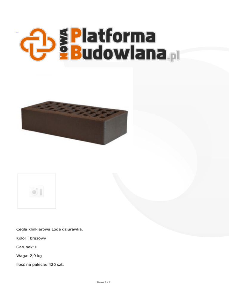 Cegla klinkierowa Lode dziurawka. Kolor : brązowy Gatunek: II Waga: 2,9 kg Ilość na palecie: 420 szt. Strona 1 z 2 Waga kg 2,9 Strona 2 z 2