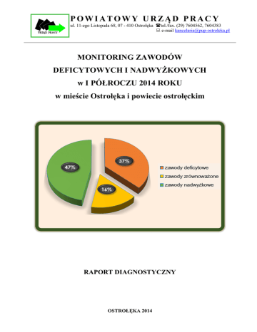 POWIATOWY URZĄD PRACY ul. 11-ego Listopada 68, 07 - 410 Ostrołęka tel./fax. (29) 7604562, 7604383 e-mail [email protected] MONITORING ZAWODÓW DEFICYTOWYCH I NADWYŻKOWYCH w I PÓŁROCZU 2014 ROKU w mieście Ostrołęka i powiecie ostrołęckim RAPORT DIAGNOSTYCZNY OSTROŁĘKA 2014 Spis treści WSTĘP .................................................................................................................................................................................. 3 1. BEZROBOTNI WEDŁUG ZAWODÓW ......................................................................................................................... 5 1. 1. Bezrobotni według zawodów w mieście Ostrołęka. Stan na koniec I półrocza 2014 roku. ....................................... 5 1.2. Bezrobotni według zawodów w powiecie ostrołęckim w 2014 roku. Stan na koniec I półrocza 2014 roku. .......... 13 2. ANALIZA OFERT PRACY ............................................................................................................................................ 19 2.1. Struktura ofert pracy w mieście Ostrołęka w I półroczu 2014 roku. ........................................................................ 19 3. ZAWODY DEFICYTOWE I NADWYŻKOWE ............................................................................................................ 25 3.1. Analiza zawodów deficytowych i nadwyżkowych w mieście Ostrołęka w I półroczu 2014 roku. ......................... 26 3.2. Analiza zawodów deficytowych i nadwyżkowych w powiecie ostrołęckim w I półroczu 2014 roku. ..................... 31 4. BEZROBOCIE WEDŁUG POLSKIEJ KLASYFIKACJI DZIAŁALNOŚCI ................................................................ 35 4.1. Bezrobocie według Polskiej Klasyfikacji Działalności w mieście Ostrołęka. Stan na koniec I półrocza 2014 roku 35 4.2. Bezrobocie według Polskiej Klasyfikacji Działalności w powiecie ostrołęckim w I półroczu 2014 roku. .............. 37 WNIOSKI ............................................................................................................................................................................ 39 SPIS TABEL ....................................................................................................................................................................... 41 SPIS WYKRESÓW ............................................................................................................................................................. 41 2 WSTĘP Ustawa z dnia 20 kwietnia 2004 r. o promocji zatrudnienia i instytucjach rynku pracy (Dz. U. z 2013 r. poz. 674 z późn. zm.) nakłada na publiczne służby zatrudnienia obowiązek opracowania analiz rynku pracy i badania popytu na pracę w tym prowadzenie monitoringu zawodów deficytowych i nadwyżkowych, w związku z powyższym Powiatowy Urząd Pracy w Ostrołęce zgodnie z wytycznymi Ministerstwa Pracy i Polityki Społecznej, przedstawia półroczny raport diagnostyczny pn. Monitoring Zawodów Deficytowych i Nadwyżkowych w powiecie miasta Ostrołęka oraz powiecie ostrołęckim za pierwsze półrocze 2014 roku. Celem niniejszego opracowania jest uzyskanie informacji na temat zjawisk zachodzących na lokalnym rynku pracy, dotyczących kształtowania popytu na pracę i podaż zasobów pracy, w przekroju zawodowym oraz sformułowanie na tej podstawie wniosków, ocen oraz prognoz, które udostępniane są m.in. władzom oświatowym i dyrekcjom szkół dla korygowania poziomu i struktury kształcenia zawodowego. Jest nim także zwiększenie efektywności organizowanych szkoleń dzięki dostosowywaniu kierunków szkolenia do potrzeb pracodawców. Monitoring pełni dwie zasadnicze funkcje: deskryptywną - opisuje rzeczywistość lokalnego rynku pracy i normatywną – pozwala na formowanie ocen i wniosków dotyczących szkolenia bezrobotnych, poradnictwa zawodowego i służy lepszemu dopasowaniu popytu na pracę. Opracowanie Monitoringu Zawodów Deficytowych i Nadwyżkowych pozwala w szczególności na: Efektywniejsze wykorzystanie środków finansowych na aktywizacje rynku pracy Tworzenie planów szkoleniowych bezrobotnych – w oparciu o potrzeby pracodawców Merytoryczne uzasadnienie pisania programów pod kątem pozyskiwania dodatkowych środków Opiniowanie nowych kierunków kształcenia Tworzenie strategii rozwoju gminy, powiatu oraz województwa Pomoc publicznym i komercyjnym służbom zatrudnienia w profesjonalizacji pośrednictwa pracy i poradnictwa zawodowego Nawiązywanie nowych kontaktów z partnerami rynku pracy, poprawa wizerunku PUP Informacja o kwalifikacjach lokalnych zasobów ludzkich dla nowych inwestorów Główni użytkownicy opracowania monitoringu zawodów deficytowych i nadwyżkowych to między innymi: Ministerstwo Pracy i Polityki Społecznej Powiatowe Urzędy Pracy, Wojewódzkie Urzędy Pracy Władze oświatowe wszelkich szczebli 3 Placówki naukowo – badawcze Starostwa Powiatowe Rady Zatrudnienia Ochotnicze Hufce Pracy Agencje zatrudnienia Instytucje szkoleniowe Inne zainteresowane organy rządowe, samorządowe oraz organizacje pozarządowe i społeczno – polityczne Niniejszy raport został sporządzony zgodnie z zaleceniami metodycznymi do prowadzenia monitoringu zawodów deficytowych i nadwyżkowych w oparciu o: tablice wynikowe wygenerowane przy użyciu specjalnie przygotowanej aplikacji w ramach Systemu Informatycznego SYRIUSZ. Aplikacja ta pozwala na wydruk zestawień zawierających wyliczone wskaźniki, umożliwiające określenie zawodów deficytowych i nadwyżkowych i interpretację uzyskanych wyników, załącznik nr 2 do sprawozdania MPiPS „Bezrobotni według rodzaju działalności ostatniego miejsca pracy oraz ofert pracy za 2014 r., załącznik nr 3 do sprawozdania MPiPS za I półrocze 2014 r. „Bezrobotni oraz oferty pracy według zawodów i specjalności za 2014 r. Podstawą analizy struktury zawodowej bezrobotnych i ofert pracy j
