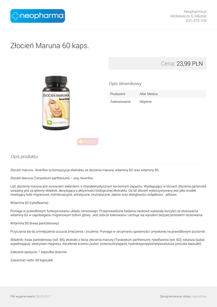 Neopharma.pl Mickiewicza 5, Mikstat 531-470-109 Złocień Maruna 60 kaps. Cena: 23,99 PLN Opis słownikowy Producent Alter Medica Zastosowanie Migrena Opis produktu Złocień maruna - feverfew to kompozycja ekstraktu ze złocienia maruna, witaminy B2 oraz witaminy B5. Złocień Maruna (Tanacetum parthenium) – ang. feverfew. Liść złocienia maruna jest surowcem zielarskim, o charakterystycznym korzennym zapachu. Występujący w liściach złocienia partenolid uważany jest za główny składnik, decydujący o aktywności biologicznej ekstraktu. Od lat złocień wykorzystywany jest jako środek niwelujący bóle migrenowe, menstruacyjne, artretyczne, reumatyczne, zębów oraz dolegliwości żołądkowo - jelitowe. Witamina B2 (ryboflawina) Pomaga w prawidłowym funkcjonowaniu układu nerwowego. Przeprowadzone badania naukowe wykazały korzyści ze stosowania witaminy B2 w zapobieganiu migrenowym bólom głowy. Jest dobrze tolerowana i cechuje się wysokim bezpieczeństwem stosowania. Witamina B5 (kwas pantotenowy) Przyczynia się do zmniejszenia uczucia zmęczenia i znużenia. Pomaga w utrzymaniu sprawności umysłowej na prawidłowym poziomie. Składniki: kwas pantotenowy (wit. B5); ekstrakt z liścia złocienia maruny (Tanacetum parthenium); ryboflawina (wit. B2); celuloza (subst. wypełniająca); stearynian magnezu, dwutlenek krzemu (subst. przeciwzbrylające); hydroksypropylometyloceluloza (otoczka kapsułki). Zalecane spożycie: 1 kapsułka dziennie Zawartość netto: 60 kapsułek Plik wygenerowano: 06-03-2017 Powered by TCPDF (www.tcpdf.org) Oprogramowanie sklepu: AptusShop