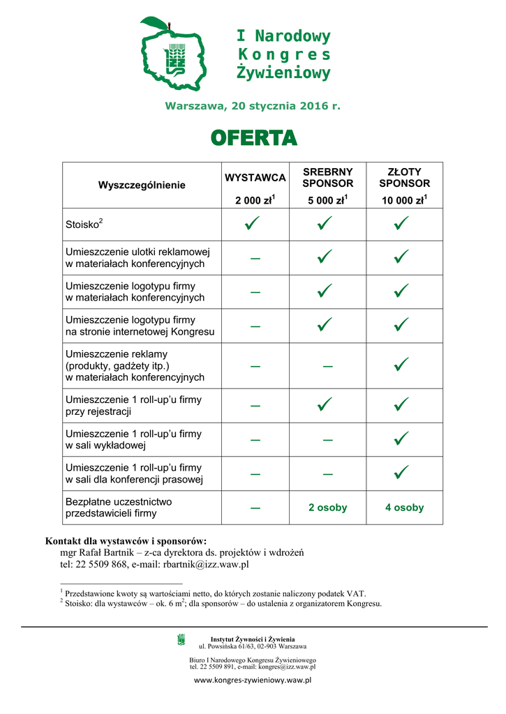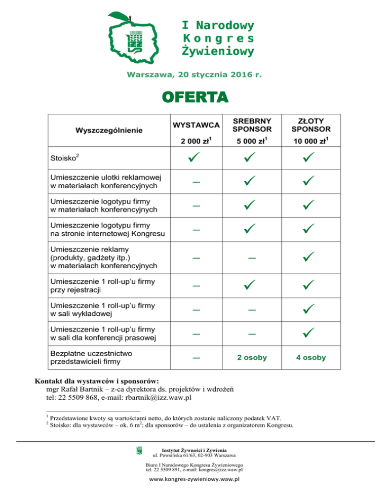 Warszawa, 20 stycznia 2016 r. Wyszczególnienie WYSTAWCA SREBRNY SPONSOR ZŁOTY SPONSOR 2 000 zł1 5 000 zł1 10 000 zł1 Umieszczenie ulotki reklamowej w materiałach konferencyjnych ― Umieszczenie logotypu firmy w materiałach konferencyjnych ― Umieszczenie logotypu firmy na stronie internetowej Kongresu ― Umieszczenie reklamy (produkty, gadżety itp.) w materiałach konferencyjnych ― ― Umieszczenie 1 roll-up’u firmy przy rejestracji ― Umieszczenie 1 roll-up’u firmy w sali wykładowej ― ― Umieszczenie 1 roll-up’u firmy w sali dla konferencji prasowej ― ― Bezpłatne uczestnictwo przedstawicieli firmy ― 2 osoby Stoisko2 Kontakt dla wystawców i sponsorów: mgr Rafał Bartnik – z-ca dyrektora ds. projektów i wdrożeń tel: 22 5509 868, e-mail: [email protected] 1 2 Przedstawione kwoty są wartościami netto, do których zostanie naliczony podatek VAT. Stoisko: dla wystawców – ok. 6 m2; dla sponsorów – do ustalenia z organizatorem Kongresu. Instytut Żywności i Żywienia ul. Powsińska 61/63, 02-903 Warszawa Biuro I Narodowego Kongresu Żywieniowego tel. 22 5509 891, e-mail: [email protected] www.kongres-zywieniowy.waw.pl 4 osoby