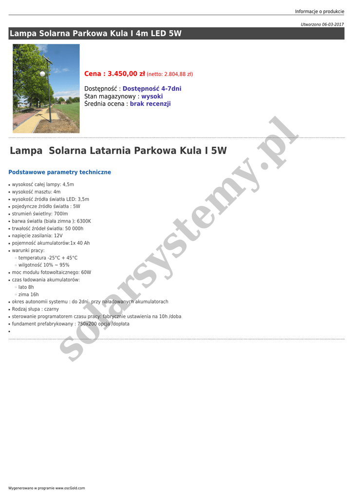 Informacje o produkcie Utworzono 06-03-2017 Lampa Solarna Parkowa Kula I 4m LED 5W Cena : 3.450,00 zł (netto: 2.804,88 zł) y. p Lampa Solarna Latarnia Parkowa Kula I 5W wysokość masztu: 4m ● wysokość źródła światła LED: 3,5m ● pojedyncze źródło światła : 5W ● strumień świetlny: 700lm ● barwa światła (biała zimna ): 6300K ● trwałość źródeł światła: 50 000h ● napięcie zasilania: 12V ● pojemność akumulatorów:1x 40 Ah ● warunki pracy: ❍ temperatura -25°C + 45°C ❍ wilgotność 10% ~ 95% moc modułu fotowoltaicznego: 60W ● czas ładowania akumulatorów: ❍ lato 8h ❍ zima 16h la rs ● ys wysokosć całej lampy: 4,5m ● te m Podstawowe parametry techniczne ● okres autonomii systemu : do 2dni przy naładowanych akumulatorach ● Rodzaj słupa : czarny ● sterowanie programatorem czasu pracy: fabrycznie ustawienia na 10h /doba ● fundament prefabrykowany : 750x200 opcja /dopłata so ● ● Wygenerowano w programie www.oscGold.com l Dostępność : Dostępność 4-7dni Stan magazynowy : wysoki Średnia ocena : brak recenzji