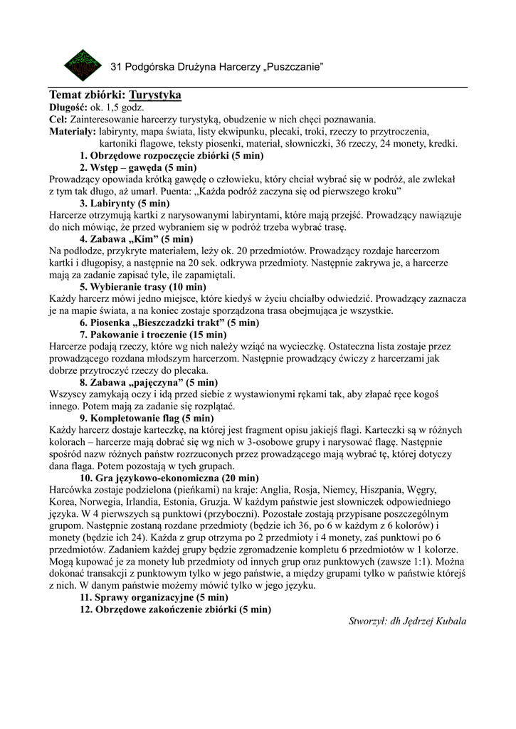 31 Podgórska Drużyna Harcerzy „Puszczanie” Temat zbiórki: Turystyka Długość: ok. 1,5 godz. Cel: Zainteresowanie harcerzy turystyką, obudzenie w nich chęci poznawania. Materiały: labirynty, mapa świata, listy ekwipunku, plecaki, troki, rzeczy to przytroczenia, kartoniki flagowe, teksty piosenki, materiał, słowniczki, 36 rzeczy, 24 monety, kredki. 1. Obrzędowe rozpoczęcie zbiórki (5 min) 2. Wstęp – gawęda (5 min) Prowadzący opowiada krótką gawędę o człowieku, który chciał wybrać się w podróż, ale zwlekał z tym tak długo, aż umarł. Puenta: „Każda podróż zaczyna się od pierwszego kroku” 3. Labirynty (5 min) Harcerze otrzymują kartki z narysowanymi labiryntami, które mają przejść. Prowadzący nawiązuje do nich mówiąc, że przed wybraniem się w podróż trzeba wybrać trasę. 4. Zabawa „Kim” (5 min) Na podłodze, przykryte materiałem, leży ok. 20 przedmiotów. Prowadzący rozdaje harcerzom kartki i długopisy, a następnie na 20 sek. odkrywa przedmioty. Następnie zakrywa je, a harcerze mają za zadanie zapisać tyle, ile zapamiętali. 5. Wybieranie trasy (10 min) Każdy harcerz mówi jedno miejsce, które kiedyś w życiu chciałby odwiedzić. Prowadzący zaznacza je na mapie świata, a na koniec zostaje sporządzona trasa obejmująca je wszystkie. 6. Piosenka „Bieszczadzki trakt” (5 min) 7. Pakowanie i troczenie (15 min) Harcerze podają rzeczy, które wg nich należy wziąć na wycieczkę. Ostateczna lista zostaje przez prowadzącego rozdana młodszym harcerzom. Następnie prowadzący ćwiczy z harcerzami jak dobrze przytroczyć rzeczy do plecaka. 8. Zabawa „pajęczyna” (5 min) Wszyscy zamykają oczy i idą przed siebie z wystawionymi rękami tak, aby złapać ręce kogoś innego. Potem mają za zadanie się rozplątać. 9. Kompletowanie flag (5 min) Każdy harcerz dostaje karteczkę, na której jest fragment opisu jakiejś flagi. Karteczki są w różnych kolorach – harcerze mają dobrać się wg nich w 3-osobowe grupy i narysować flagę. Następnie spośród nazw różnych państw rozrzuconych przez prowadzącego mają wybrać tę, której dotyczy dana flaga. Potem pozostają w tych grupach. 10. Gra językowo-ekonomiczna (20 min) Harcówka zostaje podzielona (pieńkami) na kraje: Anglia, Rosja, Niemcy, Hiszpania, Węgry, Korea, Norwegia, Irlandia, Estonia, Gruzja. W każdym państwie jest słowniczek odpowiedniego języka. W 4 pierwszych są punktowi (przyboczni). Pozostałe zostają przypisane poszczególnym grupom. Następnie zostaną rozdane przedmioty (będzie ich 36, po 6 w każdym z 6 kolorów) i monety (będzie ich 24). Każda z grup otrzyma po 2 przedmioty i 4 monety, zaś punktowi po 6 przedmiotów. Zadaniem każdej grupy będzie zgromadzenie kompletu 6 przedmiotów w 1 kolorze. Mogą kupować je za monety lub przedmioty od innych grup oraz punktowych (zawsze 1:1). Można dokonać transakcji z punktowym tylko w jego państwie, a między grupami tylko w państwie którejś z nich. W danym państwie możemy mówić tylko w jego języku. 11. Sprawy organizacyjne (5 min) 12. Obrzędowe zakończenie zbiórki (5 min) Stworzył: dh Jędrzej Kubala