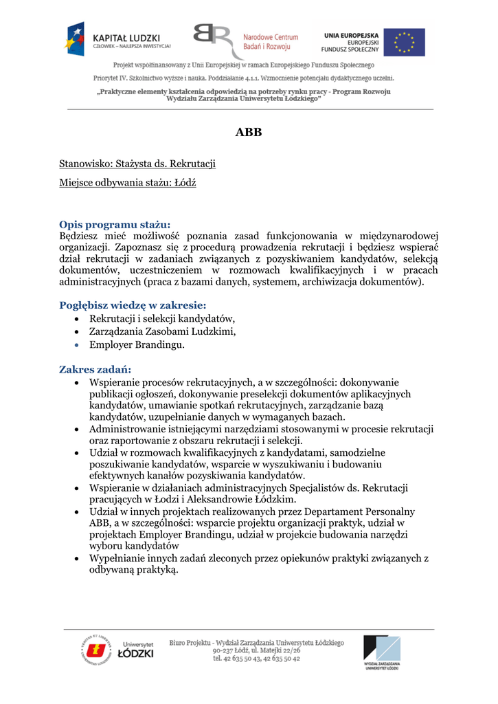 ABB Stanowisko: Stażysta ds. Rekrutacji Miejsce odbywania stażu: Łódź Opis programu stażu: Będziesz mieć możliwość poznania zasad funkcjonowania w międzynarodowej organizacji. Zapoznasz się z procedurą prowadzenia rekrutacji i będziesz wspierać dział rekrutacji w zadaniach związanych z pozyskiwaniem kandydatów, selekcją dokumentów, uczestniczeniem w rozmowach kwalifikacyjnych i w pracach administracyjnych (praca z bazami danych, systemem, archiwizacja dokumentów). Pogłębisz wiedzę w zakresie: Rekrutacji i selekcji kandydatów, Zarządzania Zasobami Ludzkimi, Employer Brandingu. Zakres zadań: Wspieranie procesów rekrutacyjnych, a w szczególności: dokonywanie publikacji ogłoszeń, dokonywanie preselekcji dokumentów aplikacyjnych kandydatów, umawianie spotkań rekrutacyjnych, zarządzanie bazą kandydatów, uzupełnianie danych w wymaganych bazach. Administrowanie istniejącymi narzędziami stosowanymi w procesie rekrutacji oraz raportowanie z obszaru rekrutacji i selekcji. Udział w rozmowach kwalifikacyjnych z kandydatami, samodzielne poszukiwanie kandydatów, wsparcie w wyszukiwaniu i budowaniu efektywnych kanałów pozyskiwania kandydatów. Wspieranie w działaniach administracyjnych Specjalistów ds. Rekrutacji pracujących w Łodzi i Aleksandrowie Łódzkim. Udział w innych projektach realizowanych przez Departament Personalny ABB, a w szczególności: wsparcie projektu organizacji praktyk, udział w projektach Employer Brandingu, udział w projekcie budowania narzędzi wyboru kandydatów Wypełnianie innych zadań zleconych przez opiekunów praktyki związanych z odbywaną praktyką.