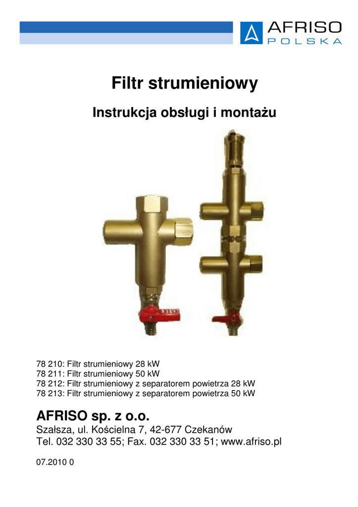 Kunda , Filtr strumieniowy Instrukcja obsługi i montażu 78 210: Filtr strumieniowy 28 kW 78 211: Filtr strumieniowy 50 kW 78 212: Filtr strumieniowy z separatorem powietrza 28 kW 78 213: Filtr strumieniowy z separatorem powietrza 50 kW AFRISO sp. z o.o. Szałsza, ul. Kościelna 7, 42-677 Czekanów Tel. 032 330 33 55; Fax. 032 330 33 51; www.afriso.pl 07.2010 0 Spis treści: 1. Objaśnienia do instrukcji obsługi ................................................................... 3 1.1. Znaki ostrzegawcze ................................................................................ 3 1.2. Wyjaśnienie znaczenia symboli .............................................................. 3 2. Zastosowanie ................................................................................................. 4 3. Budowa .......................................................................................................... 4 4. Zasada działania ............................................................................................ 5 5. Montaż ........................................................................................................... 6 6. Charakterystyki przepływu ............................................................................. 6 7. Konserwacja .................................................................................................. 9 7.1. Okresowa kontrola i konserwacja ........................................................... 9 8. Wyłączenie z eksploatacji, złomowanie ......................................................... 9 9. Gwarancja ...................................................................................................... 9 10. Prawa autorskie ........................................................................................... 9 11. Satysfakcja klienta ..................................................................................... 10 2 1. Objaśnienia do instrukcji obsługi Instrukcja obsługi jest ważnym elementem dostawy. Dlatego zalecamy: ► Przeczytać instrukcję obsługi przed instalacją urządzenia ► Przechowywać instrukcję przez cały czas eksploatacji urządzenia ► Przekazać instrukcję każdemu następnemu posiadaczowi lub użytkownikowi urządzenia. 1.1. Znaki ostrzegawcze OSTRZEŻENIE Określa rodzaj i źródło zagrożenia. ► Opisuje co zrobić, by uniknąć zagrożenia. Zagrożenia mają 3 poziomy: Zagrożenie Niebezpieczeństwo Ostrzeżenie Uwaga 1.2. ● TEXT Możliwe niebezpieczeństwo! Nieprzestrzeganie może spowodować śmierć lub poważne uszkodzenia ciała. Niebezpieczna sytuacja! Nieprzestrzeganie może spowodować lekkie lub średnie uszkodzenie ciała albo szkody materialne. Wyjaśnienie znaczenia symboli Symbol ► 1. Znaczenie Bezpośrednie niebezpieczeństwo! Nieprzestrzeganie grozi śmiercią lub poważnym uszkodzeniem ciała. Znaczenie Wykonanie działania Działanie w jednym kroku Działanie w kilku krokach Wynik działania Wyliczanie Wskazanie na wyświetlaczu 3 2. Zastosowanie Filtr strumieniowy stosowany jest do usuwania wszelkich stałych zanieczyszczeń mogących znajdować się w instalacji grzewczej lub chłodzącej, tj. piasku, opiłków, a przede wszystkim drobnych cząsteczek magnetytu i hematytu, powstających w wyniku procesów utleniania i powodujących powstawanie szkodliwych osadów na wszystkich elementach wewnętrznych instalacji. Cząsteczek tych nie jest w stanie usunąć zwykły filtr siatkowy. Filtr strumieniowy z separatorem powietrza dodatkowo usuwa powietrze rozpuszczone w wodzie w instalacji. Zanieczyszczenia oraz powietrze wpływają negatywnie na stan całej instalacji prowadząc do spadku jej wydajności, a także powodując uszkodzenia armatury. Filtry strumieniowe przeznaczone są do instalacji grzewczych, chłodniczych, ogrzewania podłogowego, układów solarnych o mocy do 50 kW. Można je również stosować do usuwania kamienia w obiegach cyrkulacyjnych ciepłej wody użytkowej. W przypadku gdy moc instalacji przekracza 50 kW filtry mogą być łączone równolegle w grupy. 3. Budowa Korpus filtra strumieniowego wykonany jest z mosiądzu. Zanieczyszczona woda kotłowa doprowadzana jest do filtra przez przyłącze z gwintem wewnętrznym ¾”. Oczyszczona woda odprowadzana jest przez przyłącze z gwintem wewnętrznym 1” w górnej części filtra. Filtr strumieniowy 4 Filtr strumieniowy z separatorem powietrza W przypadku filtra strumieniowego z separatorem powietrza, w górnej części korpusu zainstalowany jest dodatkowy moduł odpowiedzialny za oddzielanie cząstek rozpuszczonego w wodzie powietrza. Korpus separatora zakończony jest na samej górze odpowietrznikiem automatycznym, który usuwa oddzielone powietrze z instalacji. Na samym dole korpusu filtra strumieniowego znajduje się zawór spustowy, który służy do okresowego usuwania zebranych zanieczyszczeń. Urządzenie dostarczane jest razem ze specjalną izolacją piankową. 4. Zasada działania Zanieczyszczona woda wpływa do filtra przez rurę dolotową i uderza w ściankę powodując rozbicie większych cząstek zanieczyszczeń. Następnie woda wprowadzana jest w ruch turbulentny i wpada do korpusu filtra. Tam wprowadzana jest w ruch wirowy. Cięższe niż woda cząsteczki pod wpływem siły odśrodkowej wypychane są na zewnątrz głównego strumienia wody i opadają na dno, gdzie są zbierane w najniższej strefie filtra. W przypadku wersji z separatorem powietrza, woda zawierająca powietrze płynie do górnej części korpusu. W wyniku ruchu wirowego, lżejsze od wody pęcherzyki powietrza zostają oddzielone i gromadzą się w najwyższej części korpusu, skąd przy pomocy odpowietrznika zostają usunięte z instalacji. Oczyszczona i pozbawiona powietrza woda kierowana jest do wylotu znajdującego się w górnej części filtra. Filtr strumieniowy charakteryzuje się wysoką sprawnością usuwania zanieczyszczeń stałych oraz małym spadkiem ciśnienia. Zasada dzi