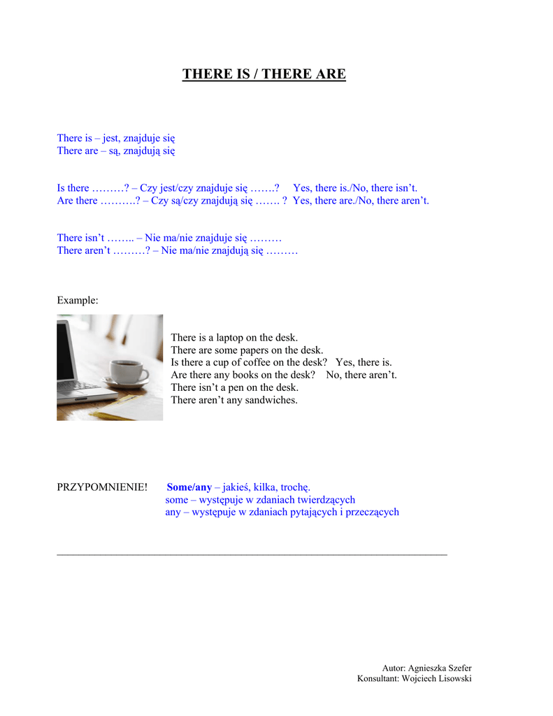 THERE IS / THERE ARE There is – jest, znajduje się There are – są, znajdują się Is there ………? – Czy jest/czy znajduje się …….? Yes, there is./No, there isn’t. Are there ……….? – Czy są/czy znajdują się ……. ? Yes, there are./No, there aren’t. There isn’t …….. – Nie ma/nie znajduje się ……… There aren’t ………? – Nie ma/nie znajdują się ……… Example: There is a laptop on the desk. There are some papers on the desk. Is there a cup of coffee on the desk? Yes, there is. Are there any books on the desk? No, there aren’t. There isn’t a pen on the desk. There aren’t any sandwiches. PRZYPOMNIENIE! Some/any – jakieś, kilka, trochę. some – występuje w zdaniach twierdzących any – występuje w zdaniach pytających i przeczących ________________________________________________________________________ Autor: Agnieszka Szefer Konsultant: Wojciech Lisowski 1. Describe the picture in 5 sentences. What is there in the kitchen? (Opisz zdjęcie w pięciu zdaniach. Co znajduje się w kuchni?) 1. ………………………………................ 2. ………………………………................ 3. ………………………………………… 4. ………………………………………… 5. ………………………………………… 2. Complete the sentences with there is/there are. (Uzupełnij zdania za pomocą there is/there are.) 1. ………… a red dress in my plastic bag. 2. ………… some bananas in the fridge. 3. ………… any mineral water left? 4. ………… two books under the table. 5. ………… any books on my shelf. 6. ………… a brown leather jacket in your suitcase? 7. ………… nice gloves in my bag. 8. ………… a pair of jeans in your wardrobe? 9. ………… any people at the bus stop? 10. ………… only one woman at the station. 3. Complete the text with there is/there are. (Uzupełnij tekst za pomocą there is/there are.) Pam: I’m starving. Let’s make something to eat. Beth: Can’t we wait for mum? She’ll be back in an hour. Pam: An hour? I’m sorry I can’t! Beth: ………… any food in the kitchen? Pam: Let me see. ……….. a tin of peas and three tomatoes in the basket in the cupboard. Beth: ………… any bread and butter? Pam: No, ………… Beth: I can’t make any sandwiches for you if ………… any bread. Pam: No. ................. any bread but …………. some green olives. Autor: Agnieszka Szefer Konsultant: Wojciech Lisowski Beth: ……………. a lettuce? Pam: Yes, …………… So we could have a salad. Beth: Right. But we also need a dressing for the salad. Pam: I’m afraid …………… any salad dressings. Beth: Hmm. …………. any olive oil and vinegar? I can make some sauce myself. Pam: Yes, ………….. So, come to the kitchen and help me with the salad. Beth: In a while! I’ll only finish the task I’ve started. Pam: You are very clever. You want to pass the time and wait for mum. Autor: Agnieszka Szefer Konsultant: Wojciech Lisowski