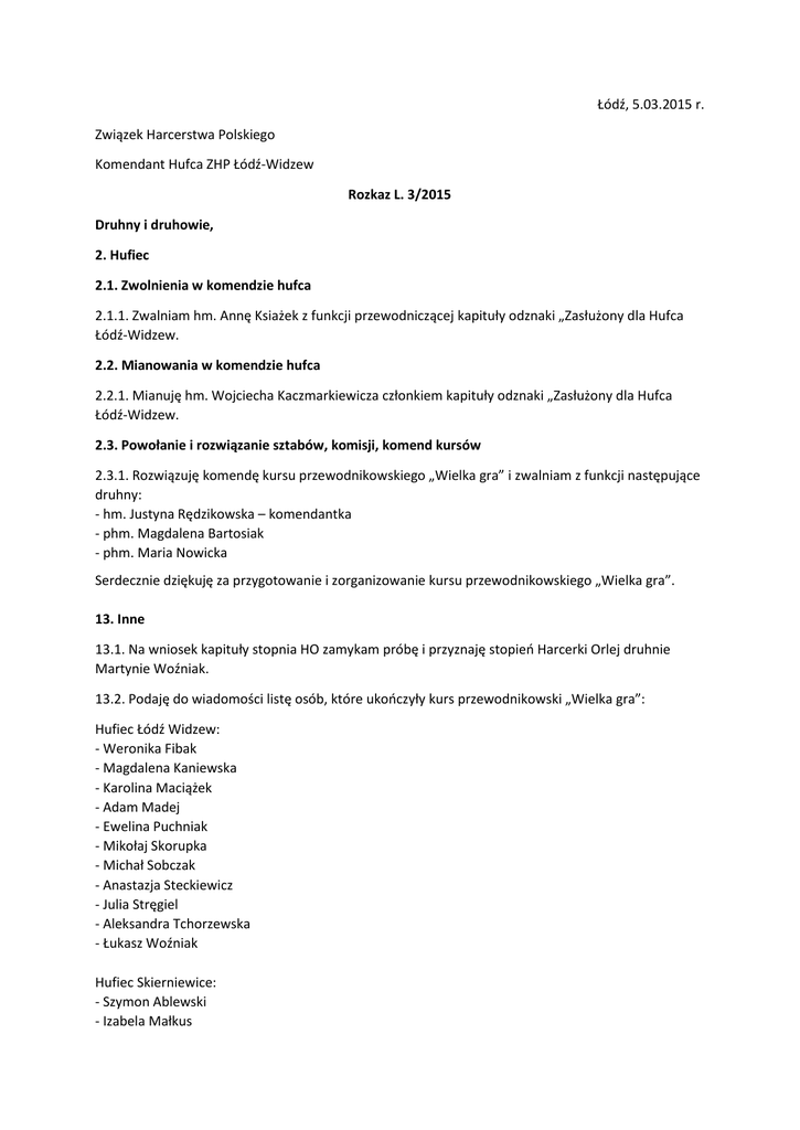 Łódź, 5.03.2015 r. Związek Harcerstwa Polskiego Komendant Hufca ZHP Łódź-Widzew Rozkaz L. 3/2015 Druhny i druhowie, 2. Hufiec 2.1. Zwolnienia w komendzie hufca 2.1.1. Zwalniam hm. Annę Ksiażek z funkcji przewodniczącej kapituły odznaki „Zasłużony dla Hufca Łódź-Widzew. 2.2. Mianowania w komendzie hufca 2.2.1. Mianuję hm. Wojciecha Kaczmarkiewicza członkiem kapituły odznaki „Zasłużony dla Hufca Łódź-Widzew. 2.3. Powołanie i rozwiązanie sztabów, komisji, komend kursów 2.3.1. Rozwiązuję komendę kursu przewodnikowskiego „Wielka gra” i zwalniam z funkcji następujące druhny: - hm. Justyna Rędzikowska – komendantka - phm. Magdalena Bartosiak - phm. Maria Nowicka Serdecznie dziękuję za przygotowanie i zorganizowanie kursu przewodnikowskiego „Wielka gra”. 13. Inne 13.1. Na wniosek kapituły stopnia HO zamykam próbę i przyznaję stopień Harcerki Orlej druhnie Martynie Woźniak. 13.2. Podaję do wiadomości listę osób, które ukończyły kurs przewodnikowski „Wielka gra”: Hufiec Łódź Widzew: - Weronika Fibak - Magdalena Kaniewska - Karolina Maciążek - Adam Madej - Ewelina Puchniak - Mikołaj Skorupka - Michał Sobczak - Anastazja Steckiewicz - Julia Stręgiel - Aleksandra Tchorzewska - Łukasz Woźniak Hufiec Skierniewice: - Szymon Ablewski - Izabela Małkus - Bartłomiej Wach - Marta Zygmunt Hufiec Piotrków Trybunalski: - Szymon Markowiak Hufiec Sieradz: - Patrycja Kurowska 14. Sprostowania 14.1. Informuję, że w rozkazie L. 13/2014 z dnia 5.12.2014 r. w punkcie 4.2. błędnie podano przynależność Kręgu Instruktorskiego „Achtung!”. Było: przy Widzewskim Szczepie Harcerskim „Flo”, powinno być: przy hufcu. Czuwaj! phm. Michał Adamiak