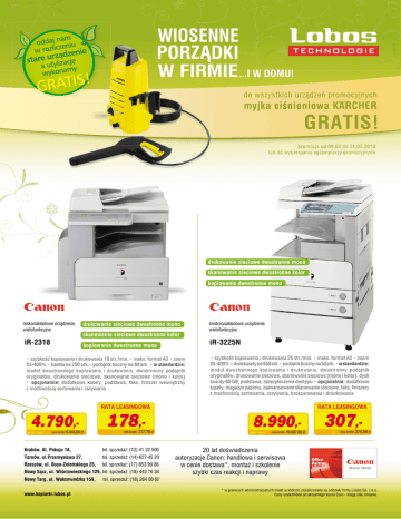 promocja od 09.04 do 31.05.2010 lub do wyczerpania egzemplarzy promocyjnych drukowanie sieciowe dwustronne mono skanowanie sieciowe dwustronne kolor kopiowanie dwustronne mono niskonakładowe urządzenie wielofunkcyjne drukowanie sieciowe dwustronne mono średnionakładowe urządzenie wielofunkcyjne skanowanie sieciowe dwustronne kolor iR-2318 iR-3225N kopiowanie dwustronne mono • szybkoœæ kopiowania i drukowania 18 str./min. • maks. format A3 • zoom 25-400% • kaseta na 250 ark.• podajnik boczny na 80 ark. • w standardzie: moduł dwustronnego kopiowania i drukowania , dwustronny podajnik orygina³ów, drukowanie sieciowe, skanowanie sieciowe (mono i kolor) • opcjonalnie: dodatkowe kasety, podstawa, faks, finiszer wewnętrzny z mo¿liwoœci¹ sortowania i zszywania • szybkoœæ kopiowania i drukowania 25 str./min. • maks. format A3 • zoom 25-400% • dwie kasety po 550 ark.• podajnik boczny na 50 ark. • w standardzie: moduł dwustronnego kopiowania i drukowania , dwustronny podajnik orygina³ów, drukowanie sieciowe, skanowanie sieciowe (mono i kolor), dysk twardy 60 GB, podstawa, zabezpieczenie dostępu • opcjonalnie: dodatkowe kasety, magazyn papieru, zaawansowane skanowanie sieciowe, faks, finiszery z mo¿liwoœci¹ sortowania, zszywania, broszurowania i dziurkowania RATA LEASINGOWA 4.790,cena brutto: 5.843,80 z³ 178,rata brutto: 217,16 z³ Kraków, Al. Pokoju 1A, tel. sprzedaż: (12) 41 32 500 Tarnów, ul.Przemysłowa 27, tel. sprzedaż: (14) 627 45 20 Rzeszów, ul. Boya-Żeleńskiego 25, tel. sprzedaż: (17) 853 99 88 Nowy Sącz, ul. Wiśniowieckiego 129, tel. sprzedaż: (18) 443 76 34 Nowy Targ, ul. Waksmundzka 159, www.kopiarki.lobos.pl RATA LEASINGOWA 8.990,cena brutto: 10.967,80 z³ 307,rata brutto: 374,54 z³ 20 lat doświadczenia autoryzacje Canon: handlowa i serwisowa w cenie dostawa*, montaż i szkolenie szybki czas reakcji i naprawy tel. sprzedaż: (18) 264 00 62 * w granicach administracyjnych miast w których zlokalizowane są oddziały firmy Lobos Sp. z o.o. Ceny uzależnione od aktualnego kursu Euro - mogą ulec zmianie. które spełnią wymagania nawet najbardziej wymagających Klientów. Najważniejsze cechy nowej serii: bardzo szeroki zakres oferowanych prędkości druku (od 20 do 45 str./min) w standardzie moduł drukowania i kopiowania dwustronnego (duplex) urządzenia fabrycznie gotowe do pracy w sieci komputerowej prosta obsługa w języku polskim w dotykowego panelu streowania LCD wysyłania na serwer i do e-maila z obsługą formatu PDF możliwość instalacji dodatkowych opcji zwiększających funkcjonalność, np. do pamięci USB jeszcze niższe koszty eksploatacji - urządzenia oferowane w pakiecie z Umową Serwisową Więcej szczegółów w salonach sprzedaży lub na: kopiowanie dwustronne kolor średnionakładowe, kolorowe urządzenie wielofunkcyjne drukowanie sieciowe dwustronne kolor skanowanie sieciowe dwustronne kolor iRC-2380i • szybkość kopiowania i drukowania 23 str./min. mono i kolor • maksymalny format A3 • zakres zoom 25-400% • dwie kasety po 550 arkuszy • podajnik boczny na 50 arkuszy • w standardzie: drukowanie sieciowe, zaawansowane skanowanie sieciowe do pliku, e-maila, na serwer, obsługa PDF, moduł kopiowania i drukowania dwustronnego, dwustronny podajnik oryginałów, podstawa, dysk twardy 80GB, zabezpieczenie dostępu • opcjonalnie: dodatkowe kasety, faks, finiszery z mo¿liwoœci¹ sortowania, zszywania, broszurowania i dziurkowania RATA LEASINGOWA 12.990,cena brutto: 15.847,80 z³ 444,rata brutto: 541,68 z³ UMOWA SERWISOWA ZALETY LEASINGU: · okres trwania umowy serwisowej to minimum 3 lata lub do wykonania określonego nakładu, · w ramach stałej zryczałtowanej opłaty miesiecznej zapewniamy odpowiedni limit kopii i wydruków oraz pełną obsługę serwisową urządzenia wraz z bezpłatnymi dostawami materiałów eksploatacyjnych, · w ramach umowy serwisowej zapewniamy bardzo krótki czas reakcji serwisu oraz w razie poważnej awarii - urządzenie zastępcze, · umowa serwisowa zapewnia obniżenie kosztów eksploatacji urządzeń oraz bardzo wygodne i przejrzyste ich planowanie. · wszystkie formalności załatwiamy do 2 dni, tak więc od razu można korzystać z zaawansowanych technologii bez angażowania własnych środków, · spłata leasingu odbywa się w równych ratach przy stałej stopie procentowej, co ułatwia planowanie wydatków, · do zawarcia umowy wystarczą tylko dokumenty założycielskie firmy i dwa dowody tożsamości - nie są potrzebne dokumenty PIT, CIT, zaświadczenia z ZUS i US, · leasing wpływa na obniżenie podstawy opodatkowania, ponieważ wszystkie raty leasingowe stanowią koszt uzyskania przychodu. przedstawione raty: leasing optymalny na okres 36 miesięcy i bez opłaty wstępnej
