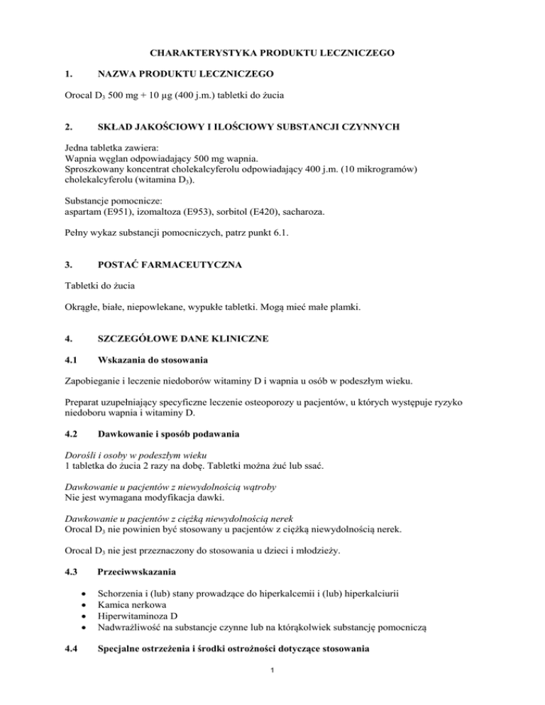 CHARAKTERYSTYKA PRODUKTU LECZNICZEGO 1. NAZWA PRODUKTU LECZNICZEGO Orocal D3 500 mg + 10 µg (400 j.m.) tabletki do żucia SKŁAD JAKOŚCIOWY I ILOŚCIOWY SUBSTANCJI CZYNNYCH 2. Jedna tabletka zawiera: Wapnia węglan odpowiadający 500 mg wapnia. Sproszkowany koncentrat cholekalcyferolu odpowiadający 400 j.m. (10 mikrogramów) cholekalcyferolu (witamina D3). Substancje pomocnicze: aspartam (E951), izomaltoza (E953), sorbitol (E420), sacharoza. Pełny wykaz substancji pomocniczych, patrz punkt 6.1. POSTAĆ FARMACEUTYCZNA 3. Tabletki do żucia Okrągłe, białe, niepowlekane, wypukłe tabletki. Mogą mieć małe plamki. 4. SZCZEGÓŁOWE DANE KLINICZNE 4.1 Wskazania do stosowania Zapobieganie i leczenie niedoborów witaminy D i wapnia u osób w podeszłym wieku. Preparat uzupełniający specyficzne leczenie osteoporozy u pacjentów, u których występuje ryzyko niedoboru wapnia i witaminy D. 4.2 Dawkowanie i sposób podawania Dorośli i osoby w podeszłym wieku 1 tabletka do żucia 2 razy na dobę. Tabletki można żuć lub ssać. Dawkowanie u pacjentów z niewydolnością wątroby Nie jest wymagana modyfikacja dawki. Dawkowanie u pacjentów z ciężką niewydolnością nerek Orocal D3 nie powinien być stosowany u pacjentów z ciężką niewydolnością nerek. Orocal D3 nie jest przeznaczony do stosowania u dzieci i młodzieży. 4.3 Przeciwwskazania • • • • 4.4 Schorzenia i (lub) stany prowadzące do hiperkalcemii i (lub) hiperkalciurii Kamica nerkowa Hiperwitaminoza D Nadwrażliwość na substancje czynne lub na którąkolwiek substancję pomocniczą Specjalne ostrzeżenia i środki ostrożności dotyczące stosowania 1 W czasie długotrwałego leczenia należy monitorować stężenie wapnia w surowicy krwi oraz czynność nerek poprzez badanie stężenia kreatyniny w surowicy. Monitorowanie jest szczególnie ważne u osób w podeszłym wieku leczonych jednocześnie glikozydami nasercowymi lub lekami moczopędnymi (patrz punkt 4.5) i u pacjentów z tendencją do tworzenia się kamieni. W przypadku hiperkalcemii lub objawów upośledzenia czynności nerek należy zmniejszyć dawkę lub przerwać leczenie. Witaminę D należy stosować z ostrożnością u pacjentów z zaburzeniami czynności nerek, monitorując wpływ na stężenie wapnia i fosforanów. Należy uwzględnić ryzyko zwapnienia tkanek miękkich. U pacjentów z ciężką niewydolnością nerek, metabolizm witaminy D w postaci kalcyferolu nie jest prawidłowy; należy stosować inne postaci witaminy D (patrz punkt 4.3). Orocal D3 powinien być stosowany ostrożnie u chorych na sarkoidozę, z powodu ryzyka zwiększenia metabolizmu witaminy D do jej aktywnych metabolitów. U tych pacjentów należy monitorować stężenie wapnia w surowicy i w moczu. Orocal D3 powinno się stosować ostrożnie u unieruchomionych pacjentów z osteoporozą,ze względu na ryzyko wystąpienia hiperkalcemii. Zawartość witaminy D (400 j.m.) w preparacie Orocal D3 należy uwzględniać podczas przepisywania innych leków zawierających witaminę D. Dodatkowe dawki witaminy D i wapnia powinny być stosowane pod ścisłym nadzorem lekarza. W takich przypadkach konieczne jest częste badanie stężenia wapnia w surowicy i wydalania wapnia w moczu. Zespół mleczno-alkaliczny (zespół Burnetta), tj. hiperkalcemia, zasadowica i niewydolność nerek, może rozwinąć się, gdy wraz z łatwo wchłanialnymi lekami zasadowymi przyjmowane są duże ilości wapnia. Zwykle nie zaleca się jednoczesnego stosowania z tetracyklinami lub chinolonami. W przypadku równoczesnego stosowania należy podjąć odpowiednie środki ostrożności (patrz punkt 4.5). Orocal D3 zawiera aspartam (E951, źródło fenyloalaniny). Może być szkodliwy dla pacjentów z fenyloketonurią. Orocal D3 zawiera sorbitol (E420), izomaltozę (E953) i sacharozę. Pacjenci z rzadkimi wrodzonymi zaburzeniami przebiegającymi z nietolerancją fruktozy, złym wchłanianiem glukozy-galaktozy lub z niedoborem sacharazy-izomaltazy nie powinni stosować tego leku. 4.5 Interakcje z innymi produktami leczniczymi i inne rodzaje interakcji Tiazydowe leki moczopędne zmniejszają wydalanie wapnia w moczu. Z powodu ryzyka wystąpienia hiperkalcemii powinno się regularnie badać stężenie wapnia w surowicy w przypadku jednoczesnego stosowania tiazydowych leków moczopędnych. Węglan wapnia może zaburzać wchłanianie stosowanych jednocześnie preparatów tetracyklin. Dlatego tetracykliny powinny być podawane co najmniej 2 godziny przed lub 4 do 6 godzin po doustnym przyjęciu wapnia. Hiperkalcemia może zwiększyć toksyczność glikozydów nasercowych w czasie stosowania wapnia i witaminy D. U tych pacjentów należy kontrolować zapis EKG i stężenie wapnia w surowicy. Jeśli stosuje się jednocześnie bifosfoniany, powinny być one podawane co najmniej 1 godzinę przed przyjęciem preparatu Orocal D3, ponieważ ich wchłanianie w przewodzie pokarmowym może ulec zmniejszeniu. Skuteczność lewotyroksyny może być zmniejszona przy równoczesnym stosowaniu wapnia z powodu zmniejszonego wchłaniania lewotyroksyny. Należy zachować, co najmniej 4 godzinną przerwę podczas stosowania wapnia i lewotyroksyny. 2 Wchłanianie antybiotyków chinolonowych może byś upośledzone, przy równoczesnym stosowaniu z wapniem. Antybiotyki chinolonowe należy przyjmować 2 godziny przed lub 6 godzin po przyjęciu wapnia. 4.6 Wpływ na płodność, ciążę i laktację Ciąża W czasie ciąży dobowe spożycie nie powinno przekraczać 1500 mg wapnia i 600 j.m. witaminy D. Badania na zwierzętach wykazują toksyczny wpływ dużych dawek witaminy D na rozrodczość. U kobiet w ciąży powinno się unikać przedawkowania wapnia i witaminy D, ponieważ trwała hiperkalcemia była powiązana z niepożądanym działaniem na rozwijający się płód. Nie ma danych świadczących o teratogennym działaniu witaminy D w dawkach leczniczych u ludzi. Orocal D3 może być stosowany w ciąży tylko w przypadku niedoboró