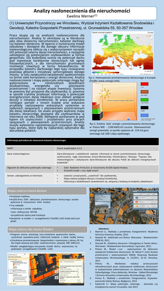 Analizy nasłonecznienia dla nieruchomości Ewelina Werner(1) (1) Uniwersytet Przyrodniczy we Wrocławiu, Wydział Inżynierii Kształtowania Środowiska i Geodezji, Katedra Gospodarki Przestrzennej, ul. Grunwaldzka 55, 50-357 Wrocław Praca skupia się na analizach nasłonecznienia dla nieruchomości. Analizy te określane są w literaturze jako atlas słoneczny nieruchomości, kataster dachowy czy kataster słoneczny. W oparciu o numeryczny model zabudowy i dostępne dla danego obszaru informacje meteorologiczne oblicza się z wykorzystaniem narzędzi GIS potencjał solarny danej nieruchomości, a następnie udostępnia się potencjalnym użytkownikom w formie geoportalu. Dla budynków ocenia się potencjał dachu pod inwestycje korektorów słonecznych lub ogniw fotowoltaicznych, a dla nieruchomości gruntowych możliwość inwestycji w farmy fotowoltaiczne. W przypadku katastru dachowego tego typu rozwiązania powstają głównie z inicjatywy samorządowej danego miasta, w celu zwiększenia świadomość społeczeństwa na temat zalet korzystania z energii słonecznej. Analiza nasłonecznienie i mapy potencjału solarnego mogą być wykorzystane w różnorodnych dziedzinach (budownictwo, energetyka czy planowanie przestrzenne) i na różnym etapie inwestycji. Systemy te powinny być przyjazne dla użytkownika, tj. powinny w sposób czytelny przekazać informację o potencjale energetycznym danej lokalizacji oraz ułatwić podjęcie decyzji o instalacji korektorów. W pracy porównano istniejące portale z innych krajów oraz wskazano przykłady zastosowania wskazanych systemów w zadaniach związanych z planowaniem przestrzennym dla danej lokalizacji. Do analiz przyjęto wybrane mapy katastru słonecznego dostępne dla użytkowników w Internecie od roku 2008. Następnie porównano je pod kątem ich użyteczności i przydatności przy pracach związanych z planowaniem przestrzennym. Analizy służyły wyłonieniu najistotniejszych rozwiązań dla tego typu portalu, które były by najbardziej optymalne dla warunków polskich. Rys 1. Intensywność promieniowania słonecznego w Europie [Źródło: www.solargis.info] Rys 2. Średnia ilość energii z promieniowania słonecznego w Polsce 900 - 1100 kWh/m2 rocznie. Równowartość energii powstałej w wyniku spalania ok. 110 m3 gazu ziemnego lub 100 l oleju opałowego. Informacje potrzebne do stworzenia katastru słonecznego: NMPT Znane współrzędne X,Y,Z Dane meteorologiczne Dane klimatyczne z wieloletnich zapisów informacji na temat promieniowania słonecznego, zachmurzenia, mgły. Internetowa strona Ministerstwa Infrastruktury i Rozwoju "Typowe lata meteorologiczne i statystyczne dane klimatyczne dla obszaru Polski do obliczeń energetycznych budynków" Algorytm do obliczenia potencjału solarnego • • Solar Radiation Firmy Esri, w rozszerzeniu ArcGIS Saptial Analyst, GrassGIS model r.sun, bądź innych Serwer, udostępnienie w internecie • • • Łatwość i przejrzystość, „czytelność” dla użytkownika, Mapa ułatwia podjęcie decyzji o instalacji korektorów, Informacja o dodatkowych zezwoleniach np. związaną z budową na budynku zabytkowym Mapa solarna miasta Boston •Inicjatywa rządowa, •ArcGIS firmy ESRI - obliczenie promieniowania słonecznego zostało wyliczone w rozszerzeniu Solar Analyst •Trzy nakładki: •informacje o strefie zabytków, •sieci elektrycznej NSTAR, •przydatności dachu pod instalacje. •Geoportal w modelu o szczegółowości CityGML LoD1 każdy dach jest płaski. Mapa solarna dla miasta Wiedeń •Program ocenia orientację oraz nachylenie powierzchni dachu, zacienienie wywołane przez roślinność, budynki, a także rzeźbę terenu. •Uśrednione promieniowanie bezpośrednie i rozproszone z okresu 18 lat, Na mapie ukazane jest tylko nasłonecznienie powyżej 900 kWh/m2. •Model uwzględniający rzeczywisty kształt dachu, wyznaczony na podstawie szczegółowości CityGML LoD2. 1. 2. 3. 4. 5. 6. 7. Literatura: Marmol U., Wykłady z przedmiotu Fotogrametria' Akademia Górniczo-Hutnicza, Kraków, 2013 Nowicki M.: Nadchodzi era Słońca. Warszawa : Wydawnictwo PWN SA, 2012. Oszczak W., Kolektory słoneczne i fotoogniwa w Twoim domu. Warszawa : Wydawnictwo Komunikacji i Łączności, 2012. Pietras M., Moduł r.sun - wykorzystanie do obliczenia wydajności kolektorów słonecznych. W: Netzel P. (red.) Analizy przestrzenne z wykorzystaniem GRASS, Rozprawy Naukowe Uniwersytetu Wrocławskiego, nr 15/2011, 25-33. Wrocław, 2011 Pietras M., Możliwości redukcji zanieczyszczeń atmosferycznych przez zastosowanie kolektorów słonecznych w budownictwie jednorodzinnym na obszarze Województwa Dolnośląskiego. Praca doktorska, Wrocław : Zakład Klimatologii i Ochrony Atmosfery Uniwersytetu Wrocławskiego, 2012 Preuss R., Wykłady z przedmiotu Fotogrametria, Kujawskopomorska Szkoła Wyższa, Bydgoszcz, 2012 Sukiennik K.: Mapy potencjału solarnego - ekomoda czy energetyczna szansa? ArcanaGis, lato 2013