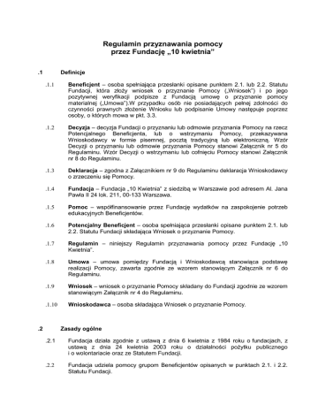 Regulamin przyznawania pomocy przez Fundację „10 kwietnia” .1 Definicje .1.1 Beneficjent – osoba spełniająca przesłanki opisane punktem 2.1. lub 2.2. Statutu Fundacji, która złoży wniosek o przyznanie Pomocy („Wniosek”) i po jego pozytywnej weryfikacji podpisze z Fundacją umowę o przyznanie pomocy materialnej („Umowa”).W przypadku osób nie posiadających pełnej zdolności do czynności prawnych złożenie Wniosku lub podpisanie Umowy następuje poprzez osoby, o których mowa w pkt. 3.3. .1.2 Decyzja – decyzja Fundacji o przyznaniu lub odmowie przyznania Pomocy na rzecz Potencjalnego Beneficjenta, lub o wstrzymaniu Pomocy, przekazywana Wnioskodawcy w formie pisemnej, pocztą tradycyjną lub elektroniczną. Wzór Decyzji o przyznaniu lub odmowie przyznania Pomocy stanowi Załącznik nr 5 do Regulaminu. Wzór Decyzji o wstrzymaniu lub cofnięciu Pomocy stanowi Załącznik nr 8 do Regulaminu. .1.3 Deklaracja – zgodna z Załącznikiem nr 9 do Regulaminu deklaracja Wnioskodawcy o zrzeczeniu się Pomocy. .1.4 Fundacja – Fundacja „10 Kwietnia” z siedzibą w Warszawie pod adresem Al. Jana Pawła II 24 lok. 211, 00-133 Warszawa. .1.5 Pomoc – współfinansowanie przez Fundację wydatków na zaspokojenie potrzeb edukacyjnych Beneficjentów. .1.6 Potencjalny Beneficjent – osoba spełniająca przesłanki opisane punktem 2.1. lub 2.2. Statutu Fundacji składająca Wniosek o przyznanie Pomocy. .1.7 Regulamin – niniejszy Regulamin przyznawania pomocy przez Fundację „10 Kwietnia”. .1.8 Umowa – umowa pomiędzy Fundacją i Wnioskodawcą stanowiąca podstawę realizacji Pomocy, zawarta zgodnie ze wzorem stanowiącym Załącznik nr 6 do Regulaminu. .1.9 Wniosek – wniosek o przyznanie Pomocy składany do Fundacji zgodnie ze wzorem stanowiącym Załącznik nr 4 do Regulaminu. .1.10 Wnioskodawca – osoba składająca Wniosek o przyznanie Pomocy. .2 Zasady ogólne .2.1 Fundacja działa zgodnie z ustawą z dnia 6 kwietnia z 1984 roku o fundacjach, z ustawą z dnia 24 kwietnia 2003 roku o działalności pożytku publicznego i o wolontariacie oraz ze Statutem Fundacji. .2.2 Fundacja udziela pomocy grupom Beneficjentów opisanych w punktach 2.1. i 2.2. Statutu Fundacji. .2.3 Zgodnie z pkt 2.3 Statutu Fundacji, celem Fundacji jest zabezpieczenie potrzeb edukacyjnych Beneficjentów. .2.4 Niniejszy Regulamin określa szczegółowe zasady przyznawania pomocy w formie współfinansowania wydatków na zaspokojenie potrzeb edukacyjnych Beneficjentów („Pomoc”). .2.5 Pomoc obejmuje współfinansowanie następujących kosztów związanych z nauką i edukacją beneficjentów: .2.5.1 czesne (przedszkola, szkoły), .2.5.2 koszty opieki nad dziećmi w wieku do 3 lat, .2.5.3 opłaty za internat (w sytuacji, gdy beneficjent pobiera naukę w miejscowości innej niż adres zameldowania), .2.5.4 koszty podróży i pobytu na stypendiach zagranicznych, .2.5.5 opłaty za zajęcia dodatkowe, w tym kursy, naukę języków obcych, zajęcia sportowe i artystyczne .2.5.6 koszty uczestnictwa w kołach naukowych i kołach zainteresowań, .2.5.7 koszty materiałów i pomocy naukowych, w tym podręczników, .2.5.8 koszty wyjazdów, obozów połączonych z nauką, .2.5.9 koszty dojazdów do szkoły i na dodatkowe zajęcia edukacyjne, .2.5.10 koszty terapii wspierających radzenie sobie z emocjami (ADHD, terapia sensoryczna itp.), .2.5.11 koszty pomocy logopedycznej, .2.5.12 koszty związane z pomocą w razie trwałej niemożności uczestniczenia w zajęciach szkolnych (choroba, wypadek) – indywidualny tryb nauki, .2.5.13 składki na Komitet Rodzicielski, .2.5.14 koszty tutoringu, .2.5.15 koszty doradztwa edukacyjnego, .2.6 Fundacja będzie współfinansować do 80% kosztów określonych w punkcie 2.5., przy czym maksymalne roczne limity pomocy ze strony Fundacji na rzecz jednego beneficjenta określa Załącznik nr 1. Załącznik ten określa także próg dochodu na osobę w gospodarstwie domowym Potencjalnego Beneficjenta, po przekroczeniu którego Pomoc nie będzie przyznawana. .2.7 Maksymalne roczne limity pomocy oraz próg dochodowy podlegają dorocznemu przeglądowi i ewentualnej waloryzacji przez Radę Fundacji (zmiana Załącznika nr 1 następuje w drodze uchwały Rady). .2.8 Koszty tutoringu i doradztwa edukacyjnego (punkty 2.5.14. i 2.5.15. powyżej) nie wliczają się do limitów opisanych w punkcie 2.6. i są w całości pokrywane przez Fundację, przy zastrzeżeniu, że są organizowane przez Fundację. Pomoc ta nie jest ograniczona progiem dochodowym z Załącznika nr 1. 2 .2.9 Fundacja może na umotywowany wniosek Beneficjenta przekazać mu dodatkową darowiznę w gotówce na pokrycie podatku dochodowego należnego od niego w związku z uzyskaniem przez niego Pomocy, przy czym wartość dodatkowej darowizny na ten cel nie może przekroczyć 20% wartości Pomocy, niezależnie od stawki podatku dochodowego płaconej przez Beneficjenta. .2.10 Fundacja będzie ponadto pomagać w organizowaniu dla studiujących Beneficjentów praktyk i staży. Pomoc tego rodzaju nie jest ograniczona limitami oraz progiem dochodowym przewidzianymi w Załączniku nr 1. .2.11 Regulamin nie stanowi oferty ani przyrzeczenia publicznego udzielenia indywidualnej pomocy finansowej jakiejkolwiek osobie i nie może być podstawą podnoszenia roszczeń wobec Fundacji. .2.12 Wnioskodawcy, najpóźniej w momencie składania Wniosku, zobowiązani są do wyrażenia zgody na gromadzenie i przetwarzanie przez Fundację ich danych osobowych na potrzeby realizacji jej celów statutowych, a także do wypełnienia kwestionariusza osobowego Potencjalnego beneficjenta (wzory dokumentów stanowią odpowiednio Załączniki nr 2 i 3). .3 Procedura .3.1 Pomoc przyznawana jest na wniosek osoby ubiegającej się o Pomoc („Wnioskodawca”). Wzór Wniosku stanowi Załącznik nr 4 do Regulaminu. .3.2 Potencjalny Beneficjent mający pełną zdolność do czynności prawnych (tj. osoba, która ukończyła 18 rok życia i nie zosta