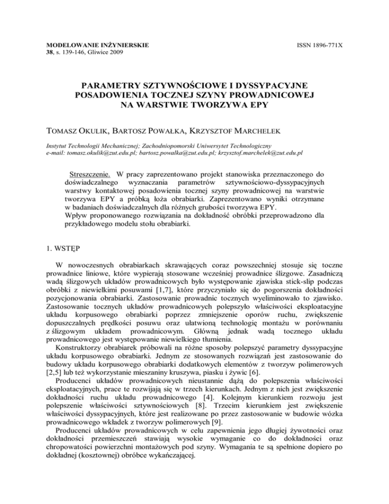 MODELOWANIE INŻYNIERSKIE 38, s. 139-146, Gliwice 2009 ISSN 1896-771X PARAMETRY SZTYWNOŚCIOWE I DYSSYPACYJNE POSADOWIENIA TOCZNEJ SZYNY PROWADNICOWEJ NA WARSTWIE TWORZYWA EPY TOMASZ OKULIK, BARTOSZ POWAŁKA, KRZYSZTOF MARCHELEK Instytut Technologii Mechanicznej; Zachodniopomorski Uniwersytet Technologiczny e-mail: [email protected]; [email protected]; [email protected] Streszczenie. W pracy zaprezentowano projekt stanowiska przeznaczonego do doświadczalnego wyznaczania parametrów sztywnościowo-dyssypacyjnych warstwy kontaktowej posadowienia tocznej szyny prowadnicowej na warstwie tworzywa EPY a próbką łoża obrabiarki. Zaprezentowano wyniki otrzymane w badaniach doświadczalnych dla różnych grubości tworzywa EPY. Wpływ proponowanego rozwiązania na dokładność obróbki przeprowadzono dla przykładowego modelu stołu obrabiarki. 1. WSTĘP W nowoczesnych obrabiarkach skrawających coraz powszechniej stosuje się toczne prowadnice liniowe, które wypierają stosowane wcześniej prowadnice ślizgowe. Zasadniczą wadą ślizgowych układów prowadnicowych było występowanie zjawiska stick-slip podczas obróbki z niewielkimi posuwami [1,7], które przyczyniało się do pogorszenia dokładności pozycjonowania obrabiarki. Zastosowanie prowadnic tocznych wyeliminowało to zjawisko. Zastosowanie tocznych układów prowadnicowych polepszyło właściwości eksploatacyjne układu korpusowego obrabiarki poprzez zmniejszenie oporów ruchu, zwiększenie dopuszczalnych prędkości posuwu oraz ułatwioną technologię montażu w porównaniu z ślizgowym układem prowadnicowym. Główną jednak wadą tocznego układu prowadnicowego jest występowanie niewielkiego tłumienia. Konstruktorzy obrabiarek próbowali na różne sposoby polepszyć parametry dyssypacyjne układu korpusowego obrabiarki. Jednym ze stosowanych rozwiązań jest zastosowanie do budowy układu korpusowego obrabiarki dodatkowych elementów z tworzyw polimerowych [2,5] lub też wykorzystanie mieszaniny kruszywa, piasku i żywic [6]. Producenci układów prowadnicowych nieustannie dążą do polepszenia właściwości eksploatacyjnych, prace te rozwijają się w trzech kierunkach. Jednym z nich jest zwiększenie dokładności ruchu układu prowadnicowego [4]. Kolejnym kierunkiem rozwoju jest polepszenie właściwości sztywnościowych [8]. Trzecim kierunkiem jest zwiększenie właściwości dyssypacyjnych, które jest realizowane po przez zastosowanie w budowie wózka prowadnicowego wkładek z tworzyw polimerowych [9]. Producenci układów prowadnicowych w celu zapewnienia jego długiej żywotności oraz dokładności przemieszczeń stawiają wysokie wymaganie co do dokładności oraz chropowatości powierzchni montażowych pod szyny. Wymagania te są spełnione dopiero po dokładnej (kosztownej) obróbce wykańczającej. 140 T. OKULIK, B. POWAŁKA, K. MARCHELEK W celu zmniejszenia kosztów produkcji oraz podniesienia właściwości dyssypacyjnych elementów korpusowych obrabiarki narodził się pomysł zastosowania warstwy tworzywa EPY pomiędzy elementem korpusowym a szyną prowadnicową, co schematycznie zaprezentowano na rys.1. Rys. 1 Idea proponowanego rozwiązania; a) dotychczasowa technologia montażu, b) montaż z zastosowaniem cienkiej warstwy tworzywa, c) montaż z dodatkową warstwą tworzywa Warstwa tworzywa może wypełniać jedynie nierówności powstałe w wyniku zgrubnej obróbki powierzchni montażowych (rys.1b) lub tworzyć dodatkową warstwę kontaktową (rys.1c). Tworzywo EPY jest szeroko stosowane w budowie maszyn, kompendium wiadomości na jego temat można znaleźć w [3]. W celu zweryfikowania przyjętego, nowego, sposobu montażu szyn prowadnicowych należy zbadać właściwości sztywnościowo-dyssypacyjne zaproponowanego rozwiązania. Określone w pracy [3] parametry sztywnościowe w postaci modułu Younga oraz dyssypacyjne w postaci logarytmicznego dekrementu tłumienia mogą nie oddawać dokładnie zachowania się warstwy kontaktowej, w szczególności dotyczy to warstw o niewielkiej grubości. 2. STANOWISKO BADAWCZE Do doświadczalnego wyznaczenia parametrów sztywnościowo-dyssypacyjnych warstwy kontaktowej zaproponowanego sposobu montażu szyn prowadnicowych skonstruowano specjalne stanowisko badawcze. Schemat stanowiska przedstawiono na rys. 2a. Stanowisko to składa się z odcinka szyny prowadnicowej (2), warstwy tworzywa EPY (3) oraz próbki łoża obrabiarki (5). Zadana siła wymuszająca realizowana jest za pomocą maszyny wytrzymałościowej. Siłomierz tensometryczny (1) oraz trzy indukcyjne czujniki przemieszczeń TR20 (4) umożliwiają rejestrację badanych charakterystyk. Na rys. 2b przedstawiono fizyczną realizację stanowiska badawczego. Podczas badań doświadczalnych realizowane są dwie charakterystyki wymuszenia, których przebieg przedstawiono na rys. 3. Charakterystyka quasi - statyczna (rys.3a) realizowana jest za pomocą sinusoidalnego obciążania do wartości siły ściskającej Fst równej 80 [kN], a następnie odciążania próbki. Czas realizacji obciążenia t2 wynosi 80 [s]. Charakterystyka dynamiczna (rys. 3b) realizowana jest w następujący sposób: próbka jest wstępnie napięta siłą ściskającą Fwst o wartości 30 [kN], a następnie realizowane jest obciążenie sinusoidalne o amplitudzie Fdyn=10 [kN] i trzech różnych częstotliwościach 15, 30 i 60 Hz. Badania z wykorzystaniem charakterystyk dynamicznych mają na celu sprawdzenie charakteru tłumienia. PARAMETRY SZTYWNOŚCIOWE I DYSSYPACYJNE POSADOWIENIA ... a) 141 b) Rys. 2 Stanowisko do badań doświadczalnych; a) schemat stanowiska badawczego (opis w tekście), b) próbka pomiarowa zamontowana na maszynie wytrzymałościowej a) b) Rys.3 Charakterystyki wymuszenia; a) charakterystyka quasi statyczna, b) charakterystyka dynamiczna (opis w tekście) Podczas badań wykorzystane zostały cztery próbki. Powierzchnie montażowe próbki A (próbka referencyjna) były szlifowane. Zastosowanie tej próbki poz
