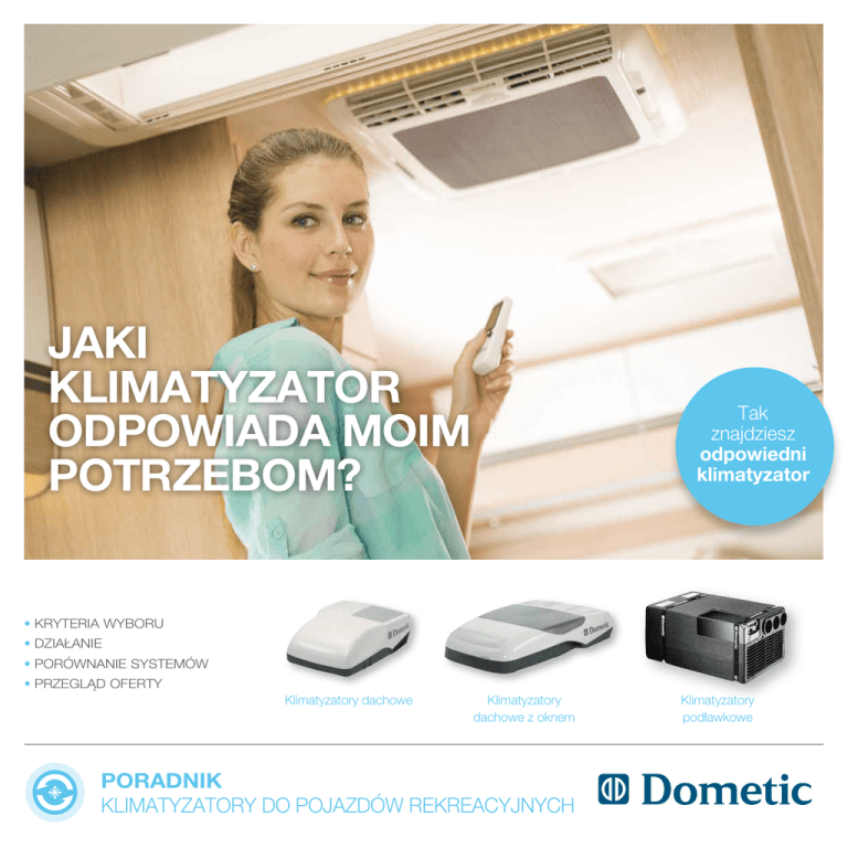 JAKI KLIMATYZATOR ODPOWIADA MOIM POTRZEBOM? Tak znajdziesz odpowiedni klimatyzator •K RYTERIA WYBORU •D ZIAŁANIE •P ORÓWNANIE SYSTEMÓW •P RZEGLĄD OFERTY Klimatyzatory dachowe Klimatyzatory dachowe z oknem PORADNIK KLIMATYZATORY DO POJAZDÓW REKREACYJNYCH Klimatyzatory podławkowe 2 ODPOWIEDNI KLIMATYZATOR ... SPIS TREŚCI KRYTERIA WYBORU KLIMATYZATORA 1. Idealna temperatura – jak powstaje dobry klimat? 6. Użytkowanie na kampingu/postoju: Prądy rozruchowe i zabezpieczenie 2. Sposób działania klimatyzatora 7. Praca podczas jazdy: możliwa tylko z zestawami DC 3. Różne typy klimatyzatorów 4. Rola pojazdu przy wyborze klimatyzatora 5. Cele podróży: Jakie wymagania musi spełniać klimatyzator? 8. Klimatyzacja bez podłączenia do prądu – uruchamiają się generatory 9. Klimatyzatory marki Dometic – Przegląd oferty PORADNIK — KLIMATYZATORY DO POJAZDÓW REKREACYJNYCH ... DO POJAZDÓW REKREACYJNYCH www.dometic.pl/rv 3 4 ODPOWIEDNI KLIMATYZATOR ... 1. IDEALNA TEMPERATURA UCZUCIE KOMFORTU Ważna jest temperatura i wilgotność powietrza Odczuwalna temperatura różni się od mierzonej temperatury powietrza i określa to, jak człowiek odczuwa temperaturę w swoim otoczeniu. Jego odczuwanie temperatury obejmuje spektrum uczucia ciepła lub gorąca, poprzez komfort, aż po odczucie zimna. Naszym celem jest cieszenie się komfortem lub przyjemnym klimatem, a decydującą rolę odgrywa przy tym wilgotność powietrza. Jeśli jest niska, tolerujemy nawet wysokie temperatury powietrza i reagujemy na nie zwiększonym wytwarzaniem potu. W przypadku suchego i gorącego powietrza pot szybko wyparowuje, co powoduje efekt chłodzenia. Takiego efektu nie ma w przypadku powietrza wilgotnego i ciepłego. Przy wysokiej wilgotności powietrza pot nie może parować na skórze, aby schłodzić ciało. Dlatego wtedy szczególnie mocno odczuwalne jest obciążenie termiczne. Powietrze jest wówczas parne i duszne, występują problemy z krążeniem krwi i snem. To pokazuje wyraźnie, jakie zadania ma do spełnienia klimatyzacja. Samo chłodzenie nie wystarcza, musi ona też zmniejszać wilgotność powietrza, aby powstał komfortowy klimat. Co oznacza przyjazny klimat? PORADNIK — KLIMATYZATORY DO POJAZDÓW REKREACYJNYCH ... DO POJAZDÓW REKREACYJNYCH 5 Zadanie klimatyzatora: Wytwarzanie poczucia komfortu Inwestujemy w klimatyzację, aby zwiększyć komfort naszego domu lub samochodu. Zakres temperatury, którym może nas zadowolić klimatyzacja, nie jest specjalnie duży. Wyraźnie przedstawia to poniższa ilustracja. Temperatury do 26°C akceptujemy tylko przy niskiej wilgotności powietrza. Jeśli powietrze jest bardzo wilgotne, temperatura nie powinna przekraczać 20°C. Dobrze czujemy się przy temperaturach 18°C – 22°C, o ile wilgotność powietrza wynosi od 40 do 70%. Aby zapewnić takie temperatury wewnątrz kampera przy wysokich temperaturach na zewnątrz, aby schłodzić powietrze i jednocześnie je osuszyć, konieczne jest zastosowanie klimatyzatora z kompresorem. Instalacje z pośrednim i bezpośrednim chłodzeniem wyparnym są zasadniczo mniej wydajne. Komfort klimatyzacji przy temp. 26°C Zakres dobrego samopoczucia w zależności od temperatury powietrza i wilgotności 26°C 24°C Temperatury 22°C 20°C 18°C 0% 10% 20% 30% 40% 50% 60% 70% 80% 90% Względna wilgotność powietrza komfortowe www.dometic.pl/rv niekomfortowe nieprzyjemnie suche lub wilgotne 100% 6 ODPOWIEDNI KLIMATYZATOR ... 2. S POSÓB DZIAŁANIA KLIMATYZATORA Zasadniczo działanie klimatyzacji nie różni się od agregatu chłodzącego, który jest zamontowany w każdej lodówce. Jej wydajność jest jednak znacznie większa. W obu przypadkach czynnik chłodniczy odbiera ciepło z chłodzonego pomieszczenia i odprowadza je przez zamknięty obieg czynnika chłodzącego na zewnątrz. Oprócz tego klimatyzator musi zmniejszać wilgotność powietrza. A. Najpopularniejsze systemy klimatyzacji dla pojazdów rekreacyjnych Instalacje wyparne: W jednostce dachowej jest woda, która jest zbierana przez filtr. Przez niego wentylator zasysa zewnętrzne powietrze i następuje wymiana ciepła. Schłodzone powietrze jest doprowadzane za pomocą wentylatora do wnętrza pomieszczenia. Zalety: niski pobór prądu, mała waga. Wady: skuteczność zależna od wilgotności otoczenia; wahania wydajności. Zmniejsza się przy wilgotności powietrza > 85% – właśnie wówczas konieczna jest niezawodna klimatyzacja. Do tego dochodzi fakt, że instalacje wyparne z powodów systemowych zwiększają wilgotność powietrza w pojeździe i to niezależnie od warunków zewnętrznych. Instalacje kompresorowe: Znajdujący się w zamkniętym obiegu Jeśli klimatyzacja jest wyposażone w energooszczędną technikę czynnik chłodniczy w postaci gazowej jest skraplany pod ciśnieniem. pomp cieplnych, wartość mocy wynosi ponad 3000 W — wówczas Przepływa przez system rurek i rozpręża się w parowniku, zmieniając także w okresie przejściowym można zapewnić ciepło w pojeździe. stan skupienia na gazowy. Przy tym z otoczenia jest pobierane Skraplacz (b) Kondensor (b) kompresor (a) Kompressor (a) ciepło, powierzchnia zewnętrzna parownika schładza się. Czynnik Opornik (e) Widerstand (e) Parownik (d) (d) Verdunster chłodniczy powraca do kompresora i proces powtarza się. Tym sposobem klimatyzacja precyzyjnie odprowadza ciepło i chłodzi wnętrze pojazdu. Poza tym cyrkuluje powietrze i je osusza. Zaleta: niezmiennie wysoka moc chłodzenia, w dużym stopniu niezależna Warme Luft wird abgeführt trz ną rt ewfüh z z ge nen zu a ys e as uß tz a jes von rze wird t wie ft Po Lu Pow ietr Luze je ft wst ird zasy von san au e z z ße ew n z ną ug trz efü hrt od temperatury zewnętrznej i wilgotności powietrza. Wiele klimatyzatorów kompresorowych posiada dodatkowo zintegrowane układy chłodzenia, które różnią się wydajnością i skutecznością. Gdy chodzi o zwykły oporowy element grzejny, Wentylator Ventilator(c) (c