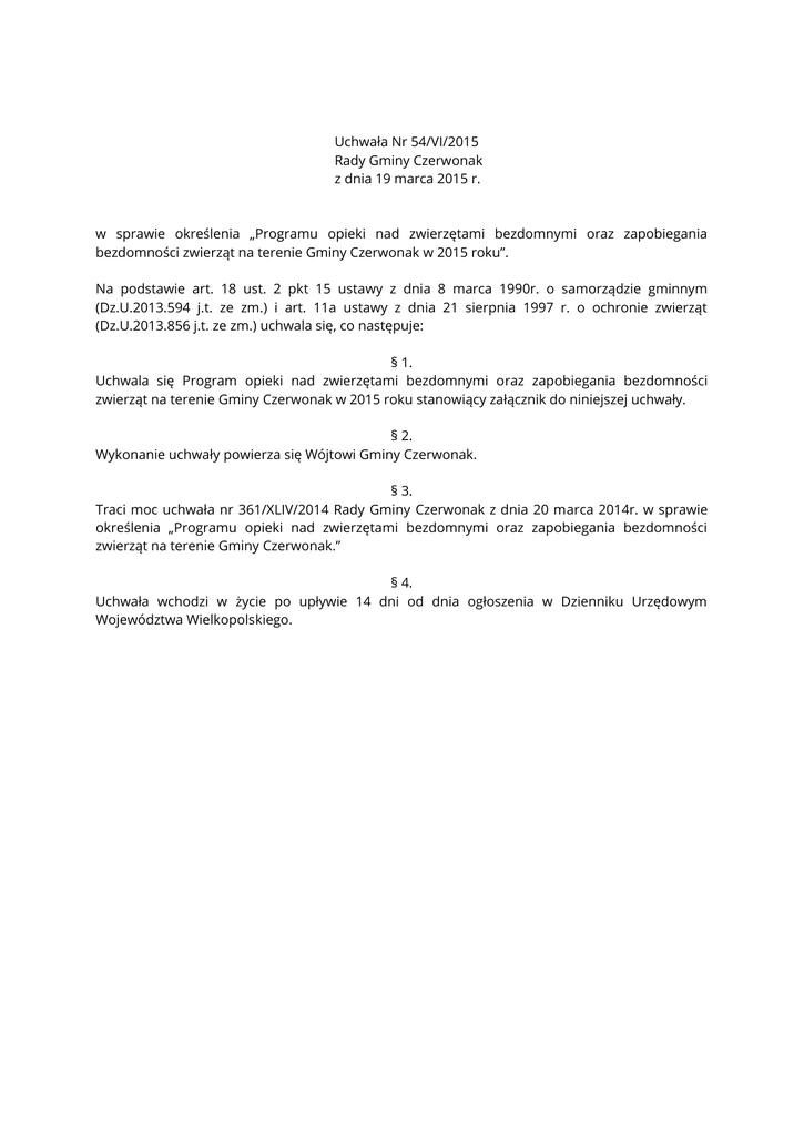 Uchwała Nr 54/VI/2015 Rady Gminy Czerwonak z dnia 19 marca 2015 r. w sprawie określenia „Programu opieki nad zwierzętami bezdomnymi oraz zapobiegania bezdomności zwierząt na terenie Gminy Czerwonak w 2015 roku”. Na podstawie art. 18 ust. 2 pkt 15 ustawy z dnia 8 marca 1990r. o samorządzie gminnym (Dz.U.2013.594 j.t. ze zm.) i art. 11a ustawy z dnia 21 sierpnia 1997 r. o ochronie zwierząt (Dz.U.2013.856 j.t. ze zm.) uchwala się, co następuje: § 1. Uchwala się Program opieki nad zwierzętami bezdomnymi oraz zapobiegania bezdomności zwierząt na terenie Gminy Czerwonak w 2015 roku stanowiący załącznik do niniejszej uchwały. § 2. Wykonanie uchwały powierza się Wójtowi Gminy Czerwonak. § 3. Traci moc uchwała nr 361/XLIV/2014 Rady Gminy Czerwonak z dnia 20 marca 2014r. w sprawie określenia „Programu opieki nad zwierzętami bezdomnymi oraz zapobiegania bezdomności zwierząt na terenie Gminy Czerwonak.” § 4. Uchwała wchodzi w życie po upływie 14 dni od dnia ogłoszenia w Dzienniku Urzędowym Województwa Wielkopolskiego. Uzasadnienie uchwały Rady Gminy Czerwonak z dnia 19 marca 2015 r. w sprawie przyjęcia „Programu opieki nad zwierzętami bezdomnymi oraz zapobiegania bezdomności zwierząt na terenie Gminy Czerwonak w 2015 roku”. Art. 11a ustawy z dnia 21 sierpnia 1997r. o ochronie zwierząt (Dz.U.2013.856 j.t. ze zm.) nakłada na Radę Gminy obowiązek określania w drodze uchwały, corocznie do dnia 31 marca, programu opieki nad zwierzętami bezdomnymi oraz zapobiegania bezdomności zwierząt. Stanowi to wypełnienie obowiązku zapewnienia opieki bezdomnym zwierzętom przez Gminę, wynikającego z art. 11 ust. 1 ww. ustawy. Podjęcie uchwały ma na celu: zapobieganie i ograniczenie bezdomności zwierząt oraz zapewnienie opieki nad bezdomnymi zwierzętami. Program zawiera wskazanie wysokości środków finansowych przeznaczonych na jego realizację oraz wskazanie sposobu ich wydatkowania. Zgodnie z art. 11a, ust. 5 ustawy o ochronie zwierząt koszty realizacji programu ponosi Gmina. Biorąc pod uwagę powyższe podjęcie przedmiotowej uchwały jest uzasadnione. Załącznik do uchwały Nr 54/VI/2015 Rady Gminy Czerwonak z dnia 19 marca 2015 r. w sprawie określenia „Programu opieki nad zwierzętami bezdomnymi oraz zapobiegania bezdomności zwierząt na terenie Gminy Czerwonak w 2015 roku”. PROGRAM OPIEKI NAD ZWIERZĘTAMI BEZDOMNYMI ORAZ ZAPOBIEGANIA BEZDOMNOŚCI ZWIERZĄT NA TERENIE GMINY CZERWONAK § 1. Celami „Programu” są: 1)...zapewnienie opieki nad zwierzętami bezdomnymi z terenu Gminy Czerwonak w rozumieniu art. 4 pkt 16 ustawy o ochronie zwierząt, 2)...zapobieganie bezdomności zwierząt, 3)...ograniczenie bezdomności zwierząt, 4)...zapewnienie bezpieczeństwa mieszkańcom Gminy Czerwonak. § 2. 1. Wykonawcami „Programu” są: 1) ...Gmina Czerwonak, 2) ...Schronisko dla Zwierząt Bezdomnych VET-AGRO Serwis - na podstawie umowy, 3) ...Andrzej Stachowiak prowadzący gospodarstwo rolne w Bolechowie - na podstawie umowy, 4) ...Klinika Weterynaryjna dr Grzegorza Wąsiatycza świadcząca usługi całodobowo - na podstawie umowy, 5) ...Klinika Weterynaryjna Dr n. wet. Tomasz Luty – na podstawie umowy, 6) ...Organizacje społeczne, stowarzyszenia, fundacje, których statutowym celem działania jest przeciwdziałanie bezdomności zwierząt we współpracy z organami gminy. 2. Funkcję koordynatora działań podejmowanych w ramach Programu pełni Wydział Gospodarki Komunalnej i Ochrony Środowiska Urzędu Gminy Czerwonak. Wydział Gospodarki Komunalnej i Ochrony Środowiska współpracuje w tym zakresie z organami Inspekcji Weterynaryjnej i samorządem lekarsko – weterynaryjnym. § 3. Obowiązek zapewnienia bezdomnym zwierzętom miejsca w schronisku dla zwierząt Gmina Czerwonak realizuje na podstawie umowy podpisanej z podmiotem prowadzącym schronisko. § 4. Opieka nad wolno żyjącymi kotami realizowana jest poprzez: 1) ...zakup i wydawanie karmy opiekunom społecznym (karmicielom) kotów wolno żyjących, którzy złożą w Urzędzie Gminy Czerwonak wniosek w wydanie karmy. Wniosek o wydanie karmy stanowi załącznik nr 1 do „Programu”. 2) ...edukację mieszkańców Gminy Czerwonak w zakresie opieki nad kotami wolno żyjącymi. 3) ...współpracę w realizacji w/w zadań z jednostkami organizacyjnymi Gminy oraz z organizacjami społecznymi. § 5. Na terenie Gminy wprowadza się odławianie bezdomnych zwierząt: 1) odławianiem będą objęte bezdomne zwierzęta pozostawione bez opieki, w stosunku, do których nie istnieje możliwość ustalenia ich właściciela lub innej osoby, pod której opieką dotychczas pozostawały, a w szczególności chore lub zagrażające życiu, zdrowiu i bezpieczeństwu ludzi, 2) celem zapewnienia wyłapanym zwierzętom dalszej opieki Gmina przekazuje je do schroniska dla bezdomnych zwierząt, z którym ma podpisaną umowę, 3) wyłapywanie bezdomnych zwierząt będzie prowadzone wyłącznie przy użyciu specjalistycznego sprzętu przeznaczonego do wyłapywania zwierząt, który nie stwarza zagrożenia dla życia i zdrowia zwierząt, a także nie będzie zadawał im cierpienia, 4)...transport bezdomnych zwierząt będzie odbywał się środkiem transportu przystosowanym do bezpiecznego i humanitarnego przewozu zwierząt. § 6. 1. Gmina realizuje obligatoryjną sterylizację albo kastrację zwierząt w schronisku dla zwierząt na zasadach określonych w umowie zawartej z podmiotem prowadzącym schronisko. 2. Zabiegi sterylizacji i kastracji mogą być przeprowadzane wyłącznie przez lekarza weterynarii. 3. Zabiegom, o których mowa w ust. 1, nie podlegają zwierzęta w okresie 14 dni od umieszczenia w schronisku z uwagi na możliwość zgłoszenia się właściciela lub opiekuna. § 7. Poszukiwanie właścicieli dla bezdomnych zwierząt realizowane jest poprzez: 1) informowanie o możliwości adopcji zwierząt bezdomnych w sposób zwyczajowo przyjęty na terenie Gminy, w tym na stronach internetowy