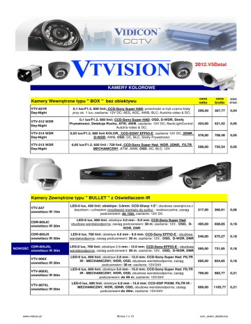 2012.V5Detal KAMERY KOLOROWE Kamery Wewnętrzne typu " BOX " bez obiektywu cena netto cena brutto KGO zł/szt. VTV-621R Day-Night 0,1 lux/F1.2, 600 linii; CCD-Sony Super HAD; przechodzi w tryb czarno-biały przy ok. 1 lux; zasilanie: 12V DC; AES, AGC, AWB, BLC; AutoIris-video & DC; 299,00 367,77 0,04 VTV-512 WDR Day-Night 0,1 lux/F1.2, 600 linii; CCD-Sony Super HAD; OSD, D-WDR, Strefy Prywatności, Detekcja Ruchu, ATW, AWB, zasilanie: 12V DC; BackLightControl; AutoIris-video & DC; 424,00 521,52 0,05 VTV-514 WDR Day-Night 0,03 lux/F1.2, 680 linii KOLOR, CCD-SONY EFFIO-E, zasilanie 12V DC, 2DNR, D-WDR, AWB, OSD, DC, BLC, Strefy Prywatności 576,00 708,48 0,05 VTV-513 WDR Day-Night 0,05 lux/F1.2, 620 linii / 720 linii, CCD-Sony Super Had, WDR, 2DNR, FILTR MECHANICZNY, ATW, AWB, OSD, DC, BLC, 12V 598,00 735,54 0,05 Kamery Zewnętrzne typu " BULLET " z Oświetlaczem IR NOWOŚĆ VTV-647 oświetlacz IR 15m LED-0 lux, 420 linii; obiektyw: 3.6mm; CCD-Sharp 1/3"; obudowa zewnętrzna z daszkiem i uchwytem (możliwość montażu do sufitu) - wodoszczelna; zasięg podczerwieni: do 15m; zasilanie: 12V DC 217,00 266,91 0,06 CDR-805JC oświetlacz IR 30m LED-0 lux, 600 linii; obiektyw 4.0 mm - 9.0 mm; CCD-Sony Super Had; obudowa wandaloodporna; zasięg podczerwieni: 30 m; zasilanie: 12V, OSD, DWDR, DNR 495,00 608,85 0,18 CDR-805JX oświetlacz IR 30m LED-0 lux, 700 linii; obiektyw 4.0 mm - 9.0 mm; CCD-Sony EFFIO-E ; obudowa wandaloodporna; zasięg podczerwieni: 30 m; zasilanie: 12V, OSD, D-WDR, DNR 549,00 675,27 0,18 CDR-805JXL oświetlacz IR 30m LED-0 lux, 700 linii; obiektyw 2.8 mm - 12.0 mm; CCD-Sony EFFIO-E ; obudowa wandaloodporna; zasięg podczerwieni: 30 m; zasilanie: 12V, OSD, D-WDR, DNR 595,00 731,85 0,18 695,00 854,85 0,18 799,00 982,77 0,21 899,00 1105,77 0,21 VTV-906X oświetlacz IR 30m VTV-906XL oświetlacz IR 50m VTV-907XL oświetlacz IR 50m www.vidicon.pl LED-0 lux, 600 linii; obiektyw 2.8 mm - 12.0 mm; CCD-Sony Super Had; FILTR IR - MECHANICZNY, WDR, OSD, obudowa wandaloodporna; zasięg podczerwieni: 30 m; zasilanie: 12V/24V LED-0 lux, 600 linii; obiektyw 5.0 mm - 15.0 mm; CCD-Sony Super Had; FILTR IR - MECHANICZNY, WDR, OSD, obudowa wandaloodporna; zasięg podczerwieni: do 50 m; zasilanie: 12V/24V LED-0 lux, 690 linii; obiektyw 5.0 mm - 15.0 mm; CCD-DSP PIXIM; FILTR IR MECHANICZNY, WDR, 3DNR, OSD, obudowa wandaloodporna; zasięg podczerwieni:do 50m; zasilanie: 12V/24V Strona 1 z 13 cctv_sswin_detaliczny KAMERY KOLOROWE Kamery Szybkoobrotowe VTVision cena netto cena brutto KGO zł/szt. VTV-HSD-30X Kamera szybkoobrotowa dzień-noc CCD 1/4" Sony Super HAD, 650linii, 0.1lux Day/0.01lux Night, WDR, DNR, obiektyw 3,4-102mm F1.6, zoom optyczny 30X, obudowa zewnętrzna. ( kamera bez zasilacza i uchwytu ) 4790,00 5891,70 0,79 VTV-HSD-36X Kamera szybkoobrotowa dzień-noc CCD 1/4" Sony Super HAD, 650linii, 0.1lux Day/0.01lux Night, WDR, DNR, obiektyw 3,4-122mm F1.6, zoom optyczny 36X, obudowa zewnętrzna. ( kamera bez zasilacza i uchwytu ) 4990,00 6137,70 0,79 UCHWYT W-MINI Uchwyt scienny mini 20 cm 239,00 293,97 UCHWYT S25CM Uchwyt sufitowy 25cm 229,00 281,67 Uchwyt sufitowy 50cm 250,00 307,50 470,00 578,10 Uchwyt do montażu na słupie (wymaga zastosowania dodatkowo UCHWYTU MINI) 275,00 338,25 ZASILACZ 24V Zasilacz do głowic 24V AC 3A 275,00 338,25 VTV-K31 PLUS Klawiatura do sterowania DVR N31/21 oraz GŁOWIC PTZ po RS485 z joystikiem 2290,00 2816,70 0,22 310,00 381,30 0,01 795,00 977,85 0,01 UCHWYT S50CM UCHWYT N-BOX UCHWYT SP Uchwyt narożny z miejscem na zasilacz (wymaga zastosowania dodatkowo UCHWYTU MINI) Kamery płytkowe kolorowe VTV-501N Day-Night 0.2lux; 600 linii; 32x32; obiektyw: pinhole 3,6mm; CCD-Sony, OSD, tor audio, zasilanie 12V Kamera miniaturowa typu "wizjer", kolorowa NOWOŚĆ KPC-190PPH4 door viewer 0.05lux, 550 linii, CCD-Sony Super HAD II, obudowa o regulowanej długości od 30 do 67mm, średnica 20 mm, Kąt widzenia 170 st. (typu wizjer do drzwi), zasilanie 12V Kamery kopułkowe kolorowe wewnętrzne VTV-D6A2 0.1lux, 420 linii; obiektyw 3.6mm, CCD-Sharp; AES, AGC, AWB; obudowa plastikowa; zasilanie 12V 118,00 145,14 0,02 VTV-D6A3 0.1lux, 520 linii; obiektyw 3.6mm, CCD-Sony; AES, AGC, AWB; obudowa plastikowa; zasilanie 12V 217,00 266,91 0,02 VTV-D6A4 0.01lux, 600 linii; obiektyw 3.6mm, CCD-Sony Super HAD ; AES, AGC, AWB; obudowa plastikowa; zasilanie 12V 239,00 293,97 0,02 0.01lux , 700 linii ; obiektyw : 3.6mm, CCD-Sony EFFIO-E; OSD, D-WDR, DNR, strefy prywatności 8 ; obudowa plastikowa; zasilanie 12V 379,00 466,17 0,02 CDR-105K 0,001lux ( Sense -UP ON), 540 linii, obiektyw 3.5 - 8.0mm, CCD-Sony Super HAD, AES, ATW, AGC, 12V, obudowa plastikowa, zasilanie 12V 349,00 429,27 0,04 CDR-105J 0,001lux ( Sense -UP ON), 600 linii, obiektyw 3.5 - 8.0mm, CCD-Sony Super HAD, 2 DNR, AES, ATW, AGC, 12V, obudowa plastikowa, zasilanie 12V 399,00 490,77 0,04 0,01lux , 700 linii, obiektyw 4.0 - 9.0mm, CCD-Sony EFFIO-E, OSD, WDR, DNR, AES, ATW, AGC, 12V, obudowa plastikowa, zasilanie 12V 455,00 559,65 0,04 379,00 466,17 0,04 455,00 559,65 0,04 469,00 576,87 0,04 495,00 608,85 0,05 CDR-100WDR CDR-105JX CDR-106K CDR-106J CDR-106JX NOWOŚĆ VTV-607WDRn www.vidicon.pl 0,001lux ( Sense -UP ON), 540 linii, obiektyw 3.5 - 8.0mm, CCD-Sony Super HAD, AES, ATW, AGC, 12V, oświetlacz IR 20m, obudowa plastikowa, zasilanie 12V 0,001lux ( Sense -UP ON), 600 linii, obiektyw 3.5 - 8.0mm, CCD-Sony Super HAD, 2 DNR, AES, ATW, AGC, 12V, oświetlacz IR 20m, obudowa plastikowa, zasilanie 12V 0,01lux , 700 linii, obiektyw 4.0 - 9.0mm, CCD-Sony EFFIO-E, OSD, WDR, DNR, AES, ATW, AGC, 12V, oświetlacz IR 20m, obudowa plastikowa, zasilanie 12V 0,03 lux/F1.2, 600 linii, obiektyw 2.8-12.0mm, CCD-Sony Super Had, 12V, WDR, DNR, ATW, AWB, OSD, DC, BLC, 12V, obudowa plastikowa Strona 2 z 13 cctv_sswin_detaliczny KAMERY KOLOROWE cena netto cena brutto KGO zł/szt. 0,03 lux/F1.2, 600 linii, obiektyw 2.8-12.0mm, CCD-Sony Super Had, 12V, WDR, DNR, ATW, AWB, OSD, DC, BLC, 12V, obudowa zewnętrzna wandaloodporna 579,00 712,17 0,1