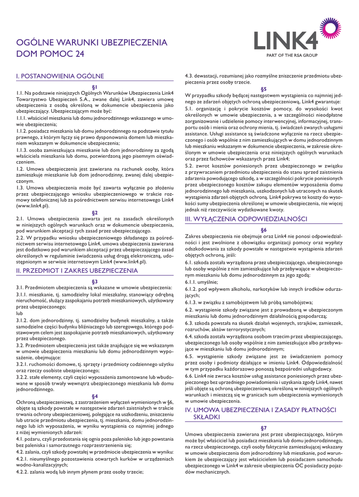 OGÓLNE WARUNKI UBEZPIECZENIA DOM POMOC 24 I. POSTANOWIENIA OGÓLNE §1 1.1. Na podstawie niniejszych Ogólnych Warunków Ubezpieczenia Link4 Towarzystwo Ubezpieczeń S.A., zwane dalej Link4, zawiera umowę ubezpieczenia z osobą określoną w dokumencie ubezpieczenia jako ubezpieczający. Ubezpieczającym może być: 1.1.1. właściciel mieszkania lub domu jednorodzinnego wskazanego w umowie ubezpieczenia; 1.1.2. posiadacz mieszkania lub domu jednorodzinnego na podstawie tytułu prawnego, z którym łączy się prawo dysponowania domem lub mieszkaniem wskazanym w dokumencie ubezpieczenia; 1.1.3. osoba zamieszkująca mieszkanie lub dom jednorodzinny za zgodą właściciela mieszkania lub domu, potwierdzoną jego pisemnym oświadczeniem. 1.2. Umowa ubezpieczenia jest zawierana na rachunek osoby, która zamieszkuje mieszkanie lub dom jednorodzinny, zwanej dalej ubezpieczonym. 1.3. Umowa ubezpieczenia może być zawarta wyłącznie po złożeniu przez ubezpieczającego wniosku ubezpieczeniowego w trakcie rozmowy telefonicznej lub za pośrednictwem serwisu internetowego Link4 (www.link4.pl). §2 2.1. Umowa ubezpieczenia zawarta jest na zasadach określonych w niniejszych ogólnych warunkach oraz w dokumencie ubezpieczenia, pod warunkiem akceptacji tych zasad przez ubezpieczającego. 2.2. W przypadku wniosku ubezpieczeniowego składanego za pośrednictwem serwisu internetowego Link4, umowa ubezpieczenia zawierana jest dodatkowo pod warunkiem akceptacji przez ubezpieczającego zasad określonych w regulaminie świadczenia usług drogą elektroniczną, udostępnionym w serwisie internetowym Link4 (www.link4.pl). II. PRZEDMIOT I ZAKRES UBEZPIECZENIA §3 3.1. Przedmiotem ubezpieczenia są wskazane w umowie ubezpieczenia: 3.1.1. mieszkanie, tj. samodzielny lokal mieszkalny, stanowiący odrębną nieruchomość, służący zaspokajaniu potrzeb mieszkaniowych, użytkowany przez ubezpieczonego; lub 3.1.2. dom jednorodzinny, tj. samodzielny budynek mieszkalny, a także samodzielne części budynku bliźniaczego lub szeregowego, którego podstawowym celem jest zaspokajanie potrzeb mieszkaniowych, użytkowany przez ubezpieczonego. 3.2. Przedmiotem ubezpieczenia jest także znajdujące się we wskazanym w umowie ubezpieczenia mieszkaniu lub domu jednorodzinnym wyposażenie, obejmujące: 3.2.1. ruchomości domowe, tj. sprzęty i przedmioty codziennego użytku oraz rzeczy osobiste ubezpieczonego; 3.2.2. stałe elementy, czyli części wyposażenia zamontowane lub wbudowane w sposób trwały wewnątrz ubezpieczonego mieszkania lub domu jednorodzinnego. §4 Ochroną ubezpieczeniową, z zastrzeżeniem wyłączeń wymienionych w §6, objęte są szkody powstałe w następstwie zdarzeń zaistniałych w trakcie trwania ochrony ubezpieczeniowej, polegające na uszkodzeniu, zniszczeniu lub utracie przedmiotu ubezpieczenia, tj. mieszkania, domu jednorodzinnego lub ich wyposażenia, w wyniku wystąpienia co najmniej jednego z niżej wymienionych zdarzeń: 4.1. pożaru, czyli przedostania się ognia poza palenisko lub jego powstania bez paleniska i samorzutnego rozprzestrzenienia się; 4.2. zalania, czyli szkody powstałej w przedmiocie ubezpieczenia w wyniku: 4.2.1. nieumyślnego pozostawienia otwartych kurków w urządzeniach wodno-kanalizacyjnych; 4.2.2. zalania wodą lub innym płynem przez osoby trzecie; 4.3. dewastacji, rozumianej jako rozmyślne zniszczenie przedmiotu ubezpieczenia przez osoby trzecie. §5 W przypadku szkody będącej następstwem wystąpienia co najmniej jednego ze zdarzeń objętych ochroną ubezpieczeniową, Link4 gwarantuje: 5.1. organizację i pokrycie kosztów pomocy, do wysokości kwot określonych w umowie ubezpieczenia, a w szczególności nieodpłatne zorganizowanie i udzielenie pomocy interwencyjnej, informacyjnej, transportu osób i mienia oraz ochrony mienia, tj. świadczeń zwanych usługami assistance. Usługi assistance są świadczone wyłącznie na rzecz ubezpieczonego i osób wspólnie z nim zamieszkujących w domu jednorodzinnym lub mieszkaniu wskazanym w dokumencie ubezpieczenia, w zakresie określonym w umowie ubezpieczenia oraz niniejszych ogólnych warunkach oraz przez fachowców wskazanych przez Link4; 5.2. zwrot kosztów poniesionych przez ubezpieczonego w związku z przywracaniem przedmiotu ubezpieczenia do stanu sprzed zaistnienia zdarzenia powodującego szkodę, a w szczególności pokrycie poniesionych przez ubezpieczonego kosztów zakupu elementów wyposażenia domu jednorodzinnego lub mieszkania, uszkodzonych lub utraconych na skutek wystąpienia zdarzeń objętych ochroną. Link4 pokrywa te koszty do wysokości sumy ubezpieczenia określonej w umowie ubezpieczenia, nie więcej jednak niż rzeczywiście wydatkowane kwoty. III. WYŁĄCZENIA ODPOWIEDZIALNOŚCI §6 Zakres ubezpieczenia nie obejmuje oraz Link4 nie ponosi odpowiedzialności i jest zwolnione z obowiązku organizacji pomocy oraz wypłaty odszkodowania za szkody powstałe w następstwie wystąpienia zdarzeń objętych ochroną, jeśli: 6.1. szkoda została wyrządzona przez ubezpieczającego, ubezpieczonego lub osoby wspólnie z nim zamieszkujące lub przebywające w ubezpieczonym mieszkaniu lub domu jednorodzinnym za jego zgodą: 6.1.1. umyślnie; 6.1.2. pod wpływem alkoholu, narkotyków lub innych środków odurzających; 6.1.3. w związku z samobójstwem lub próbą samobójstwa; 6.2. wystąpienie szkody związane jest z prowadzoną w ubezpieczonym mieszkaniu lub domu jednorodzinnym działalnością gospodarczą; 6.3. szkoda powstała na skutek działań wojennych, strajków, zamieszek, rozruchów, aktów terrorystycznych; 6.4. szkoda została wyrządzona osobom trzecim przez ubezpieczającego, ubezpieczonego lub osoby wspólnie z nim zamieszkujące albo przebywające w mieszkaniu lub domu jednorodzinnym; 6.5. wystąpienie szkody związane jest ze świadczeniem pomocy przez osoby i podmioty działające w imieniu Link4. Odpowiedzialność w tym przypadku każdorazowo ponoszą bezpośredni usługodaw