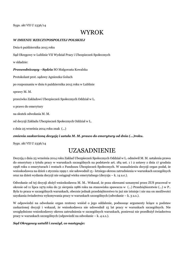 Sygn. akt VII U 2336/14 WYROK W IMIENIU RZECZYPOSPOLITEJ POLSKIEJ Dnia 6 października 2015 roku Sąd Okręgowy w Lublinie VII Wydział Pracy i Ubezpieczeń Społecznych w składzie: Przewodniczący –Sędzia SO Małgorzata Kowalska Protokolant prot. sądowy Agnieszka Goluch po rozpoznaniu w dniu 6 października 2015 roku w Lublinie sprawy M. M. przeciwko Zakładowi Ubezpieczeń Społecznych Oddział w L. o prawo do emerytury na skutek odwołania M. M. od decyzji Zakładu Ubezpieczeń Społecznych Oddział w L. z dnia 25 września 2014 roku znak (...) zmienia zaskarżoną decyzję i ustala M. M. prawo do emerytury od dnia (...)roku. Sygn. akt VII U 2336/14 UZASADNIENIE Decyzją z dnia 25 września 2014 roku Zakład Ubezpieczeń Społecznych Oddział w L. odmówił M. M. ustalenia prawa do emerytury z tytułu pracy w warunkach szczególnych na podstawie art. 184 ust. 1 i 2 ustawy z dnia 17 grudnia 1998 roku o emeryturach i rentach z Funduszu Ubezpieczeń Społecznych. W uzasadnieniu decyzji organ podał, że wnioskodawca na dzień 1 stycznia 1999 r. nie udowodnił 15 - letniego okresu zatrudnienia w warunkach szczególnych oraz na dzień wydania decyzji nie osiągnął wieku emerytalnego (decyzja – k. 14 a.e.). Odwołanie od tej decyzji złożył wnioskodawca M. M.. Wskazał, że poza okresami uznanymi przez ZUS pracował w okresie od 11 lipca 1979 roku do 31 sierpnia 1986 roku na stanowisku spawacza w (...) Przedsiębiorstwie (...) w P.. Była to praca w szczególnych warunkach, obecnie jednak przedsiębiorstwo to już nie istnieje i nie ma on możliwości uzyskania świadectwa wykonywania pracy w warunkach szczególnych (odwołanie – k. 3 a.s.). W odpowiedzi na odwołanie organ rentowy wniósł o jego oddalenie, podnosząc argumenty leżące u podstaw zaskarżonej decyzji i wskazał, że wnioskodawca nie udowodnił 15 lat pracy w warunkach szczególnych. Nie uwzględniono wnioskodawcy okresu zatrudnienia w szczególnych warunkach, ponieważ nie przedłożył świadectwa pracy w warunkach szczególnych (odpowiedź na odwołanie – k. 4 a.s.). Sąd Okręgowy ustalił i zważył, co następuje: M. M. urodził się w dniu (...). Od dnia 7 sierpnia 1997 roku był on uprawniony do renty z tytułu częściowej niezdolności do pracy, ostatnio ustalone do dnia 31 marca 2017 roku (vide akta rentowe) W dniu 15 września 2014 r. złożył wniosek o ustalenie prawa do emerytury. We wniosku oświadczył, iż nie jest członkiem otwartego funduszu emerytalnego (k. 1-4 a.s.). Nadto do wniosku skarżący dołączył świadectwa wykonywania pracy w warunkach szczególnych za okresy od 1 sierpnia 1977 roku do 31 maja 1979 roku oraz od 24 września 1986 roku do 23 kwietnia 1995 roku, w obu przypadkach na stanowiskach spawacza gazowego i elektrycznego (k. 7-8 a.e.). Pozostała dokumentacja dotycząca zatrudnienia i osiąganych wynagrodzeń zgormadzona została w chwili ubiegania się odwołującego o prawo do renty z tytułu niezdolności do pracy oraz ustalania kapitału początkowego. W oparciu o zgromadzone dokumenty organ rentowy uwzględnił wnioskodawcy na dzień 1 stycznia 1999r. łączny staż ubezpieczeniowy w wymiarze 27 lat, 1 miesiąca i 28 dni okresów składkowych i nieskładkowych oraz uznał za udowodnione 10 lat, 11 miesięcy i 20 dni okresów zatrudnienia w warunkach szczególnych (na podstawie przedłożonych świadectw wykonywania pracy w warunkach szczególnych) – (k. 14 a.e.). W toku postępowania Sąd ustalił, iż M. M. został przyjęty do pracy w (...) Przedsiębiorstwie (...) w L. od dnia 11 lipca 1979 roku na stanowisku spawacza w Warsztacie (...), początkowo na dwutygodniowy okres próbny, następnie na czas nieokreślony, w pełnym wymiarze czasu pracy. Na stanowisku tym skarżący pozostał do końca zatrudnienia tj. do dnia 30 sierpnia 1986 roku. Na zajmowanym stanowisku wnioskodawca stale i w pełnym wymiarze wykonywał prace polegające na spawaniu gazowym i elektrycznym. Pracował w brygadzie remontowo – mechanicznej, która zajmowała się remontami na terenie przedsiębiorstwa oraz poza nim, na zasadzie delegacji. Brał udział w remontach urządzeń utylizacyjnych , instalacji c.o., kotłowni. Był jedynym spawaczem w brygadzie. Nie był kierowany na inne stanowiska bądź do innych prac. Otrzymywał dodatek za pracę w warunkach szczególnych, pracował w masce, rękawicach i okularach ochronnych (akta osobowe k. 26 a.s., zeznania wnioskodawcy k. 37v a.s. w związku z k. 20v-21 a.s., zeznania świadków: B. C. k. 37 a.s. oraz K. W. k. 37-37v a.s.) Sąd uznał za wiarygodne zeznania wnioskodawcy, ponieważ są spójne, logiczne i co do podstawowych okoliczności zgodne z zeznaniami świadków B. C. i K. W.. Podnieść należy, iż świadkowie pracowali razem z wnioskodawca w tym samym okresie. ŚwiadekB. C. pracował jako ślusarz remontowy w brygadzie remontowej, K. W. był brygadzistą, w jego brygadzie częściowo pracował wnioskodawca. Z racji wykonywanych obowiązków mieli możność poczynienia bezpośrednich i trafnych spostrzeżeń odnośnie rodzaju wykonywanych przez skarżącego czynności. Potwierdzili, że wnioskodawca pracował stale jako spawacz w pełnym wymiarze godzin. Świadkowie są dla wnioskodawcy osobami obcymi, nie są zainteresowani rozstrzygnięciem niniejszej sprawy i nie mieli powodu by składać zeznania niezgodnie z prawdą. W ocenie Sądu zeznania świadków i wnioskodawcy zasługują na obdarzenie wiarą w całości. Zeznania te znajdują potwierdzenie w dokumentach zgromadzonych przez organ rentowy oraz Sąd, w tym w katach osobowych wnioskodawcy zachowanych ze spornego okresu. Odwołanie wnioskodawcy jest zasadne i zasługuje na uwzględnienie. Zgodnie z art. 184 ust. 1 i 2 ustawy z dnia 17 grudnia 1998 roku o emeryturach i rentach z Funduszu Ubezpieczeń Społecznych (tekst jednolity: Dz. U. 2009 Nr 153 poz. 1227 ze zm.), mężczyznom urodzonym po dniu 31 grudnia 1948 roku przysługuje emerytura po osiągnięciu wieku prze