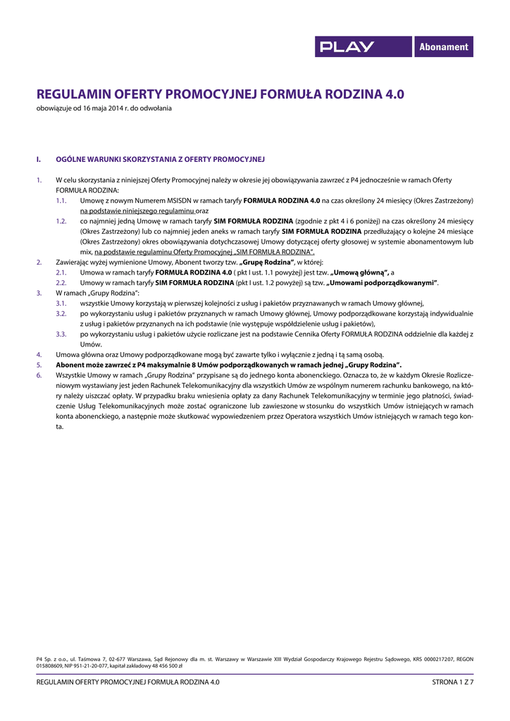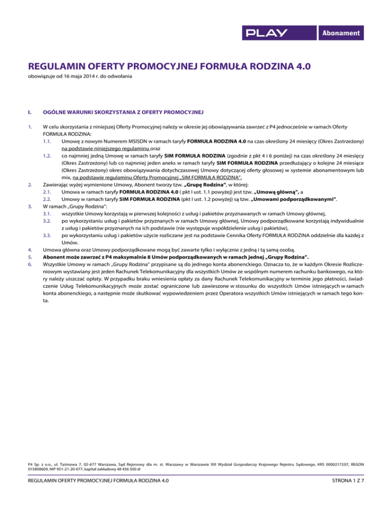 REGULAMIN OFERTY PROMOCYJNEJ FORMUŁA RODZINA 4.0 obowiązuje od 16 maja 2014 r. do odwołania I. OGÓLNE WARUNKI SKORZYSTANIA Z OFERTY PROMOCYJNEJ 1. W celu skorzystania z niniejszej Oferty Promocyjnej należy w okresie jej obowiązywania zawrzeć z P4 jednocześnie w ramach Oferty FORMUŁA RODZINA: 1.1. Umowę z nowym Numerem MSISDN w ramach taryfy FORMUŁA RODZINA 4.0 na czas określony 24 miesięcy (Okres Zastrzeżony) na podstawie niniejszego regulaminu oraz 1.2. co najmniej jedną Umowę w ramach taryfy SIM FORMUŁA RODZINA (zgodnie z pkt 4 i 6 poniżej) na czas określony 24 miesięcy (Okres Zastrzeżony) lub co najmniej jeden aneks w ramach taryfy SIM FORMUŁA RODZINA przedłużający o kolejne 24 miesiące (Okres Zastrzeżony) okres obowiązywania dotychczasowej Umowy dotyczącej oferty głosowej w systemie abonamentowym lub mix, na podstawie regulaminu Oferty Promocyjnej „SIM FORMUŁA RODZINA”. Zawierając wyżej wymienione Umowy, Abonent tworzy tzw. „Grupę Rodzina”, w której: 2.1. Umowa w ramach taryfy FORMUŁA RODZINA 4.0 ( pkt I ust. 1.1 powyżej) jest tzw. „Umową główną”, a 2.2. Umowy w ramach taryfy SIM FORMUŁA RODZINA (pkt I ust. 1.2 powyżej) są tzw. „Umowami podporządkowanymi”. W ramach „Grupy Rodzina”: 3.1. wszystkie Umowy korzystają w pierwszej kolejności z usług i pakietów przyznawanych w ramach Umowy głównej, 3.2. po wykorzystaniu usług i pakietów przyznanych w ramach Umowy głównej, Umowy podporządkowane korzystają indywidualnie z usług i pakietów przyznanych na ich podstawie (nie występuje współdzielenie usług i pakietów), 3.3. po wykorzystaniu usług i pakietów użycie rozliczane jest na podstawie Cennika Oferty FORMUŁA RODZINA oddzielnie dla każdej z Umów. Umowa główna oraz Umowy podporządkowane mogą być zawarte tylko i wyłącznie z jedną i tą samą osobą. Abonent może zawrzeć z P4 maksymalnie 8 Umów podporządkowanych w ramach jednej „Grupy Rodzina”. Wszystkie Umowy w ramach „Grupy Rodzina” przypisane są do jednego konta abonenckiego. Oznacza to, że w każdym Okresie Rozliczeniowym wystawiany jest jeden Rachunek Telekomunikacyjny dla wszystkich Umów ze wspólnym numerem rachunku bankowego, na który należy uiszczać opłaty. W przypadku braku wniesienia opłaty za dany Rachunek Telekomunikacyjny w terminie jego płatności, świadczenie Usług Telekomunikacyjnych może zostać ograniczone lub zawieszone w stosunku do wszystkich Umów istniejących w ramach konta abonenckiego, a następnie może skutkować wypowiedzeniem przez Operatora wszystkich Umów istniejących w ramach tego konta. 2. 3. 4. 5. 6. P4 Sp. z o.o., ul. Taśmowa 7, 02-677 Warszawa, Sąd Rejonowy dla m. st. Warszawy w Warszawie XIII Wydział Gospodarczy Krajowego Rejestru Sądowego, KRS 0000217207, REGON 015808609, NIP 951-21-20-077, kapitał zakładowy 48 456 500 zł REGULAMIN OFERTY PROMOCYJNEJ FORMUŁA RODZINA 4.0 STRONA 1 Z 7 II. SZCZEGÓŁY OFERTY PROMOCYJNEJ 1. Opłaty abonamentowe (Abonament i opłaty za poszczególne usługi) w ramach niniejszej Oferty Promocyjnej: Tabela nr 1: Szczegóły taryfy FORMUŁA RODZINA 4.0 – obowiązują przez pierwszy niepełny i następujące po nim sześć pierwszych pełnych Okresów Rozliczeniowych TARYFA FORMUŁA RODZINA 4.0 Rabat na Abonament naliczany przez sześć pierwszych pełnych Okresów Rozliczeniowych Abonament po rabacie, naliczany przez sześć pierwszych pełnych Okresów Rozliczeniowych Tabela nr 2: 100% 0 PLN Szczegóły taryfy FORMUŁA RODZINA 4.0 – obowiązują od siódmego pełnego Okresu Rozliczeniowego do końca Okresu Zastrzeżonego oraz po przekształceniu Umowy w Umowę zawartą na czas nieokreślony TARYFA Rabat podstawowy naliczany od siódmego pełnego Okresu Rozliczeniowego Abonament po rabacie podstawowym naliczany od siódmego pełnego Okresu Rozliczeniowego Rabaty zależne od liczby Liczba Umów Umów podporządkopodporządwanych w „Grukowanych pie Rodzina” naliczane od siódmego pełnego Rabat na Okresu Abonament Rozliczeniowego Wysokość Abonamentu po uwzględnieniu powyższych rabatów, naliczana od siódmego pełnego Okresu Rozliczeniowego Abonament naliczany od siódmego pełnego Okresu Rozliczeniowego uwzględniający dodatkowe rabaty: 5,99 PLN za efakturę i terminowe płatności oraz rabat 5,99 PLN za zgody marketingowe* FORMUŁA RODZINA 4.0 19,089070% 211,93 PLN 1 2-4 5 6 7 8 W przypadku wyłączenia wszystkich umów podporządkowanych z Grupy Rodzina 70,7592% 47,1665% 35,3749% 23,5833% 11,7916% brak 70,7592% 61,97 PLN 111,97 PLN 136,96 PLN 161,95 PLN 186,94 PLN 211,93 PLN 61,97 PLN 49,99 PLN 99,99 PLN 124,98 PLN 149,97 PLN 174,96 PLN 199,95 PLN 49,99 PLN *Rabaty, o których mowa w pkt. III niniejszego Regulaminu Oferty Promocyjnej P4 Sp. z o.o., ul. Taśmowa 7, 02-677 Warszawa, Sąd Rejonowy dla m. st. Warszawy w Warszawie XIII Wydział Gospodarczy Krajowego Rejestru Sądowego, KRS 0000217207, REGON 015808609, NIP 951-21-20-077, kapitał zakładowy 48 456 500 zł REGULAMIN OFERTY PROMOCYJNEJ FORMUŁA RODZINA 4.0 STRONA 2 Z 7 2. W ramach niniejszej Oferty Promocyjnej Abonenci otrzymują: 2.1. Rabat podstawowy 19,089070% na Abonament naliczany od siódmego pełnego Okresu Rozliczeniowego do końca Okresu Zastrzeżonego, zgodnie z zasadami opisanymi w pkt II ust. 3 poniżej. 2.2. Rabat na Abonament przyznawany zgodnie z Tabelą nr 2 powyżej, naliczany od siódmego pełnego Okresu Rozliczeniowego do końca Okresu Zastrzeżonego , w wysokości uzależnionej od liczby zawartych Umów podporządkowanych (od 1 do 8 Umów) w ramach „Grupy Rodzina”, zgodnie z zasadami opisanymi w pkt II ust. 4 poniżej. 2.3. Dodatkowy rabat na Abonament w wysokości 5,99 PLN naliczany od siódmego pełnego Okresu Rozliczeniowego do końca Okresu Zastrzeżonego, w przypadku wyrażenia przez Abonenta zgody na wystawianie i otrzymywanie faktur w formie elektronicznej (e-faktura) oraz terminowych płatności wynikających z Rachunku Telekomunikacyjnego, przy