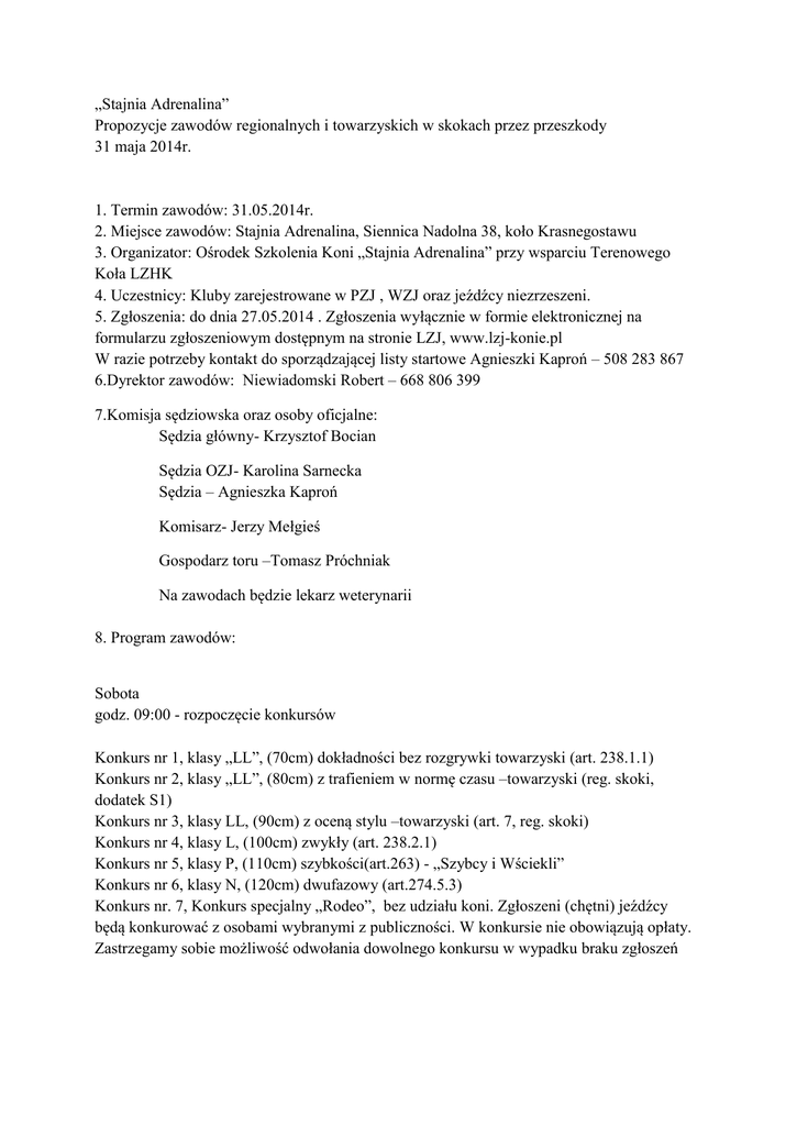 „Stajnia Adrenalina” Propozycje zawodów regionalnych i towarzyskich w skokach przez przeszkody 31 maja 2014r. 1. Termin zawodów: 31.05.2014r. 2. Miejsce zawodów: Stajnia Adrenalina, Siennica Nadolna 38, koło Krasnegostawu 3. Organizator: Ośrodek Szkolenia Koni „Stajnia Adrenalina” przy wsparciu Terenowego Koła LZHK 4. Uczestnicy: Kluby zarejestrowane w PZJ , WZJ oraz jeźdźcy niezrzeszeni. 5. Zgłoszenia: do dnia 27.05.2014 . Zgłoszenia wyłącznie w formie elektronicznej na formularzu zgłoszeniowym dostępnym na stronie LZJ, www.lzj-konie.pl W razie potrzeby kontakt do sporządzającej listy startowe Agnieszki Kaproń – 508 283 867 6.Dyrektor zawodów: Niewiadomski Robert – 668 806 399 7.Komisja sędziowska oraz osoby oficjalne: Sędzia główny- Krzysztof Bocian Sędzia OZJ- Karolina Sarnecka Sędzia – Agnieszka Kaproń Komisarz- Jerzy Mełgieś Gospodarz toru –Tomasz Próchniak Na zawodach będzie lekarz weterynarii 8. Program zawodów: Sobota godz. 09:00 - rozpoczęcie konkursów Konkurs nr 1, klasy „LL”, (70cm) dokładności bez rozgrywki towarzyski (art. 238.1.1) Konkurs nr 2, klasy „LL”, (80cm) z trafieniem w normę czasu –towarzyski (reg. skoki, dodatek S1) Konkurs nr 3, klasy LL, (90cm) z oceną stylu –towarzyski (art. 7, reg. skoki) Konkurs nr 4, klasy L, (100cm) zwykły (art. 238.2.1) Konkurs nr 5, klasy P, (110cm) szybkości(art.263) - „Szybcy i Wściekli” Konkurs nr 6, klasy N, (120cm) dwufazowy (art.274.5.3) Konkurs nr. 7, Konkurs specjalny „Rodeo”, bez udziału koni. Zgłoszeni (chętni) jeźdźcy będą konkurować z osobami wybranymi z publiczności. W konkursie nie obowiązują opłaty. Zastrzegamy sobie możliwość odwołania dowolnego konkursu w wypadku braku zgłoszeń 9. Warunki techniczne: Plac konkursowy o wymiarach 30 x 90 – podłoże piaszczyste. Rozprężalnia o wymiarach 25 x 60 – podłoże piaszczyste. 10. Sponsorzy i nagrody: Łączna pula nagród pieniężnych, rzeczowych, pucharów i floot’s minimum 4.000 PLN Nagrody w poszczególnych konkursach: 1. 2. 3. 4. 5. 6. Floot”s Floot”s + nagrody rzeczowe (za I, II, III miejsce) Floot”s + nagrody rzeczowe (za I, II, III miejsce) Floot”s + puchary, miejsce I- 300, II- 200, III- 100 Floot”s + puchary, miejsce I- 1000, II- 600, III- 300 Floot”s + puchary, miejsce I - 500, II- 300, III- 200 Pula nagród może się zwiększyć. 11. Sprawy organizacyjne: wysokość wpisowego – 50 zł wysokość startowego – do „L”20 zł/konkurs, od „L”30 zł/konkurs dostępne koniowiązy - Zawody odbędą się w przypadku zgłoszenia min. 30 koni, w przypadku mniejszej liczby koni organizator ma prawo odwołać zawody - Jeźdźcy startujący w konkursach towarzyskich zobowiązani są do spełnienia warunków zgodnych z uchwałą PZJ z dnia 06.02.2013r - zawodników startujących w konkursach towarzyskich, a nie posiadających licencji obowiązuje ubezpieczenie NNW - Wymagane są aktualne badania weterynaryjne oraz ważne szczepienia przeciw grypie koni, - Od zawodników niepełnoletnich wymagana jest zgoda rodziców lub opiekunów prawnych i ważne badania lekarskie pozwalające na start w zawodach jeździeckich zawodników obowiązują ważne badania lekarskie - Organizator nie ponosi odpowiedzialności za kradzieże, wypadki i inne szkody mogące powstać w czasie trwania zawodów oraz transportu przed i po zawodach. - Zawody odbywają się zgodnie z zasadami i regulaminami PZJ. - Organizator zastrzega sobie prawo do odwołania zawodów w przypadku niesprzyjających warunków atmosferycznych Propozycje zatwierdzone przez Lubelski Związek Jeździecki Lublin, 12.05.2014r. Prezes LZJ Ryszard Leman Kodeks postępowania z koniem : I. Na wszystkich etapach treningu i przygotowań konia do startu w zawodach, dobro konia musi stać ponad wszelkimi innymi wymaganiami. Dotyczy to stałej opieki, metod treningu, starannego obrządku, kucia i transportu. II. Konie i jeźdźcy muszą być wytrenowani, kompetentni i zdrowi zanim wezmą udział w zawodach. Odnosi się to także do podawania leków i środków medycznych, zabiegów chirurgicznych zagrażających dobru konia lub ciąży klaczy, oraz do przypadków nadużywania pomocy. III. Zawody nie mogą zagrażać dobru konia. Wymaga to zwrócenia szczególnej uwagi na teren zawodów, powierzchnię podłoża, pogodę, warunki stajenne, kondycję koni i ich bezpieczeństwo także podczas podróży powrotnej z zawodów. IV. Należy dołożyć wszelkich starań, aby zapewnić koniom staranną opiekę po zakończeniu zawodów, a także humanitarne traktowanie po zakończeniu kariery sportowej. Dotyczy to właściwej opieki weterynaryjnej obrażeń odniesionych na zawodach, spokojnej starości, ewentualnie eutanazji. V. PZJ zachęca wszystkie osoby działające w sporcie jeździeckim do stałego podnoszenia swojej wiedzy oraz umiejętności dotyczących wszelkich aspektów współpracy z koniem.