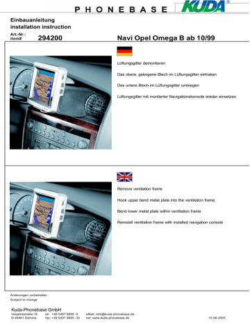Einbauanleitung installation instruction Art.-Nr.: item# 294200 Navi Opel Omega B ab 10/99 Lüftungsgitter demontieren Das obere, gebogene Blech im Lüftungsgitter einhaken Das untere Blech im Lüftungsgitter umbiegen Lüftungsgitter mit montierter Navigationskonsole wieder einsetzen Remove ventilation frame Hook upper bend metal plate into the ventilation frame Bend lower metal plate within ventilation frame Reinstall ventilation frame with installed navigation console Änderungen vorbehalten Subject to change Kuda-Phonebase GmbH Industriestraße 16 D-49401 Damme tel: +49 5491 9695 -0 fax: +49 5491 9695 -30 eMail: [email protected] net: www.kuda-phonebase.de 10.06.2005 Instructions d´ installation instrucciones de instalación art: 294200 Navi Opel Omega B ab 10/99 Démontez grille de buse d´aération Accrochez la tôle supérieure tordée dans la grille de buse d´aération Tordez la tôle inférieure dans la grille de buse d´aération Montez de nouveau la grille de buse d´aération avec la console de navigation déjà installée Desmonte izquierda de ventilación Enganche la chapa superior torcida en la rejilla de ventilación Doble la chapa inferior en la rejilla de ventilación Reinstale la rejilla de ventilación con la consola montada de navegación Nous nous réservons la possibilité de modification Salvo posibles modificaciones Kuda-Phonebase GmbH Industriestraße 16 D-49401 Damme tel: +49 5491 9695 -0 fax: +49 5491 9695 -30 eMail: [email protected] net: www.kuda-phonebase.de 10.06.2005 installatie instructie instrukcja montazu . art: 294200 Navi Opel Omega B ab 10/99 Luchtrooster demonteren Het gebogen metaalstukuk in de ventilatiefilter inhaken Het beneden deel van het metaalstukuk in de ventilatiefilter ombuigen Luchtrooster met bevestigede Navigatiekonsole weer monteren Zdemontowac kratke wylotów powietrza Górna, zagieta blaszke zahaczyc w kratce wylotów powietrza Dolna blaszke zagiac w kratce wylotów powietrza Kratke wylotów powietrza z uchwytem do nawigacji ponownie zamontowac Nous nous réservons la possibilité de modification Salvo posibles modificaciones Kuda-Phonebase GmbH Industriestraße 16 D-49401 Damme tel: +49 5491 9695 -0 fax: +49 5491 9695 -30 eMail: [email protected] net: www.kuda-phonebase.de 10.06.2005