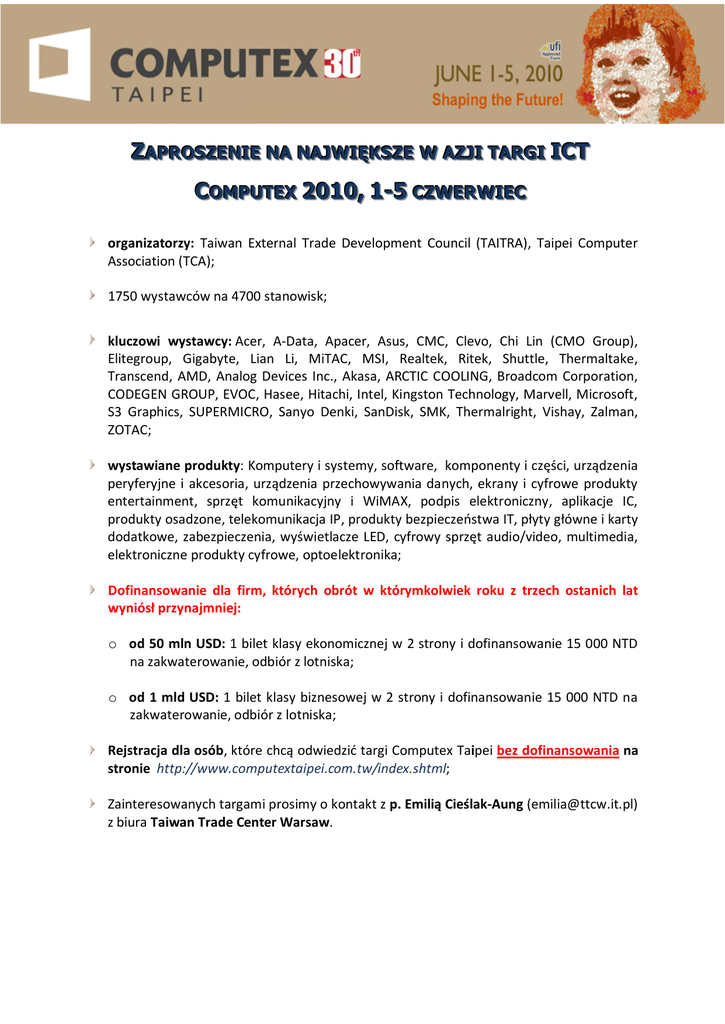 Z ZAAPPRRO OSSZZEEN NIIEE N NA AN NA AJJW WIIĘĘK KSSZZEE W WA AZZJJII TTA AR RG GII IIC CT T C CO OM MP PU UTTEEX X2 20 01 10 0,, 1 1--5 5 CCZZW WEER RW WIIEEC C organizatorzy: Taiwan External Trade Development Council (TAITRA), Taipei Computer Association (TCA); 1750 wystawców na 4700 stanowisk; kluczowi wystawcy: Acer, A-Data, Apacer, Asus, CMC, Clevo, Chi Lin (CMO Group), Elitegroup, Gigabyte, Lian Li, MiTAC, MSI, Realtek, Ritek, Shuttle, Thermaltake, Transcend, AMD, Analog Devices Inc., Akasa, ARCTIC COOLING, Broadcom Corporation, CODEGEN GROUP, EVOC, Hasee, Hitachi, Intel, Kingston Technology, Marvell, Microsoft, S3 Graphics, SUPERMICRO, Sanyo Denki, SanDisk, SMK, Thermalright, Vishay, Zalman, ZOTAC; wystawiane produkty: Komputery i systemy, software, komponenty i części, urządzenia peryferyjne i akcesoria, urządzenia przechowywania danych, ekrany i cyfrowe produkty entertainment, sprzęt komunikacyjny i WiMAX, podpis elektroniczny, aplikacje IC, produkty osadzone, telekomunikacja IP, produkty bezpieczeństwa IT, płyty główne i karty dodatkowe, zabezpieczenia, wyświetlacze LED, cyfrowy sprzęt audio/video, multimedia, elektroniczne produkty cyfrowe, optoelektronika; Dofinansowanie dla firm, których obrót w którymkolwiek roku z trzech ostanich lat wyniósł przynajmniej: o od 50 mln USD: 1 bilet klasy ekonomicznej w 2 strony i dofinansowanie 15 000 NTD na zakwaterowanie, odbiór z lotniska; o od 1 mld USD: 1 bilet klasy biznesowej w 2 strony i dofinansowanie 15 000 NTD na zakwaterowanie, odbiór z lotniska; Rejstracja dla osób, które chcą odwiedzić targi Computex Taipei bez dofinansowania na stronie http://www.computextaipei.com.tw/index.shtml; Zainteresowanych targami prosimy o kontakt z p. Emilią Cieślak-Aung ([email protected]) z biura Taiwan Trade Center Warsaw.