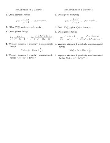 Kolokwium nr 2 Zestaw I 1. Oblicz pochodne funkcji f (x) = x2 tg x x3 + 1 Kolokwium nr 1 Zestaw II 1. Oblicz pochodne funkcji , g(x) = xcos x . f (x) = 1 + x4 x2 ctg x , g(x) = xsin x . 2. Oblicz h00 ( π8 ), gdzie h(x) = 2x sin 4x . 2. Oblicz h00 ( π6 ), gdzie h(x) = 2x cos 3x . 3. Oblicz granice funkcji 3. Oblicz granice funkcji sin2 x x→0 e5x − 5x − 1 lim , x3 + 5x2 + 8x + 4 . x→−2 x3 − 12x − 16 lim e4x − 4x − 1 x→0 sin2 x lim , x3 − 12x + 16 . x→2 x3 − 5x2 + 8x − 4 lim 4. Wyznacz ekstrema i przedziały monotoniczności 4. Wyznacz ekstrema i przedziały monotoniczności funkcji funkcji 1 1 f (x) = 4x − 3 ln x + . f (x) = 6x − 5 ln x + . x x 5. Wyznacz ekstrema i przedziały monotoniczności 5. Wyznacz ekstrema i przedziały monotoniczności funkcji f (x) = (x4 + 4x3 )e−x . funkcji f (x) = (x5 + 5x4 )e−x .