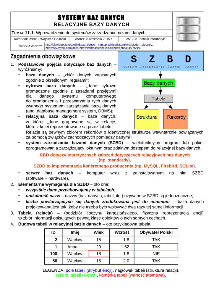 SYST EM Y BA Z D ANYC H RELACYJNE BAZY DANYCH TEMAT 11-1: Wprowadzenie do systemów zarządzania bazami danych. Autor dokumentu: Wojciech Galiński ŹRÓDŁA WIEDZY: wtorek, 8 września 2015 r. 351203 Technik informatyk http://pl.wikipedia.org/wiki/Baza_danych, http://pl.wikipedia.org/wiki/Model_relacyjny, http://dev.mysql.com/doc/, http://webmaster.helion.pl/index.php/kurs-mysql. Zagadnienia obowiązkowe 1. Podstawowe pojęcia dotyczące baz danych – wyróżniamy: • baza danych – „zbiór danych zapisanych zgodnie z określonymi regułami”; • cyfrowa baza danych – „dane cyfrowe gromadzone zgodnie z zasadami przyjętymi dla danego systemu komputerowego do gromadzenia i przetwarzania tych danych zwanego systemem zarządzania bazą danych (ang. database management system, DBMS); • relacyjna baza danych – baza danych, w której „dane grupowane są w relacje, które z kolei reprezentowane są przez tabele. Relacje są pewnym zbiorem rekordów o identycznej strukturze wewnętrznie powiązanych za pomocą związków zachodzących pomiędzy danymi”; • system zarządzania bazami danych (SZBD) – wielofunkcyjny program lub pakiet oprogramowania zarządzający lokalnym oraz zdalnym dostępem do relacyjnej bazy danych. RBD dotyczy teoretycznych założeń dotyczących relacyjnych baz danych (np. standardy). SZBD to implementacja konkretnego producenta (np. MySQL, Firebird, SQLite). serwer baz danych – komputer wraz z zainstalowanym na nim SZBD (software + hardware). 2. Elementarne wymagania dla SZBD – oto one: • wszystkie dane przechowujemy w tabelach; • unikalność nazw – nazwy (baz danych, tabel, itd.) używane w SZBD są jednoznaczne; • liczba powtarzających się danych zredukowana jest do minimum – baza danych projektowana jest tak, żeby nie trzeba było wpisywać dwa razy tej samej informacji. 3. Tabela (relacja) – (podzbiór iloczynu kartezjańskiego, fizyczna reprezentacja encji) to zbiór informacji opisujących pewną klasę obiektów o tych samych cechach. 4. Budowa tabeli w relacyjnej bazie danych – oto przykładowa tabela: • ID Imię Wiek Wzrost Obywatel Polski 2 Wacław 15 1.8 TAK 1 Anna 20 1.62 TAK 100 Wacław 18 1.8 NIE 56 Wacław 15 2.0 TAK LEGENDA: pole tabeli (atrybut encji), nagłówek tabeli (struktura relacji), rekord tabeli (krotka), komórka tabeli (wartość atomowa). 5. Pojęcia dotyczące tabel w relacyjnych bazach danych (RBD) – oto one: • komórka tabeli (wartość atomowa) – (ang. atomic value) to zawartość pojedynczej komórki w tabeli bazy danych; • wiersz tabeli (rekord, krotka) – (ang. tuple) lista wartości atomowych instancji obiektu; • kolumna tabeli (atrybut, pole) – (ang. attribute) przechowuje w tabeli pojedynczą cechę encji. Rodzaje atrybutów: ◦ atrybuty identyfikacyjne – identyfikatory naturalne (np. PESEL) i sztuczne (id), ◦ atrybuty deskrypcyjne – opisowe (pozostałe atrybuty, które nie są identyfikatorami); • struktura tabeli – to informacje o budowie tabeli (mi. in. o jej polach, typach pól, kodowaniu oraz innych); • nagłówek tabeli – (przechowuje strukturę relacji) pierwszy wiersz tabeli zawierający nazwy pól (kolumn) tabeli; • związek (relacja pomiędzy tabelami) – (powiązanie pomiędzy atrybutami) powiązanie pomiędzy dwoma polami tabel (przeważnie każde z tych pól jest umieszczone w innej tabeli); 6. Wymagania dla tabeli bazy danych (relacji) w pojedynczej bazie danych – oto one: • unikalność nazw (każdy atrybut relacji ma unikalną nazwę – to samo dotyczy relacji); • każda tabela jest prostokątna (składa się ze stałej liczby wierszy i kolumn); • każdy rekord w jednej tabeli składa się z tej samej liczby wartości (pól) • każdy rekord w jednej tabeli różni się od pozostałych co najmniej 1 wartością (nie ma dwóch identycznych rekordów); • do każdego atrybutu ustalamy typ danych (dotyczy on wszystkich obiektów); • porządek atrybutów w relacji nie jest istotny, • porządek krotek w relacji nie jest istotny i nie jest elementem definicji relacji, • wartości atrybutów są atomowe (elementarne). 7. Podstawowe pojęcia dotyczące projektowania baz danych – wyróżniamy: • encja – (ang. entity) „to reprezentacja wyobrażonego lub rzeczywistego obiektu (grupy obiektów) stosowana przy modelowaniu danych podczas analizy informatycznej” (to coś, co ma cechy). Encje przechowywane są w tabelach. Wśród encji można wyróżnić: ◦ obiekty materialne: ▪ zasoby ludzkie (np. pracownicy, klienci, uczniowie, nauczyciele, dyrektorzy, itd.), ▪ pozostałe zasoby (samochody, budynki, sprzęt komputerowy, książki, oceny); ◦ obiekty niematerialne: ▪ wiedza (stan rachunku bankowego, informacje o polisie ubezpieczeniowej), ▪ zdarzenia (otrzymanie nagrody, urlopu, wypożyczenie lub oddanie książki w bibliotece, przyjęcie na stan lub zdjęcie ze stanu w magazynie); • atrybut (cecha) encji – to najmniejsza i niepodzielna jednostka informacji o encji; • dziedzina – (ang. domain) zbiór dopuszczalnych wartości dla atrybutu encji; • schemat relacji (tabeli bazy danych) - zbiór atrybutów (dla każdego z nich wyznacza się: dziedzinę oraz ograniczenia integralnościowe); • schemat bazy danych – zbiór schematów relacji. Pytania kontrolne 1. 2. 3. 4. Jakie podstawowe pojęcia dotyczące baz danych potrafisz wymienić? Wyjaśnij je. Jaka jest budowa systemu zarządzania relacyjnymi bazami danych? Jakie są wymagania dla SZBD? Czym się różnią pojęcia RBD i SZRBD? Jaka jest budowa tabeli w RBD? Wymień i omów elementy RBD? Jakie są wymagania dla tabel? Zadania 1. Znajdź w Internecie tabelę zgodną z relacyjnym modelem danych i odpowiedz na następujące pytania: a) Co jest encją tej tabeli? Ile i jakie atrybuty tej encji przechowywane są w relacji? b) Ile krotek znajduje się w tej relacji? Ile wartości atomowych znajduje się w relacji? c) Czy dane w tej tabeli powtarzają się i 
