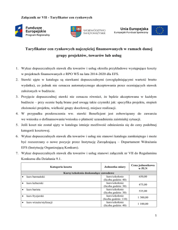 Załącznik nr VII - Taryfikator cen rynkowych Taryfikator cen rynkowych najczęściej finansowanych w ramach danej grupy projektów, towarów lub usług 1. Wykaz dopuszczalnych stawek dla towarów i usług określa przykładowe występujące koszty w projektach finansowanych z RPO WŚ na lata 2014-2020 dla EFS. 2. Stawki ujęte w katalogu są stawkami dopuszczalnymi (uwzględniającymi wartość brutto wydatku), co jednak nie oznacza automatycznego akceptowania przez oceniających stawek założonych w budżecie. 3. Przyjęcie dopuszczalnej stawki nie oznacza również, że będzie akceptowana w każdym budżecie – przy ocenie będą brane pod uwagę takie czynniki jak: specyfika projektu, stopień złożoności projektu, wielkość grupy docelowej, miejsce realizacji. 4. W przypadku przekroczenia ww. stawki Beneficjent jest zobowiązany do zawarcia we wniosku o dofinansowanie/wniosku o płatność uzasadnienia zaistniałej sytuacji. 5. Jeśli koszt nie został ujęty w katalogu istnieje możliwość odniesienia się do ceny podobnej kategorii kosztowej. 6. Wykaz dopuszczalnych stawek dla towarów i usług nie stanowi katalogu zamkniętego i może być rozszerzany o nowe pozycje przez Instytucję Zarządzającą – Departament Wdrażania EFS (Instytucję Organizującą Konkurs). 7. Wykaz dopuszczalnych stawek dla towarów i usług stanowi załącznik nr VII do Regulaminu Konkursu dla Działania 9.1. Kategoria kosztu kurs barmański kurs kelnerski kurs barista kurs fryzjerski kurs wizażu/stylizacji Jednostka miary Kursy/szkolenia doskonalące zawodowe kurs/szkolenie (liczba godzin: 40) kurs/szkolenie (liczba godzin: 30) kurs/szkolenie (liczba godzin: 30) kurs/szkolenie (liczba godzin: 110) kurs/szkolenie (liczba godzin: 40) Cena jednostkowa w PLN 650,00 475,00 535,00 1 300,00 1 100,00 1 szkolenie (szkolenie I stopnia) szkolenie szkolenie Adobe Photoshop (liczba godzin: 20 ) kurs/szkolenie szkolenie księgowość w małej firmie (liczba godzin: 120) kurs/szkolenie kurs operatora obrabiarek/tokarek CNC (liczba godzin:120) kurs kurs opiekun osób starszych (liczba godzin: 80) Kurs prawo jazdy kat. B (liczba godzin: 60) Kurs prawo jazdy kat. C (liczba godzin: 50) kurs/szkolenie kurs spawacza MAG (liczba godzin: 145) kurs/szkolenie kurs spawacza TIG (liczba godzin: 111) kurs/szkolenie kurs projektowanie i aranżacja ogrodów (liczba godzin: 80) kurs/szkolenie florysta (liczba godzin: 50) szkolenie obsługa kas fiskalnych (liczba godzin: 20) kurs operator wózków widłowych - podstawowy (liczba godzin: 67) kurs operator wózków widłowych - rozszerzony (liczba godzin: 40) kurs kurs pierwszej pomocy (liczba godzin: 66) Personel specjalistyczny1 godzina/sesja wynagrodzenie trenera – coaching godzina wynagrodzenie psychologa godzina wynagrodzenie doradcy zawodowego wynagrodzenie pośrednika pracy 1 szkolenie AutoCAD etat 1 170,00 840,00 1 570,00 2 420,00 800,00 1 200,00 1 920,00 1 890,00 2 280,00 1 535,00 960,00 385,00 645,00 820,00 740,00 185,00 95,00 110,00 Wynagrodzenie wynikające z Rozporządzenia Rady Ministrów z dnia 18 listopada 2014 r. w sprawie wynagradzania pracowników samorządowych (DZ. U. 2014 poz. 1786).” Koszty pracy osób w projekcie nie mogą być niższe od minimalnego wynagrodzenia za pracę ustalonego na podstawie art. 2 ust. 3-5 ustawy z dnia 10 Personel projektu niezbędny do realizacji zadań merytorycznych, z wyłączeniem personelu, który zgodnie z Wytycznymi w zakresie kwalifikowalności wydatków w ramach Europejskiego Funduszu Rozwoju Regionalnego, Europejskiego Funduszu Społecznego oraz Funduszu Spójności na lata 2014-2020 ujęty jest w kosztach pośrednich. 2 wynagrodzenie terapeuty wynagrodzenie asystenta osoby niepełnosprawnej/zależnej Wydatki towarzyszące cena uzależniona od cenników operatorów komunikacji publicznej zwrot kosztów dojazdu materiały biurowe dla beneficjentów - zeszyt A4, teczka, zakreślacze, ołówek, długopis, gumka, segregator wynajem/eksploatacja pomieszczeń na usługi doradcze/szkoleniowe (25 miejsc) godzina godzina października 2002 r. o minimalnym wynagrodzeniu za pracę ( Dz.U. Nr 200, poz. 1679, z 2004 r. Nr 240, poz. 2407 oraz 2005 r. Nr 157, 1314) . 100,00 26,00 komplet 35,00 godzina 45,00 catering - przerwa kawowa ( o ile szkolenie trwa co najmniej 4 godziny lekcyjne) osoba 13,00 catering – lunch/obiad/kolacja ( o ile szkolenie trwa co najmniej 6 godzin lekcyjnych) osoba 18,00 sztuka 365,00 sztuka 2 400,00 sztuka 3 380,00 sztuka 2 800,00 sztuka 1 120,00 Sprzęt 2 drukarka lub 3 2 urządzenie wielofunkcyjne lub 3 komputer stacjonarny z systemem operacyjnym lub laptop z systemem operacyjnym 2 lub3 2 3 monitor lub koszt uruchomienia sprzętu informatycznego (instalacja systemu, sterowników, konfiguracja) usługa 100,00 niszczarka2 sztuka 575,00 fipchart2 sztuka 420,00 projektor2 sztuka 2 825,00 tablica suchościeralna2 sztuka 335,00 2 3 Wydatek powinien być kwalifikowalny w ramach projektów w wyjątkowych przypadkach, gdy Wnioskodawca nie posiada wystarczającego zaplecza technicznego (np. projekt jest realizowany przez OPS/PCPR i urządzenia te są niezbędne do prowadzenia zajęć) oraz jest to niezbędny sprzęt do realizacji konkretnego zakresu merytorycznego danego zadania. 3 Wyposażenie stanowiska pracy personelu projektu (z wyłączeniem personelu, który zgodnie z Wytycznymi w zakresie kwalifikowalności wydatków w ramach Europejskiego Funduszu Rozwoju Regionalnego, Europejskiego Funduszu Społecznego oraz Funduszu Spójności na lata 2014-2020 ujęty jest w kosztach pośrednich) jest kwalifikowalne w przypadku spełnienia łącznie następujących warunków: Osoba dla której przeznaczone jest wyposażenie zatrudniona jest na podstawie umowy o pracę w wymiarze co najmniej ½ etatu; Wnioskodawca wskazał we wniosku o dofinansowanie, że nie posiada wystarczającego zaplecza technicznego – wyposażenia stanowiska pracy do realizacji projektu. 2 3
