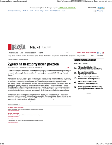 Żyjemy na koszt przyszłych pokoleń http://wyborcza.pl/1,75476,11728922,Zyjemy_na_koszt_przyszlych_pok... ZALOGUJ SIĘ Piano oferuje dzisiaj dostęp do 13 nowych artykułów. JUŻ OD 9,90 ZŁ - KLIKNIJ TUTAJ Strona główna Gazeta.pl Tokfm.pl Poczta Forum Blogi Radio Like WYBORCZA.PL Kraj Świat .BIZ Kultura WYSOKIE OBCASY Nauka Komentarze i opinie Gazeta Wyborcza więcej Zaloguj się 151k Projekt: praca Akcje społeczne SPORT Miasta Ale Historia Duży Format Piątek Ekstra Świąteczny Polityka Ekstra Płatne Wszystkie Gazeta Wyborcza / Nauka / Artykuły WSZYSTKO Tomasz Ulanowski 15.05.2012 , aktualizacja: 15.05.2012 16:49 A PŁATNE AA Ludzkość zużywa rocznie o ponad połowę więcej zasobów, niż nasza planeta jest w stanie odtworzyć. Jak to możliwe? - alarmujący raport WWF "Living Planet Report" Korzystamy z węgla, ropy i gazu "odłożonych" przez Ziemię miliony lat temu, wysyłamy w powietrze coraz więcej zanieczyszczeń i cieplarnianego dwutlenku węgla oraz wycinamy rosnące od dziesiątek lat lasy, bo potrzebujemy drewna. Wykorzystujemy też glebę pod uprawy i hodowlę zwierząt, łowimy za dużo ryb i owoców morza, a także coraz bardziej zabetonowujemy tereny zielone. Według prognoz w połowie wieku dwie trzecie ludzkości będą mieszkać w miastach; dziś mieszczuchów jest prawie połowa. To nasz tzw. ślad ekologiczny. Innymi słowy - żyjemy na koszt dawnych i przyszłych pokoleń. Zaciągamy długi, wykorzystując 150 proc. "rocznego PKB Ziemi". I jeśli ich nie . spłacimy, to zbankrutujemy jak Grecja. . r e k la m a REKLAMY GOOGLE VA Home Loans - $0 Down See If You Qualify For A VA Loan. PreQualify Online In Just 2 Minutes www.VeteransUnited.com Nexus 7 from $229 The 7" tablet from Google with the world's sharpest screen. Buy now. www.google.com/nexus Arrest Records: 2 Secrets 1) Enter Name and State. 2) Access Full Background Checks Instantly. InstantCheckmate.com 1 of 5 10/27/2013 10:23 PM Żyjemy na koszt przyszłych pokoleń http://wyborcza.pl/1,75476,11728922,Zyjemy_na_koszt_przyszlych_pok... Bogaci kontra biedni Według raportu WWF, który wspierają naukowcy z różnych ośrodków, a także m.in. Londyńskie Towarzystwo Zoologiczne i Europejska Agencja Kosmiczna, na każdego człowieka - a przypomnijmy, że jesienią zeszłego roku urodził się siedmiomiliardowy obywatel Ziemi - przypada 1,8 ha. To ziemia, którą w ciągu roku możemy bezpiecznie zagospodarowywać i z której możemy korzystać bez szkody dla całej planety. Tymczasem dziś każdy z nas eksploatuje rocznie średnio 2,7 ha. W Polsce jest to nawet więcej, bo aż 4 ha. Tyle samo ziemi wykorzystuje statystyczny mieszkaniec Europy Zachodniej. Amerykanin potrzebuje jej aż 6 ha (to i tak niezły wynik, bo każdy obywatel USA zużywa średnio dwa razy więcej energii rocznie niż mieszkaniec Unii . Europejskiej). Do tego rosną ślady ekologiczne zostawiane przez Chińczyków, a także mieszkańców innych bardzo ludnych krajów - Indii, Indonezji i Brazylii. REKLAMA Najwięcej ziemi konsumują oczywiście najbogatsi. Żyjemy więc - bo dotyczy to także Polski - nie tylko na koszt poprzednich i przyszłych pokoleń, ale także na koszt mieszkańców biedniejszych rejonów naszej planety. Tym bardziej, że to ich bardziej niż nas dotkną możliwe klęski ekologiczne - raz, bo poradzenie sobie z nimi dużo kosztuje, a dwa, bo klimat panujący w ubogich państwach Afryki, Azji i Ameryki Południowej jest bardziej ekstremalny - upały i susze, ulewy i powodzie - niż u nas. Na razie jednak ludzka zachłanność odciska się piętnem na dzikiej przyrodzie. 2 of 5 10/27/2013 10:23 PM Żyjemy na koszt przyszłych pokoleń http://wyborcza.pl/1,75476,11728922,Zyjemy_na_koszt_przyszlych_pok... Zamów na adres e-mail newslettera z najnowszymi wiadomościami naukowymi! wpisz tutaj swój e-mail Zapisz się Przykładowy newsletter REKLAMA Wielkie wymieranie Raport WWF ostrzega, że co roku wycinamy 13 mln ha lasów (to trochę mniej niż połowa powierzchni Polski), nie oszczędzając przy tym równikowych lasów deszczowych, które produkują tyle tlenu, że nazywa się je płucami Ziemi (lasy pokrywają dziś ciągle 30 proc. powierzchni lądów, czyli blisko 4 mld ha). Od 1970 do 2008 r. liczebność przeszło 9 tys. populacji należących do 2 tys. 688 gatunków ssaków, ptaków, gadów, płazów i ryb, które obserwowali uczeni, zmniejszyła się blisko o jedną trzecią! W tym samym czasie liczba ludzi wzrosła dwukrotnie. Na skraju wyginięcia znalazł się m.in. tygrys - na wolności żyje ledwie 3,5 tys. dorosłych osobników różnych jego podgatunków. Najbardziej drastyczny ubytek zanotowano w populacjach wodnych - śródlądowych i morskich. W 1950 r. światowe polowy ryb morskich wynosiły 19 mln ton; w 2005 r. już 87 mln ton. Zagrożony wyginięciem stał się m.in. niezwykle cenny dla rybaków i smakoszy tuńczyk błękitnopłetwy. W ciągu ostatniego półwiecza populacja bardziej "pospolitej" ryby, bo dorsza atlantyckiego zmniejszyła się o 74 proc. W strefie tropikalnej, która ciągle charakteryzuje się ogromną bioróżnorodnością, spadek liczebności obserwowanych gatunków wynosi aż 61 proc. (70 proc. wśród śródlądowych zwierząt wodnych). Natomiast w strefie umiarkowanej, dzięki projektom ochrony środowiska, zanotowano wzrost o 31 proc. Za to, jak alarmuje WWF, wzrasta nasz ślad ekologiczny. Przede wszystkim dlatego, że rośnie liczba ludzkości - w połowie wieku będzie nas 9 mld - ale także dlatego, że coraz większy jest poziom konsumpcji. W erze globalizacji i błyskawicznego obiegu informacji nie da się już ukryć faktu, że mieszkańcy bogatego Zachodu żyją o niebo lepiej niż biedacy z krajów Trzeciego Świata. Nic więc dziwnego, że ci ostatni coraz częściej próbują przejść przez życie na poziomie Amerykanów. Problem w tym, że Ziemia tego nie uniesie. Jeśli dalej będziemy tak samo brutalnie eksploatować środowisko naturalne, to ja