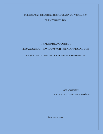 DOLNOŚLASKA BIBLIOTEKA PEDAGOGICZNA WE WROCŁAWIU FILIA W ŚWIDNICY TYFLOPEDAGOGIKA PEDAGOGIKA NIEWIDOMYCH I SŁABOWIDZĄCYCH KSIĄŻKI POLECANE NAUCZYCIELOM I STUDENTOM OPRACOWANIE KATARZYNA GIEDRYS-WOŹNY ŚWIDNICA 2015 1. Bendych, Ewa Przygotowanie dzieci niewidomych do nauki szkolnej / Ewa Bendych, Jadwiga Nowak. - Warszawa : Wydawnictwa Szkolne i Pedagogiczne, 1985. 2. Doroszewska, Janina Pedagogika specjalna. T. 2, Podstawowe problemy teorii i praktyki rewalidacji poszczególnych odchyleń od normy / Janina Doroszewska. - Wrocław : Zakład Narodowy im. Ossolińskich, 1981. 3. Dycht, Marzena Henryk Ruszczyc : pedagogiczne inspiracje / Marzena Dycht. - Warszawa : Wydawnictwo Uniwersytetu Kardynała Stefana Wyszyńskiego, 2012. 4. Dykcik, Władysław Pedagogika specjalna : praca zbiorowa / pod red. Władysława Dykcika ; Uniwersytet im. Adama Mickiewicza w Poznaniu. - Wyd. 5. - Poznań : Wydaw. Naukowe UAM, 2005. 5. Gawlik, Krystyna Wychowanie fizyczne niewidomych i słabo widzących / Krystyna Gawlik, Anna Zwierzchowska ; Akademia Wychowania Fizycznego w Katowicach. - Katowice : Wydawnictwo AWF, 2004. 6. Krzeszowski, Tomasz P. Gdy dziecko niedowidzi : (poradnik dla rodziców i nauczycieli) /Tomasz P. Krzeszowski. - Bydgoszcz : Wydawnictwo Uczelniane Wyższej Szkoły Pedagogicznej w Bydgoszczy, 1993. 7. Kuczyńska-Kwapisz, Jadwiga Dzieci niewidome i słabo widzące / Jadwiga Kuczyńska-Kwapisz. - Wyd. 2 rozsz. i zm. - Warszawa : Centrum Metodyczne Pomocy Psychologiczno-Pedagogicznej, 2004. 8. Lipkowski, Otton Pedagogika specjalna : zarys /Otton Lipkowski. - Wyd. 5. - Warszawa : Państwowe Wydawnictwo Naukowe, 1984. 9. Majewski, Tadeusz Psychologia niewidomych i niedowidzących. – Warszawa : Państwowe Wydawnictwo Naukowe, 1983. 10. Metody Metody pedagogiki specjalnej. – Warszawa : Państwowe Wydawnictwo Naukowe, 1973. 2 11. Nauki Nauki pedagogiczne w teorii i praktyce edukacyjnej. – Red. Józef Kuźma, Janusz Morbitzer. – Kraków : Wydawnictwo naukowe Akademii Pedagogicznej, 2003. 12. Palak, Zofia Uczniowie niewidomi i słabowidzący w szkołach ogólnodostępnych / Zofia Palak.- Lublin : Wydawnictwo Uniwersytetu Marii Curie-Skłodowskiej, 2000. 13. Pedagogika Pedagogika rewalidacyjna/ pod red. Aleksandra Hulka. – Wyd. 3. - Warszawa : Państwowe Wydawnictwo Naukowe, 1988. 14. Pedagogika Pedagogika specjalna dla pracowników socjalnych / pod red. Danuty M. PiekutBrodzkiej i Jadwigi Kuczyńskiej-Kwapisz. - Warszawa : Akademia Pedagogiki Specjalnej im. Marii Grzegorzewskiej, 2004. 15. Pedagogika Pedagogika specjalna wobec potrzeb teraźniejszości i wyzwań przyszłości / pod red. Marii Chodkowskiej. - Lublin : Wydawnictwo Uniwersytetu Marii CurieSkłodowskiej, 1998. 16. Pietrulewicz, Bogdan Rozwój rozumowania przez analogię u dzieci niewidomych w wieku szkolnym / Bogdan Pietrulewicz ; Polska Akademia Nauk. Komitet Nauk Psychologicznych. Wrocław : Zakład Narodowy im. Ossolińskich, 1983. 17. Poradnik Poradnik dydaktyczny dla nauczycieli realizujących podstawę programową w zakresie szkoły podstawowej i gimnazjum z uczniami niewidomymi i słabo widzącymi : praca zbiorowa /pod red. Stanisława Jakubowskiego. - Warszawa : Ministerstwo Edukacji Narodowej, 2001. 18. Sękowska, Zofia Pedagogika specjalna : zarys / Zofia Sękowska. – Warszawa : Państwowe Wydawnictwo naukowe, 1982. 19. Sękowska, Zofia Wprowadzenie do pedagogiki specjalnej / Zofia Sękowska. - Warszawa : Wydawnictwo Wyższej Szkoły Pedagogiki Specjalnej im. Marii Grzegorzewskiej, 1998. 20. Sowa, Józef Pedagogika specjalna w zarysie / Józef Sowa. - Rzeszów : "Fosze", cop. 1997. 3 21. Standardy Standardy postępowania diagnostyczno-orzekająco-rehabilitacyjnego wobec dzieci i młodzieży : poradnik dla pracowników poradni psychologicznopedagogicznych oraz nauczycieli szkół / Ministerstwo Edukacji Narodowej i Sportu. – Warszawa : MENiS, 2005. 22. Tożsamość Tożsamość polskiej pedagogiki specjalnej u progu XXI wieku : materiały z konferencji zorganizowanej z okazji Jubileuszu 75-lecia Wyższej Szkoły Pedagogiki Specjalnej im. Marii Grzegorzewskiej w dniach 7-8 maja 1997 roku / pod red. Jana Pańczyka. - Warszawa : Wydawnictwo Wyższej Szkoły Pedagogiki Specjalnej im. Marii Grzegorzewskiej, 1998. 23. Tyflopedagogika Tyflopedagogika. – Warszawa : Państwowe Wydawnictwo Naukowe, 1981. 24. Uczeń Uczeń niewidomy i słabo widzący w ogólnodostępnej szkole średniej : poradnik dla nauczycieli : praca zbiorowa /pod red. Stanisława Jakubowskiego. - Warszawa : Ministerstwo Edukacji Narodowej i Sportu, 2005. 25. Walthes, Renate Tyflopedagogika / Renate Walthes. - Wyd. 1 w jęz. pol. - Gdańsk : Gdańskie Wydawnictwo Psychologiczne, 2007. 26. Wczesne Wczesne wspomaganie rozwoju dzieci z uszkodzonym wzrokiem z dodatkowymi niepełnosprawnościami : poradnik dla nauczycieli / red. Grażyna Walczak. – Warszawa : MENiS, 2005. 27. Zabłocki, Kazimierz Jacek Dziecko niepełnosprawne, jego rodzina i edukacja / Kazimierz Jacek Zabłocki. Warszawa : Wydawnictwo Akademickie Żak, 1999. 4