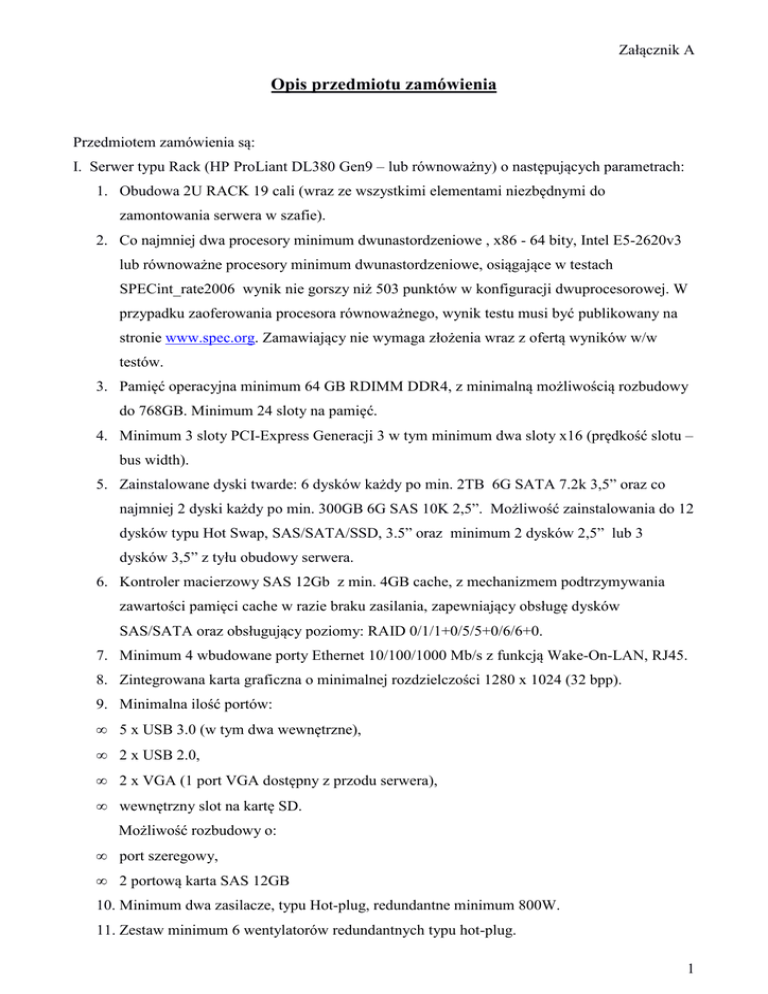 Załącznik A Opis przedmiotu zamówienia Przedmiotem zamówienia są: I. Serwer typu Rack (HP ProLiant DL380 Gen9 – lub równoważny) o następujących parametrach: 1. Obudowa 2U RACK 19 cali (wraz ze wszystkimi elementami niezbędnymi do zamontowania serwera w szafie). 2. Co najmniej dwa procesory minimum dwunastordzeniowe , x86 - 64 bity, Intel E5-2620v3 lub równoważne procesory minimum dwunastordzeniowe, osiągające w testach SPECint_rate2006 wynik nie gorszy niż 503 punktów w konfiguracji dwuprocesorowej. W przypadku zaoferowania procesora równoważnego, wynik testu musi być publikowany na stronie www.spec.org. Zamawiający nie wymaga złożenia wraz z ofertą wyników w/w testów. 3. Pamięć operacyjna minimum 64 GB RDIMM DDR4, z minimalną możliwością rozbudowy do 768GB. Minimum 24 sloty na pamięć. 4. Minimum 3 sloty PCI-Express Generacji 3 w tym minimum dwa sloty x16 (prędkość slotu – bus width). 5. Zainstalowane dyski twarde: 6 dysków każdy po min. 2TB 6G SATA 7.2k 3,5” oraz co najmniej 2 dyski każdy po min. 300GB 6G SAS 10K 2,5”. Możliwość zainstalowania do 12 dysków typu Hot Swap, SAS/SATA/SSD, 3.5” oraz minimum 2 dysków 2,5” lub 3 dysków 3,5” z tyłu obudowy serwera. 6. Kontroler macierzowy SAS 12Gb z min. 4GB cache, z mechanizmem podtrzymywania zawartości pamięci cache w razie braku zasilania, zapewniający obsługę dysków SAS/SATA oraz obsługujący poziomy: RAID 0/1/1+0/5/5+0/6/6+0. 7. Minimum 4 wbudowane porty Ethernet 10/100/1000 Mb/s z funkcją Wake-On-LAN, RJ45. 8. Zintegrowana karta graficzna o minimalnej rozdzielczości 1280 x 1024 (32 bpp). 9. Minimalna ilość portów: • 5 x USB 3.0 (w tym dwa wewnętrzne), • 2 x USB 2.0, • 2 x VGA (1 port VGA dostępny z przodu serwera), • wewnętrzny slot na kartę SD. Możliwość rozbudowy o: • port szeregowy, • 2 portową karta SAS 12GB 10. Minimum dwa zasilacze, typu Hot-plug, redundantne minimum 800W. 11. Zestaw minimum 6 wentylatorów redundantnych typu hot-plug. 1 12. Wsparcie dla Systemów Operacyjnych i Systemów Wirtualizacyjnych: • Microsoft Windows Server minimum w wersji 2012, • Canonical Ubuntu, • Red Hat Enterprise Linux (RHEL), • SUSE Linux Enterprise Server (SLES), • Vmware, • Citrix XenServer. 13. Zabezpieczenia: • Power-on password, • Serial interface control, • Administrator's password, • UEFI, • Serwer musi być wyposażony w kartę zdalnego zarządzania (dostępu do konsoli) pozwalającej na: restart serwera, włączenie, wyłączenie oraz podgląd logów sprzętowych serwera i karty, dostęp i pełną kontrolę serwera niezależnie od miejsca i jego stanu (także podczas startu, restartu systemu). 14. Zgodność ze standardami; • ACPI 2.0b Compliant, • PCIe 3.0 Compliant, • PXE Support, • WOL Support, • Microsoft® Logo certifications, • USB 3.0 Support, • USB 2.0 Support, • Energy Star. 15. Gwarancja minimum 3 lata z czasem reakcji NBD 9x5 uszkodzone dyski pozostają u klienta, z możliwością przedłużenia na dalszy okres. 16. Dodatkowe oprogramowanie: • VMware vSphere Essentials 3 Year, • Windows Serwer Standard 2012 oraz 100 licencji dostępowych dla użytkownika (CAL). II. Dowóz i montaż serwera w szafie Rack w siedzibie zamawiającego. 2 III. Pełna instalacja, konfiguracja, wdrożenie i dostosowanie sprzętu i oprogramowania niezbędne do wszczęcia pracy produkcyjnej w Starostwie Powiatowym w Nowym Tomyślu, oraz minimum dwudniowe szkolenie z zakresu obsługi sprzętu i oprogramowania zakupionego wraz z serwerem (Pkt I. Ppkt. 16). Pozostałe informacje 1. Zamówione wraz z serwerem oprogramowanie musi posiadać wszystkie atrybuty pełnych wersji legalnego oprogramowania producenta sprzętu, aplikacji Microsoft oraz VMware. 2. Serwer wraz z oprogramowaniem musi być przekazany w oryginalnych opakowaniach producenta oraz zawierać komplet okablowania niezbędnego do ich podłączenia. 3. Wszystkie urządzenia muszą być fabrycznie nowe, nie starsze niż 6 miesięcy od daty zakupu. 3