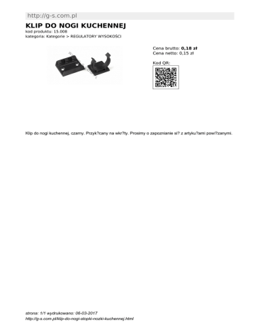 http://g-s.com.pl KLIP DO NOGI KUCHENNEJ kod produktu: 15.008 kategoria: Kategorie > REGULATORY WYSOKOŚCI Cena brutto: 0,18 zł Cena netto: 0,15 zł Kod QR: Klip do nogi kuchennej, czarny. Przyk?cany na wkr?ty. Prosimy o zapoznianie si? z artyku?ami powi?zanymi. strona: 1/1 wydrukowano: 06-03-2017 http://g-s.com.pl/klip-do-nogi-stopki-nozki-kuchennej.html