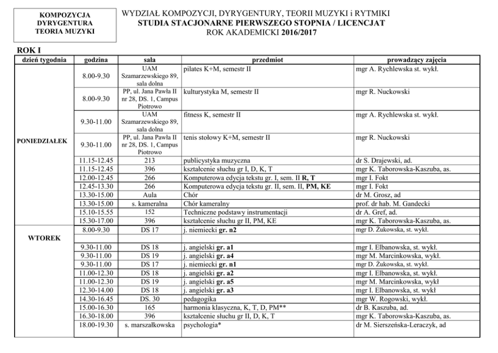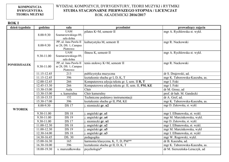 KOMPOZYCJA DYRYGENTURA TEORIA MUZYKI WYDZIAŁ KOMPOZYCJI, DYRYGENTURY, TEORII MUZYKI i RYTMIKI STUDIA STACJONARNE PIERWSZEGO STOPNIA / LICENCJAT ROK AKADEMICKI 2016/2017 ROK I dzień tygodnia godzina 8.00-9.30 8.00-9.30 9.30-11.00 PONIEDZIAŁEK 9.30-11.00 pilates K+M, semestr II prowadzący zajęcia mgr A. Rychlewska st. wykł. kulturystyka M, semestr II mgr R. Nuckowski fitness K, semestr II mgr A. Rychlewska st. wykł. tenis stołowy K+M, semestr II mgr R. Nuckowski publicystyka muzyczna kształcenie słuchu gr I, D, K, T Komputerowa edycja tekstu gr. I, sem. II R, T Komputerowa edycja tekstu gr. II, sem. II, PM, KE Chór Chór kameralny Techniczne podstawy instrumentacji kształcenie słuchu gr II, PM, KE j. niemiecki gr. n2 dr S. Drajewski, ad. mgr K. Taborowska-Kaszuba, as. mgr I. Fokt mgr I. Fokt dr M. Grosz, ad prof. dr hab. M. Gandecki dr A. Gref, ad. mgr K. Taborowska-Kaszuba, as. j. angielski gr. a1 j. angielski gr. a4 j. niemiecki gr. n1 j. angielski gr. a2 j. angielski gr. a5 j. angielski gr. a3 pedagogika harmonia klasyczna, K, T, D, PM** kształcenie słuchu gr II, D, K, T psychologia* mgr I. Elbanowska, st. wykł. mgr M. Marcinkowska, wykł. sala UAM Szamarzewskiego 89, sala dolna PP, ul. Jana Pawła II nr 28, DS. 1, Campus Piotrowo UAM Szamarzewskiego 89, sala dolna PP, ul. Jana Pawła II nr 28, DS. 1, Campus Piotrowo 11.15-12.45 11.15-12.45 12.00-12.45 12.45-13.30 13.30-15.00 13.30-15.00 15.10-15.55 15.30-17.00 8.00-9.30 213 396 266 266 Aula s. kameralna 9.30-11.00 9.30-11.00 9.30-11.00 11.00-12.30 11.00-12.30 12.30-14.00 14.30-16.45 15.00-16.30 16.30-18.00 18.00-19.30 DS 18 DS 19 DS 17 DS 18 DS 19 DS 18 DS. 30 165 396 s. marszałkowska 152 396 DS 17 przedmiot mgr D. Żukowska, st. wykł. WTOREK mgr D. Żukowska, st. wykł. mgr I. Elbanowska, st. wykł. mgr M. Marcinkowska, wykł mgr I. Elbanowska, st. wykł mgr W. Rogowski, wykł. dr B. Kaszuba, ad. mgr K. Taborowska-Kaszuba, as. dr M. Sierszeńska-Leraczyk, ad 2 ŚRODA 8.30-10.00 10.15-11.45 12.00-13.30 13.45-15.15 15.30-16.15 16.30-18.00 18.00-19.30 19.30-21.45 9.15-10.45 CZWARTEK 9.45-10.30 10.30-12.15 13.30-15.00 15.00-16.30 17.45-20.00 8.00-9.30 PIĄTEK 9.30-11.00 11.00-12.30 9.00-13.00 12.30-14.00 14.15-15.45 *- studium pedagogiczne 213 211 211 383 203 A 362 XII, LO, ul. Kutrzeby 8 przy (WNSHID) DS 30 seminarium teorii muzyki, T Kontrapunkt Kształcenie słuchu, gr I techniki kompozytorskie XX i XXI w. mgr M. Majewska, as. Historia muzyki elektroakustycznej sem. I Harmonia klasyczna, plus R piłka nożna, semestr II dr R. Zapała, ad. dr B. Kaszuba, ad. mgr R. Nuckowski Pedagogika mgr W. Rogowski, wykł. POSiR Oddział pływanie (K+M) , semestr II Chwiałka, ul. Chwiałkowskiego 34 s. marszałkowska historia muzyki powszechnej s. marszałkowska Literatura muzyczna s. kameralna Aula DS 30 DS 30 DS 30 203A s. błękitna 152 165 mgr J. Zieleniak, st. wykł. mgr J. Zieleniak, st. wykł. dr hab. M. Kędziora, prof. AM mgr A. Rychlewska, st. wykł. / mgr R. Nuckowski dr J. Gołębiowska/mgr M. Majewska, as. dr J. Gołębiowska/mgr M. Majewska, as. Chór kameralny Chór Pedagogika * dydaktyka ogólna, gr I, semestr II dydaktyka ogólna, gr II, semestr II Muzyka elektroniczna I KE orkiestra dla dyrygentów (9 spotkań) D Nauka o muzyce, PM, KE prof. dr hab. M. Gandecki dr M. Grosz, ad mgr W. Rogowski, st. wykł. dr. M. Leszkowicz dr. M. Leszkowicz mgr W. Kaszuba dr J. Chrenowicz, as. dr A. Kamińska-Rykowska Analiza form muzycznych, T, K, D dr E. Rzanna-Szczepaniak, ad. ** - specjalizacja publicystyka muzyczna w ramach specjalności teoria muzyki 3 ROK II dzień tygodnia PONIEDZIAŁEK WTOREK ŚRODA CZWARTEK PIĄTEK godzina 8.00-9.30 9.30-11.00 9.30-11.00 9.30-11.00 11.00-12.30 11.00-12.30 11.00-12.30 15.30-17.00 12.15-13.45 13.50-14.35 8.00-9.30 11.00-12.30 14.30-16.00 15.30-16.00 16.30-18.00 8.30-9.15 9.15-10.00 10.00-11.30 16.30-18.00 9.00-13.00 9.30-10.15 9.30-10.15 10.20-11.50 11.50-12.20 *- studium pedagogiczne sala DS 19 DS 17 DS 18 DS 19 DS 18 DS 17 DS 19 152 383 383 152 383 213 203 A Szkoła Muzyczna ul. Bydgoska 4, sala A 302 211 211 211 57 s. błękitna 362 362 362 362 przedmiot prowadzący zajęcia j. angielski gr. a1 j. niemiecki gr. n2 j. angielski gr. a2 j. angielski gr. a4 j. angielski gr. a3 j. niemiecki gr. n1 j. angielski gr. a5 harmonia XX i XXI literatura muzyczna historia muzyki powszechnej mgr E. Fójcik, wykł. mgr D. Żukowska, st. wykł. Analiza form muzycznych, T, K, D kontrapunkt, T, K, D seminarium teorii muzyki, T dr E. Rzanna-Szczepaniak, ad. dr hab. M. Kędziora, prof. AM mgr M. Majewska, as. Historia muzyki elektroakustycznej metodyka nauczania przedmiotu audycje muzyczne, sem. IV dr R. Zapała, ad. mgr B. Szeligowska-Wojtecka, st. wykł. historia muzyki komputerowej, K, T komputerowa edycja nut kontrapunkt rytmika Techniki kompozytorskie XX i XXI w. orkiestra dla dyrygentów (9 spotkań) D Metodyka nauczania przedmiotu harmonia sem. III/ Metodyka nauczania przedmiotu kształcenie słuchu sem. IV kształcenie słuchu gr I KE kształcenie słuchu gr II mgr J. Zieleniak, st. wykł. mgr J. Zieleniak, st. wykł. mgr J. Zieleniak, st. wykł. dr hab. A. Kroschel, ad. dr J. Chrenowicz, as. dr A. Zdrojek-Suchodolska, ad. dr A. Zdrojek-Suchodolska, ad. mgr I. Elbanowska, st. wykł. mgr E. Fójcik, wykł. mgr I. Elbanowska, st. wykł. mgr D. Żukowska, st. wykł. mgr E. Fójcik, wykł. prof. dr hab. Z. Kozub dr M. Rykowski, ad. dr M. Rykowski, ad. dr A. Zdrojek-Suchodolska, ad. dr A. Zdrojek-Suchodolska, ad. 4 ROK III dzień tygodnia godzina sala przedmiot prowadzący zajęcia 11.00.-12.30 165 seminarium muzyki polskiej, sem. V dr Janina Tatarska, prof. AM 8.15-9.00 57 metodyka nauczania przedmiotu historia muzyki mgr A. Łodygowska 10.45-12.15 14.00-15.30 152 396 152 dr J. Gołębiowska, ad mgr K. Taborowska-Kaszuba, as. mgr M. Kusz 57 Seminarium muzyki polskiej, sem. VI kształcenie słuchu semestr V metodyka nauczania przedmiotu zasady muzyki z elementami komputerowej edycji nut, semestr VI metody
