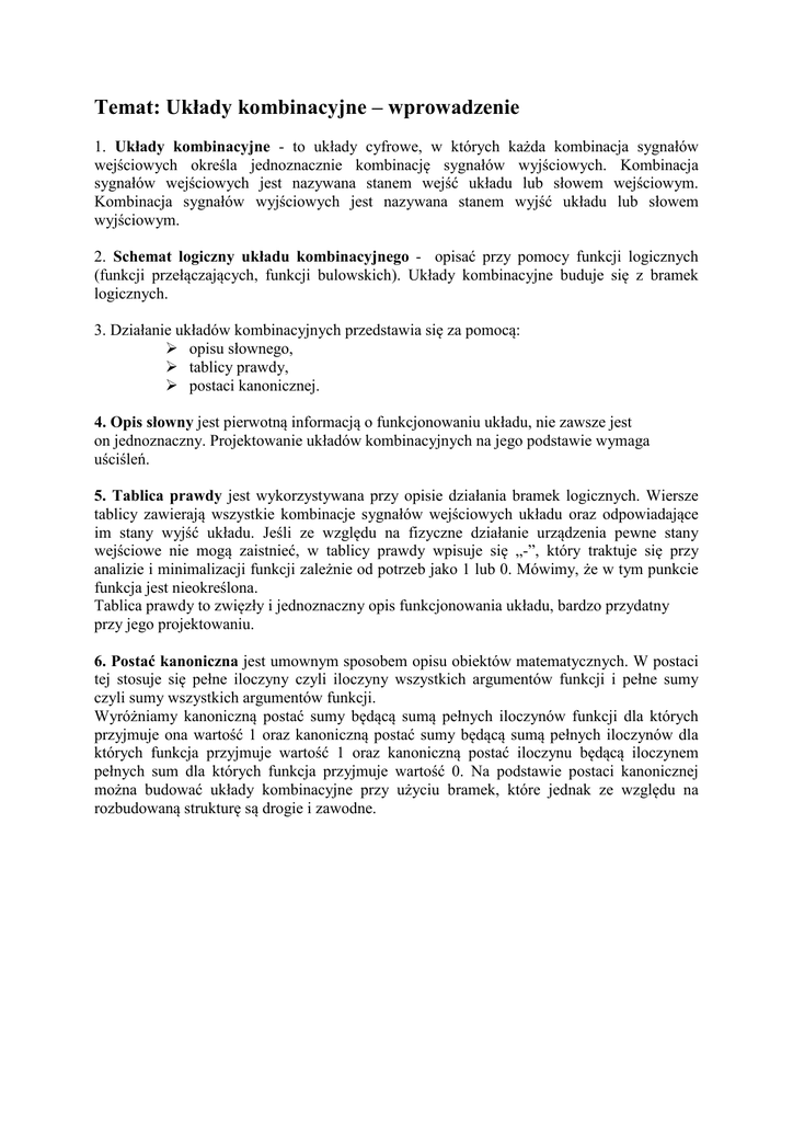 Temat: Układy kombinacyjne – wprowadzenie 1. Układy kombinacyjne - to układy cyfrowe, w których każda kombinacja sygnałów wejściowych określa jednoznacznie kombinację sygnałów wyjściowych. Kombinacja sygnałów wejściowych jest nazywana stanem wejść układu lub słowem wejściowym. Kombinacja sygnałów wyjściowych jest nazywana stanem wyjść układu lub słowem wyjściowym. 2. Schemat logiczny układu kombinacyjnego - opisać przy pomocy funkcji logicznych (funkcji przełączających, funkcji bulowskich). Układy kombinacyjne buduje się z bramek logicznych. 3. Działanie układów kombinacyjnych przedstawia się za pomocą: opisu słownego, tablicy prawdy, postaci kanonicznej. 4. Opis słowny jest pierwotną informacją o funkcjonowaniu układu, nie zawsze jest on jednoznaczny. Projektowanie układów kombinacyjnych na jego podstawie wymaga uściśleń. 5. Tablica prawdy jest wykorzystywana przy opisie działania bramek logicznych. Wiersze tablicy zawierają wszystkie kombinacje sygnałów wejściowych układu oraz odpowiadające im stany wyjść układu. Jeśli ze względu na fizyczne działanie urządzenia pewne stany wejściowe nie mogą zaistnieć, w tablicy prawdy wpisuje się „-”, który traktuje się przy analizie i minimalizacji funkcji zależnie od potrzeb jako 1 lub 0. Mówimy, że w tym punkcie funkcja jest nieokreślona. Tablica prawdy to zwięzły i jednoznaczny opis funkcjonowania układu, bardzo przydatny przy jego projektowaniu. 6. Postać kanoniczna jest umownym sposobem opisu obiektów matematycznych. W postaci tej stosuje się pełne iloczyny czyli iloczyny wszystkich argumentów funkcji i pełne sumy czyli sumy wszystkich argumentów funkcji. Wyróżniamy kanoniczną postać sumy będącą sumą pełnych iloczynów funkcji dla których przyjmuje ona wartość 1 oraz kanoniczną postać sumy będącą sumą pełnych iloczynów dla których funkcja przyjmuje wartość 1 oraz kanoniczną postać iloczynu będącą iloczynem pełnych sum dla których funkcja przyjmuje wartość 0. Na podstawie postaci kanonicznej można budować układy kombinacyjne przy użyciu bramek, które jednak ze względu na rozbudowaną strukturę są drogie i zawodne.