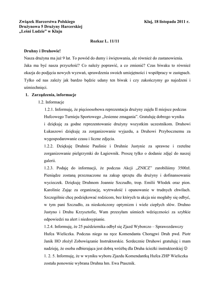 Związek Harcerstwa Polskiego DruŜynowa 5 DruŜyny Harcerskiej „Leśni Ludzie” w Kłaju Kłaj, 18 listopada 2011 r. Rozkaz L. 11/11 Druhny i Druhowie! Nasza druŜyna ma juŜ 9 lat. To powód do dumy i świętowania, ale równieŜ do zastanowienia. Jaka ma być nasza przyszłość? Co naleŜy poprawić, a co zmienić? Czas biwaku to równieŜ okazja do podjęcia nowych wyzwań, sprawdzenia swoich umiejętności i współpracy w zastępach. Tylko od nas zaleŜy jak bardzo będzie udany ten biwak i czy zakończymy go najedzeni i uśmiechnięci. 1. Zarządzenia, informacje 1.2. Informacje 1.2.1. Informuję, Ŝe pięcioosobowa reprezentacja druŜyny zajęła II miejsce podczas Hufcowego Turnieju Sportowego „Jesienne zmagania”. Gratuluję dobrego wyniku i dziękuję za godne reprezentowanie druŜyny wszystkim uczestnikom. Druhowi Łukaszowi dziękuję za zorganizowanie wyjazdu, a Druhowi Przybocznemu za wygospodarowanie czasu i liczne zdjęcia. 1.2.2. Dziękuję Druhnie Paulinie i Druhnie Justynie za sprawne i rzetelne zorganizowanie pielgrzymki do Łagiewnik. Proszę tylko o dodanie zdjęć do naszej galerii. 1.2.3. Podaję do informacji, Ŝe podczas Akcji „ZNICZ” zarobiliśmy 3500zł. Pieniądze zostaną przeznaczone na zakup sprzętu dla druŜyny i dofinansowanie wycieczek. Dziękuję Druhnom Joannie Szczudło, trop. Emilii Włodek oraz pion. Karolinie Zając za organizację, wytrwałość i opanowanie w trudnych chwilach. Szczególnie chcę podziękować rodzicom, bez których ta akcja nie mogłaby się odbyć, w tym pani Szczudło, za nieskończony optymizm i wiele ciepłych słów. Druhno Justyno i Druhu Krzysztofie, Wam przesyłam uśmiech wdzięczności za szybkie odpowiedzi na alert i niedosypianie. 1.2.4. Informuję, Ŝe 25 października odbył się Zjazd Wyborczo – Sprawozdawczy Hufca Wieliczka. Podczas niego na ręce Komendanta Chorągwi Druh pwd. Piotr Janik HO złoŜył Zobowiązanie Instruktorskie. Serdecznie Druhowi gratuluję i mam nadzieję, Ŝe osoba odbierająca jest dobrą wróŜbą dla Druha ścieŜki instruktorskiej ☺ 1. 2. 5. Informuję, Ŝe w wyniku wyboru Zjazdu Komendantką Hufca ZHP Wieliczka została ponownie wybrana Druhna hm. Ewa Ptasznik. 1.2.6. Informuję, Ŝe 5 listopada miał miejsce wyjazd na balet „Kopciuszek” do Opery Krakowskiej zorganizowany przez Druhnę Przyboczną trop. Emilię Włodek. Dziękuję Druhnie za zaradność i „ukulturalnienie” druŜyny. 1.2.7. Informuję, Ŝe w dniach 5 i 6 listopada członkowie naszej druŜyny współpracowali z instruktorami kursu kwalifikowanej pierwszej pomocy i pomogli w przeprowadzeniu symulacji dla kursantów z OSP w Kłaju. Za pocięte i zakrwawione ubrania, zdzieranie gardła i wyśmienitą grę aktorską serdecznie dziękuję: • dh. Jakubowi Balikowi, • pwd. Piotrowi Janikowi HO, • dh. Justynie Płotek, • dh. Krzysztofowi Szczudło, • pion. Karolinie Zając. 2. Uchwały 2.3. Mianowania 2.3.2. Mianowania funkcyjnych. 2.3.2.1. Mianuję kwatermistrzem Urodzinowego Biwaku DruŜyny Dh. wyw. Tomasza Pagacza. Oby kuchnia nie była dla Druha duŜym wyzwaniem! 2.3.2.2. Mianuję oboźnym Urodzinowego Biwaku DruŜyny Dh. wyw. Macieja Włodarczyka. Niech Druh dopilnuje by zsynchronizować zegarki po apelu. 2.3.2.3. Mianuję instruktorem programowym Urodzinowego Biwaku DruŜyny Dh. pion. Karolinę Zając. Niech czas będzie po Druhny stronie ☺ 2.3.2.4. Mianuję instruktorami pomocniczymi Urodzinowego biwaku DruŜyny Druhny i Druhów: phm. Katarzynę Laskowicz, trop. Emilię Włodek, Dh. Joannę Szczudło, pwd. Piotra Janika HO, ćw. Michała śaczka. 2.3.2.5 Mianuję odpowiedzialnym za przygotowanie śniadania w dniu jutrzejszym zastęp Grizzly. Powodzenia! 2.5. Stopnie, sprawności. 2.5.1. Przyznaję sprawność „Rowerzystki” dh. Katarzynie Kosak. 2.5.2. Przyznaję sprawność „Znawcy musztry” wyw. Tomaszowi Pagaczowi. 2.5.3. Przyznaję sprawność „Opiekunki Betlejemskiego Światła Pokoju” dh. Paulinie Ślusarczyk. 2.5.4. Przyznaję sprawność „Terenoznawcy” pion. Karolinie Zając. Przepraszam wymienione wyŜej Druhny i Druha za zaistniałe zamieszanie, w wyniku którego zdobyte stopnie nie zostały przyznane rozkazem we właściwym czasie. Zrobię wszystko by takie sytuacje juŜ się nie powtórzyły. 2.5.5. Zaliczam zadanie zespołowe „Akcja ZNICZ” Druhom i Druhnom: • dh. Dominikowi Antończykowi, • dh. Annie Buczek, • dh. Jakubowi Balikowi, • dh. Weronice Bzdyl, • dh. Michałowi Cebeńce, • dh. Michałowi CzyŜowi, • dh. Kamili Duchnik, • dh. Monice Filipiec, • dh. Dominikowi Garści, • dh. Piotrowi Janikowi, • dh. Katarzynie Jędrzejczyk, • dh. Paulinie Korbut, • dh. Kindze Kosak, • dh. Weronice Kowalskiej, • dh. Wiktorii Kowal, • dh. Łukaszowi Kmiecikowi, • dh. Sylwestrowi Łachowi, • dh. Emilii Majerz, • dh. Stanisławowi Margielewskiemu, • dh. Wiktorowi Maziarzowi, • dh. Arturowi Mieńkowskiemu, • dh. Jakubowi Mięso, • dh. Tomaszowi Pagaczowi, • dh. Justynie Płotek, • dh. Łukaszowi Skłodowskiemu, • dh. Joannie Szczudło, • dh. Krzysztofowi Szczudło, • dh. Paulinie Ślusarczyk, • dh. Darii Ślusarczyk, • dh. Annie Turkiewicz, • dh. Maćkowi Włodarczykowi, • dh. Emilii Włodek, • dh.. Wiktorowi Wikt Zachłowskiemu, • dh.. Karolinie Karo Zając, • dh.. Michałowi Mich śaczkowi. 2.5.6. Otwieram m próbę pró na stopień odkrywcy Druhowi Michałow owi Cebeńko – opiekun próby pwd. Agnieszk gnieszka Pagacz HO. 2.5.7.. Otwieram am próbę pr harcerki i przyjmuję do zastępu „Jasz „Jaszczurki” dh. Klaudię Korbut. śyczę wytrwałości wytrw i wielu radosnych chwil na harcerskim cerskim szlaku. 2.6. Nadanie nazw zastęępom. 2.6.1. Nadaję nazwę nazw „Jaszczurki” próbnemu zastępowi Ŝeński skiemu. Oby wszystkie Druhny były tak ak szybkie szy i zwinne! 2.6.2. Nadaję nazwę nazw „Dzięcioły” próbnemu zastępowi męsk skiemu. Pracujcie nad Waszymi umiejętno tności