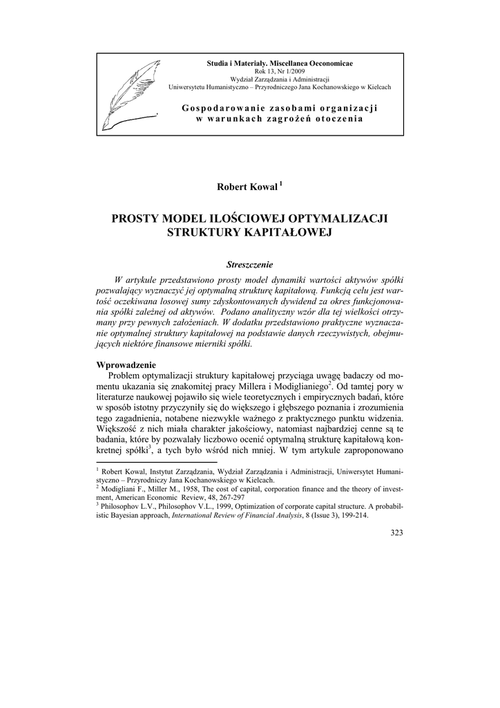 Problem optymalizacji struktury kapitałowej przyciąga uwagę badaczy od momentu ukazania się znakomitej pracy Millera i Modiglianiego2. Od tamtej pory w