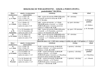 REKOLEKCJE WIELKOPOSTNE - SZKOŁA PODSTAWOWA poniedziałek 7.04.2014r. klasa / zajęcia z wyznaczonym wychowawca nauczycielem l.1 p. A. Fajer s.38 1a p. A. Fajer l.2 p. A. Fajer s.38 zejście do szatni o 9.30 1b p. I. Kłoda l.1 p. I. Kłoda s.35 l.2 p. I. Kłoda s.35 zejście do szatni o 9.30 2a p. M. Kumańska 2b p. M. Gibała l.1 p. M. Kumańska s.40 l.2 p. M. Kumańska s.40 zejście do szatni o 9.30 l.1 p. M. Gibała s.30 l.2 p. M. Gibała s.30 zejście do szatni o 9.30 klasa / zajęcia z wyznaczonym wychowawca nauczycielem l.3 p. A. Kała s.38 3a l.4 p. A. Kała s.38 p. A. Kała zejście do szatni o 11.25 l.3 p. B. Dudek s.36 3b p. B. Dudek l.4 p. B. Dudek s.36 zejście do szatni o 11.25 3c p. M. Warchoł l.3 p. M. Warchoł s.40 l.4 p. M. Warchoł s.40 zejście do szatni o 11.25 rekolekcje 9.40 – wyjście do kościoła, 9.50-11.20 opieka w kościele, powrót do szkoły ok. 11.30 \ p. M. Skorupka trening obiad NP - odwołana 11.30 dyżur jadalnia 9.40 – wyjście do kościoła – p. I. Kłoda zaj. sport. odwołane 9.50-10.40 opieka w kościele – p. I. Kłoda p.E. Małkow 10.40-11.20 opieka w kościele, powrót do szkoły p. E. Małkow ok. 11.30 p. M. Skorupka 9.40 – wyjście do kościoła, 9.50-11.20 opieka zaj. sport. i NP odwołane w kościele – p. M. Kumańska , powrót do szkoły p. M. Kumańska ok. 11.30 9.40 – wyjście do kościoła, 9.50-10.40 opieka NP - odwołana w kościele – p. M. Gibała, 10.40-11.20 opieka w kościele – p. T. Urbańska, powrót do szkoły ok. 11.30 Obiad dla dzieci z kl. 1 i 2SP, które zostają w świetlicy ok. godz. 11.45 opieka; p. E. Małkow rekolekcje trening obiad 11.35 – wyjście do kościoła, 11.45-13.15 t. sportowy - odwołany opieka w kościele – p. A. Kała, powrót do szkoły p. A. Kała ok. 13.20 11.35 – wyjście do kościoła, 11.45-12.30 t. sportowy - odwołany opieka w kościele – p. B. Dudek 12.30-13.15 opieka w kościele- p. J. Mayerberg powrót do szkoły świetlica ok. 13.30 11.35 – wyjście do kościoła, 11.45-12.30 t. sportowy - odwołany opieka w kościele – p. M. Warchoł 12.30-13.15 opieka w kościele, powrót do szkoły p. C. Miernik ok. 13.30 13.25 dyżur jadalnia p. J. Mayerberg p. C. Miernik 4a p. J. Nowak 4b p. A. Maciborek l.3 p. A. Sanak s. 30 l.4 p. J. Nowak s. 53 zejście do szatni o 11.25 l.3 p. I. Turza s. 57 l.4 p. A. Maciborek s.51 zejście do szatni o 11.25 11.35 – wyjście do kościoła,, 11.45-13.15 opieka w kościele, powrót do szkoły p. I. Moskała, p.A. Stańczyk ok. 13.30 11.35 – wyjście do kościoła i opieka w kościele 11.45-13.15, powrót do szkoły ok. 13.30 - p. S. Złahoda t. sportowy - odwołany t. sportowy – odwołany t. łyżw. wg planu 13.40 dyżur jadalnia p. I. Moskała, p. A. Stańczyk Obiad dla dzieci z kl. 3 i 4SP, które zostają w świetlicy ok. godz. 13.40 opieka: p. Z. Dyczkowski klasa / rekolekcje wychowawca 7.50 wyjście do kościoła, 8.00-9.30 opieka 5a w kościele - p. E. Kowalska, p. E. Kowalik p. M. Wojtulewicz powrót do szkoły ok. 9.35 + dyżur w szatni , autobus na basen 9.45 7.50 wyjście do kościoła, 8.00-9.30 opieka 5b p. E. Fuczek w kościele p. A. Sanak, powrót do szkoły ok. 9.40 7.50 wyjście do kościoła, 8.00-9.30 opieka 6a p. I. Turza p. I. Turza, powrót do szkoły ok. 9.35 + dyżur w szatni, autobus na basen 9.45 7.50 wyjście do kościoła, 8.00-9.30 opieka 6b p. E. Wasiela w kościele p. E. Wasiela, powrót do szkoły ok. 9.35 + dyżur w szatni, autobus na basen 9.45 zajęcia sportowe 9.50-11.30 p. J. Stańczyk, p. M. Wojtulewicz, 11.30-11.50 dyżur w szatni, autobus do szkoły o 11.50 odwołane 9.50-11.30 p. K. Jakubik., p. M. Strzała 11.30-11.50 dyżur w szatni, autobus do szkoły o 11.50 9.45-11.30 p. M. Jarosz sala gim. 9.50-11.30 p. K. Jakubik., p. M. Strzała 11.30-11.50 dyżur w szatni, autobus do szkoły o 11.50 zajęcia z wyznaczonym nauczycielem - l.3 – p. S. Złahoda s. 46 l.4 – p. I. Turza s. 57 - - obiad 12.00 dyżur jadalnia p. J. Stańczyk, p. J.M. Strzała REKOLEKCJE WIELKOPOSTNE – GIMNAZJUM poniedziałek 7.04.2014r. klasa / wychowawca Ia 8.20-13.30 p. M. Cyganik Ib 8.20-13.30 p. A. Patyk Ic 8.20-13.30 p. B. Król IIa 8.20-13.30 p. A. Chodacka IIb 8.20-13.30 p. M. Małysiak rekolekcje 8.20 wyjście do kościoła, 8.30-9.30 opieka w kościele, przejście do OCK – p. M. Cyganik, 9.30-11.15 OCK film, powrót do szkoły ok. 11.20 – p. M. Cyganik 8.20 wyjście do kościoła, 8.30-9.30 opieka w kościele, przejście do OCK – p. A. Nasiłowska, 9.30-11.15 OCK film, powrót do szkoły ok. 11.20 – p. A.Patyk, 8.20 wyjście do kościoła, 8.30-9.30 opieka w kościele, przejście do OCK – p. B. Król 9.30-11.15 OCK film, powrót do szkoły ok. 11.20 – p. B. Król 8.20 wyjście do kościoła, 8.30-9.30 opieka w kościele, przejście do OCK – p. K. Głozak-Zeman 9.30-11.15 OCK film, powrót do szkoły ok. 11.20 – J. Baruś 8.20 wyjście do kościoła, 8.30-9.30 opieka w kościele, przejście do OCK – 9.30-11.15 OCK film , powrót do szkoły ok. 11.20 - p. M. Małysiak 8.20 wyjście do kościoła, 8.30-9.30 opieka w kościele, przejście do OCK – p. J. Naglik, 9.30-11.15 OCK film, powrót do szkoły ok. 11.20 – p. J. Maciejowska p. J. Naglik, 8.20 wyjście do kościoła, 8.30-9.30 opieka w kościele, IId przejście do OCK – p. G. Noszka, p. G. Kasprzyk 9.30-11.15 OCK film – p. G. Noszka powrót do szkoły ok. 11.20 IIc 8.20-13.30 zajęcia z wyznaczonym nauczycielem l.5 - p. G. Kasprzyk d.s l.6 - p. T. Niegowki s.59 l.5 – p. M. Małysiak s.31 l.6 – p. G. Noszka s.17 l.5 –p. M. Naglik s.54 l.6 – p. G. Kasprzyk d.s l.5 - p. Fuczek s.53 l.6 – p. A. Sojka s. 30 l.5– p. T. Niegowki s.59 l.6– p. J. Nowak s. 51 l.5 – p. J. Nowak s.50 l.6– p. E. Fuczek s.53 l.5 - p. J. Paluch s.42 l.6 - p. B. Ścierska s.54 obiad 12.30 dyżur jadalnia p. D. Repeć, p. J. Krzak IIIa 8.20-13.30 p. B. Mendyk IIIb 8.20-13.30 p. M. Gil IIIc 8.20-13.30 p. M. Naglik IIId 8.20-13.30 p. B. Ścierska 8.20 w