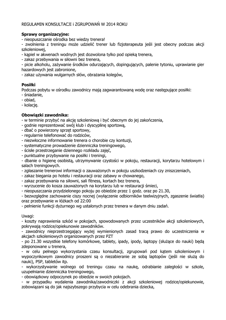 REGULAMIN KONSULTACJI i ZGRUPOWAŃ W 2014 ROKU Sprawy organizacyjne: - nieopuszczanie ośrodka bez wiedzy trenera! - zwolnienia z treningu może udzielić trener lub fizjoterapeuta jeśli jest obecny podczas akcji szkoleniowej, - kąpiel w akwenach wodnych jest dozwolona tylko pod opieką trenera, - zakaz przebywania w siłowni bez trenera, - picie alkoholu, zażywanie środków odurzających, dopingujących, palenie tytoniu, uprawianie gier hazardowych jest zabronione, - zakaz używania wulgarnych słów, obrażania kolegów, Posiłki Podczas pobytu w ośrodku zawodnicy mają zagwarantowaną wodę oraz następujące posiłki: - śniadanie, - obiad, - kolację. Obowiązki zawodnika: - w terminie przybyć na akcję szkoleniową i być obecnym do jej zakończenia, - godnie reprezentować swój klub i dyscyplinę sportową, - dbać o powierzony sprzęt sportowy, - regularnie telefonować do rodziców, - niezwłoczne informowanie trenera o chorobie czy kontuzji, - systematyczne prowadzenie dzienniczka treningowego, - ścisłe przestrzeganie dziennego rozkładu zajęć, - punktualne przybywanie na posiłki i treningi, - dbanie o higienę osobistą, utrzymywanie czystości w pokoju, restauracji, korytarzu hotelowym i salach treningowych. - zgłaszanie trenerowi informacji o zauważonych w pokoju uszkodzeniach czy zniszczeniach, - zakaz biegania po hotelu i restauracji oraz zabawy w chowanego, - zakaz przebywania na siłowni, sali fitness, kortach bez trenera, - wyrzucenie do kosza zauważonych na korytarzu lub w restauracji śmieci, - nieopuszczania przydzielonego pokoju po obiedzie przez 1 godz. oraz po 21.30, - bezwzględne zachowanie ciszy nocnej (wyłączenie odbiorników teelwizyjnych, zgaszenie światła) oraz przebywanie w łóżkach od 22:00 - pełnienie funkcji dyżurnego wg ustalonych przez trenera w danym dniu zadań. Uwagi: - koszty naprawienia szkód w pokojach, spowodowanych przez uczestników akcji szkoleniowych, pokrywają rodzice/opiekunowie zawodników. - zawodnicy nieprzestrzegający wyżej wymienionych zasad tracą prawo do uczestniczenia w akcjach szkoleniowych organizowanych przez PZT - po 21.30 wszystkie telefony komórkowe, tablety, ipady, ipody, laptopy (służące do nauki) będą zdeponowane u trenera, - w celu pełnego wykorzystania czasu konsultacji, zgrupowań pod kątem szkoleniowym i wypoczynkowym zawodnicy proszeni są o niezabieranie ze sobą laptopów (jeśli nie służą do nauki), PSP, tabletów itp. - wykorzystywanie wolnego od treningu czasu na naukę, odrabianie zaległości w szkole, uzupełnianie dzienniczka treningowego, - obowiązkowy odpoczynek po obiedzie w swoich pokojach. - w przypadku wydalenia zawodnika/zawodniczki z akcji szkoleniowej rodzice/opiekunowie, zobowiązani są do jak najszybszego przybycia w celu odebrania dziecka, Zawodnik powinien posiadać ze sobą: - legitymację szkolną, aktualną kartę zdrowia, zestaw witamin, podstawowe leki na przeziębienie i ból gardła, plastry, krem do opalania z silnym filtrem (tylko w lecie), pomadkę do ust isostar lub miód z cytryną, batony energetyczne lub suszone owoce, segregator z kartkami, długopis, linijkę, rakiety tenisowe, naciąg, 1 pary butów na zajęcia w sali fitness, 1 pary butów do biegania, 1 parę butów tenisowych, dostateczną liczbę skarpetek i koszulek, klapki lub kapcie do chodzenia w hotelu, skakankę, karimatę, strój na basen, czepek, klapki, czapkę, rękawiczki, ciepłą bluzę, kurtkę przeciwdeszczową lub wiatrówkę, pieniądze na ewentualne naciąganie rakiet,