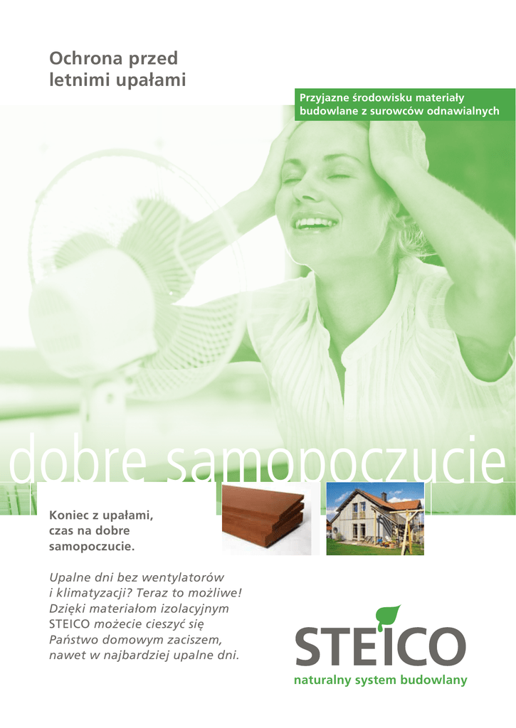 Ochrona przed letnimi upałami Przyjazne środowisku materiały budowlane z surowców odnawialnych dobre samopoczucie Koniec z upałami, czas na dobre samopoczucie. Upalne dni bez wentylatorów i klimatyzacji? Teraz to możliwe! Dzięki materiałom izolacyjnym STEICO możecie cieszyć się Państwo domowym zaciszem, nawet w najbardziej upalne dni. naturalny system budowlany Ochrona przed letnimi upałami Przyjazny klimat mieszkania nawet przy ekstremalnej pogodzie Lato jest takie piękne, jednak przy tropikalnych temperaturach w mieszkaniu nikt nie czuje się już tak komfortowo. Materiały izolacyjne STEICO dbają o to, aby w Państwa czterech ścianach nawet w upalne dni panował przyjemny chłód – bez stosowania drogich urządzeń klimatyzacyjnych. N asz klimat zmienia się, nie ma co do tego żadnej wątpliwości. I tak liczba tzw. „tropikalnych dni”, z temperaturami przekraczającymi 30°C zwiększyła się w minionych dekadach kilkukrotnie. Nic więc dziwnego, że ochrona przed wysokimi temperaturami w lecie zyskuje stale na znaczeniu w nowym budownictwie, jak i przy renowacjach starszych budynków. Bo przecież kto chce znosić temperatury rodem z sauny w całym domu? Dzięki odpowiednim konstrukcjom oraz bogatemu wyborowi materiałów, można stworzyć przyjemny klimat w mieszkaniu nawet w okresie upałów – i to w całkowicie naturalny sposób. Średnia temperatura dnia 10° 9° 8° Wartość jednostkowa 00 20 75 19 50 19 25 19 19 00 7° tendencja Źródło: niemiecka służba meteorologiczna Trend Pojedyncza wartość Źródło: Niemiecki Instytut Meteorologii 2 Ochrona przed letnimi upałami Punkt wyjściowy stanowią nieprzezroczyste elementy budowlane, jak ściany czy powierzchnie dachowe. Materiały izolacyjne STEICO pomagają tu w zatrzymaniu ciepła na zewnątrz – zaczynając od poddasza. To właśnie pomieszczenia na poddaszu są szczególnie narażone na nagrzewanie się w lecie. Jest to wynikiem zarówno często niewystarczającej ilości izolacji cieplnej dachu, jak i za niskiej zdolności akumulacyjnej jej poszczególnych warstw. Inaczej mówiąc: wiele konstrukcji nie potrafi stawić odpowiedniego oporu Ochrona przed letnimi upałami Na całym świecie zużywa się więcej energii na chłodzenie budynków niż na ich ogrzewanie. Na szczęście jest na to proste rozwiązanie. Dzięki zastosowaniu materiałów izolacyjnych STEICO z naturalnego włókna drzewnego możemy zaoszczędzić nie tylko na ogrzewaniu, ale i redukując koszty związane z użytkowaniem klimatyzacji. Zabezpieczenie na wszystkie pory roku Izolacja STEICO zmniejsza koszty zużycia energii i ogrzewania w zimie. Ta sama izolacja zapobiega nagrzewaniu się wnętrz w lecie. Stanowi również świetną izolację akustyczną. | DYFUZYJNOŚĆ CIEPLNA: Klucz do ochrony przed wysokimi temperaturami upalnym promieniom słonecznym w lecie. Temperatura przedostaje się w mniejszym lub większym stopniu bez przeszkód do pomieszczeń mieszkalnych. Rozwiązaniem są elementy budowlane o szczególnie wysokiej zdolności akumulacji ciepła – takie jak materiały izolacyjne STEICO. W upalnych godzinach popołudniowych pochłaniają ciepło i zatrzymują je aż do chłodniejszych godzin wieczornych. Wówczas zakumulowane ciepło zostaje z powrotem oddane na zewnątrz, np. poprzez przewietrzenie, nie stanowiąc obciążenia dla pomieszczenia mieszkalnego. Również inne środki mogą aktywnie wpłynąć na ochronę przed upałem w lecie: odpowiednie zakrycie powierzchni okien lub odpowiedni sposób wietrzenia pomieszczeń. Dzięki przemyślanej konstrukcji i gromadzącym ciepło materiałom izolacyjnym STEICO, pod naszym dachem znów zagoszczą przyjemnie niskie temperatury. Przy optymalizowaniu konstrukcji szczególnie istotny jest wybór właściwego materiału izolacyjnego. Do ochrony przed wysokimi temperaturami w lecie odpowiednie są materiały gwarantujące bardzo wolne przenikanie temperatur, tzn. materiały wskazujące możliwie najniższy współczynnik przewodnictwa temperaturowego. Materiały STEICO, dzięki niskiemu współczynnikowi przewodzenia ciepła izolują doskonale od utraty ciepła zimą, a jednocześnie łącząc w sobie wysoką zdolność akumulacji ciepła (duża gęstość i duża właściwa pojemność cieplna) chronią pomieszczenie mieszkalne przed nadmiernym nagrzewaniem się w okresie letnim. dyfuzyjność cieplna „a“ = przewodnictwo cieplne „λ“ cm² gęstość „ρ“ x właściwa pojemność cieplna „c“ h Gęstość [kg/ m³] Przewodnictwo cieplne [W/ (m* K)] Właściwa pojemność cieplna J/ (kg * K)] Dyfuzyjność cieplna a cm²/h Świerk, sosna, jodła 600 0,13 2500 3 STEICOuniversal Płyta poddachowa i ścienna 270 0,048 2100 3 STEICOprotect H System izolacji cieplnej pod tynk 265 0,048 2100 3 STEICOspecial dry System izolacyjny do renowacji 140 0,041 2100 5 STEICOtherm Stabilna izolacja cieplna 160 0,038 2100 4 STEICOtop Izolacja nakrokwiowa 140 0,041 2100 5 50 0,038 2100 13 Cegła pełna 1800 0,8 1000 16 Żelbet 2200 1,4 1050 22 Pianka polistyrenowa 40 0,040 1380 26 Pianka sztywna poliuretanowa 30 0,030 1380 26 Wełna szklana 30 0,035 800 52 Stal konstrukcyjna 7800 58 600 446 Aluminium 2700 200 921 2895 Materiał budowlany STEICOflex Elastyczna izolacja cieplna Ochrona przed letnimi upałami 3 Sposób działania na przykładzie Przykład konstrukcji dachowej o tłumieniu amplitudy wahań temperatury równym 10 godz. i o przesunięciu fazowym wynoszącym 12 godz. | Tłumienie amplitudy wahań temperatury i przesunięcie fazowe Przebieg temperatury zewnętrznej 40°C 40°C 30°C 20°C 10°C 10°C 8:00 14:00 20:00 2:00 Przebieg temperatury wewnętrznej 8:00 40°C 30°C 20°C 10°C Porównanie konstrukcji dachowych Dach 1 z elastyczną izolacją z włókna drzewnego STEICOflex KN O DR ZE W W Ó NE A Ł N z. 12 godz. •U = 0,17 W / m²*K •1 / TAV = 14 •Przesunięcie fazowe = 12 godz. •Pokrycie dachu •Łata •Kontrłata •Membrana dachowa •STEIC