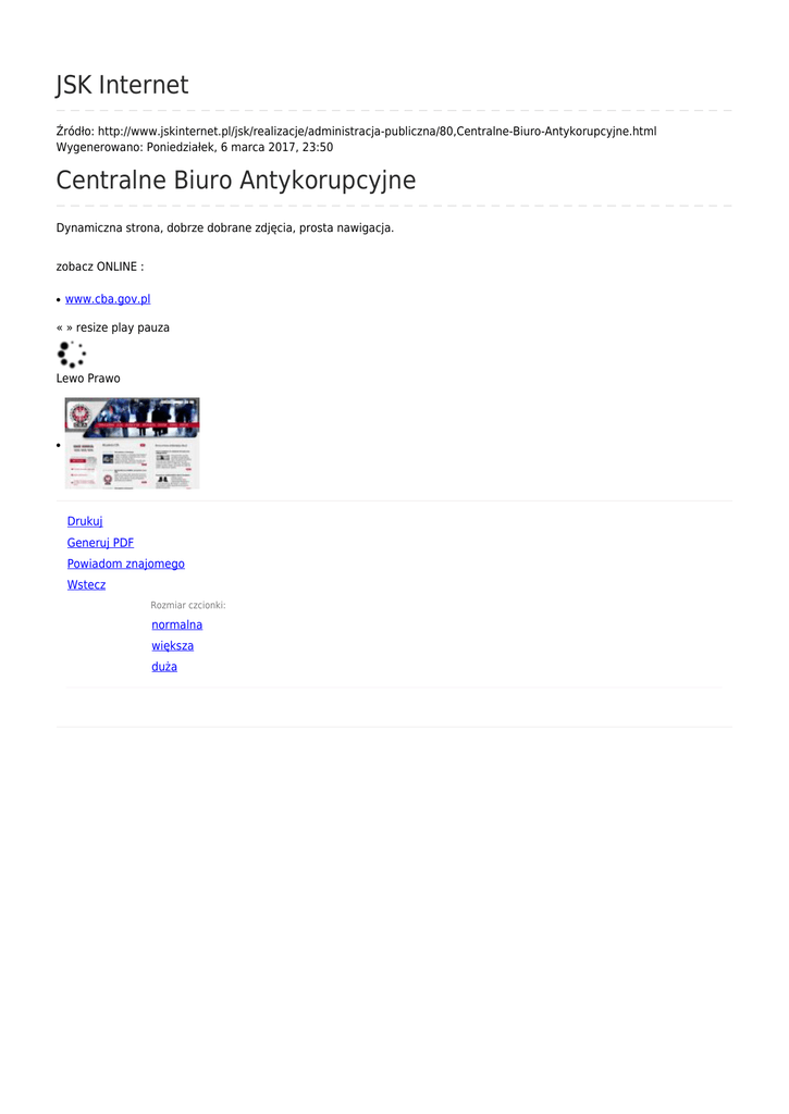 JSK Internet Źródło: http://www.jskinternet.pl/jsk/realizacje/administracja-publiczna/80,Centralne-Biuro-Antykorupcyjne.html Wygenerowano: Poniedziałek, 6 marca 2017, 23:50 Centralne Biuro Antykorupcyjne Dynamiczna strona, dobrze dobrane zdjęcia, prosta nawigacja. zobacz ONLINE : ● www.cba.gov.pl « » resize play pauza Lewo Prawo ● Drukuj Generuj PDF Powiadom znajomego Wstecz Rozmiar czcionki: normalna większa duża