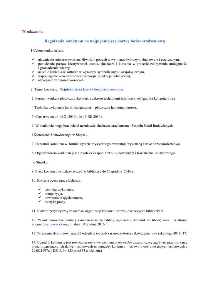 W załączeniu : Regulamin konkursu na najpiękniejszą kartkę bożonarodzeniową 1.Celem konkursu jest: ujawnienie zainteresowań, możliwości i potrzeb w wymiarze twórczym, duchowym i estetycznym, pobudzanie postaw kreatywności ucznia, słuchacza i kursanta w procesie zdobywania umiejętności i gromadzenia wiedzy, uczenie istnienia w kulturze w wymiarze symbolicznym i aksjologicznym, wspomaganie wszechstronnego rozwoju (edukacja holistyczna), rozwijanie zdolności twórczych. 2. Temat konkursu: Najpiękniejsza kartka bożonarodzeniowa. 3. Forma - konkurs plastyczny /konkurs z zakresu technologii informacyjnej (grafika komputerowa). 4.Technika wykonania kartki świątecznej - plastyczna lub komputerowa. 5. Czas trwania od 15.XI.2016r. do 15.XII.2016 r. 6. W konkursie mogą brać udział uczniowie, słuchacze oraz kursanci Zespołu Szkół Budowlanych i Kształcenia Ustawicznego w Słupsku. 7. Uczestnik konkursu w formie wyrazu artystycznego prezentuje wykonaną kartkę bożonarodzeniową. 8. Organizatorem konkursu jest biblioteka Zespołu Szkół Budowlanych i Kształcenia Ustawicznego w Słupsku. 9. Prace konkursowe należy złożyć w bibliotece do 15 grudnia 2016 r. 10. Kryteria oceny prac słuchaczy: technika wykonania, kompozycja, nowatorskie ujęcie tematu, estetyka pracy. 11. Nadzór merytoryczny w zakresie organizacji konkursu sprawuje nauczyciel bibliotekarz. 12. Wyniki konkursu zostaną zamieszczone na tablicy ogłoszeń ( dziennik e- librus) oraz na stronie internetowej www.ckziu.pl , dnia 19 grudnia 2016 r. 13. Wręczenie dyplomów i nagród odbędzie się podczas uroczystości zakończenia roku szkolnego 2016 /17. 14. Udział w konkursie jest równoznaczny z wyrażeniem przez osoby uczestniczące zgody na przetwarzanie przez organizatora ich danych osobowych na potrzeby konkursu – ustawa o ochronie danych osobowych z 29.08.1997r. ( DZ.U. Nr 133 poz.833 z póź. zm.)