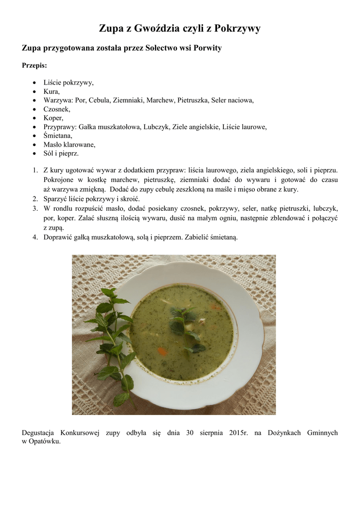 Zupa z Gwoździa czyli z Pokrzywy Zupa przygotowana została przez Sołectwo wsi Porwity Przepis: Liście pokrzywy, Kura, Warzywa: Por, Cebula, Ziemniaki, Marchew, Pietruszka, Seler naciowa, Czosnek, Koper, Przyprawy: Gałka muszkatołowa, Lubczyk, Ziele angielskie, Liście laurowe, Śmietana, Masło klarowane, Sól i pieprz. 1. Z kury ugotować wywar z dodatkiem przypraw: liścia laurowego, ziela angielskiego, soli i pieprzu. Pokrojone w kostkę marchew, pietruszkę, ziemniaki dodać do wywaru i gotować do czasu aż warzywa zmiękną. Dodać do zupy cebulę zeszkloną na maśle i mięso obrane z kury. 2. Sparzyć liście pokrzywy i skroić. 3. W rondlu rozpuścić masło, dodać posiekany czosnek, pokrzywy, seler, natkę pietruszki, lubczyk, por, koper. Zalać słuszną ilością wywaru, dusić na małym ogniu, następnie zblendować i połączyć z zupą. 4. Doprawić gałką muszkatołową, solą i pieprzem. Zabielić śmietaną. Degustacja Konkursowej zupy odbyła się dnia 30 sierpnia 2015r. na Dożynkach Gminnych w Opatówku.