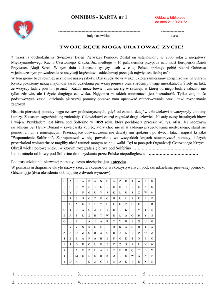 OMNIBUS - KARTA nr 1 Oddać w bibliotece do dnia 21.10.2016r. ------------------------------------------------------------ ----------------- imię i nazwisko klasa TWOJE RĘCE MOGĄ URATOWAĆ ŻYCIE! 7 września obchodziliśmy Światowy Dzień Pierwszej Pomocy. Został on ustanowiony w 2000 roku z inicjatywy Międzynarodowego Ruchu Czerwonego Krzyża. Już niedługo – 16 października przypada natomiast Europejski Dzień Przywraca Akcji Serca. W tym dniu kilkanaście tysięcy osób w całej Polsce spróbuje pobić rekord Guinessa w jednoczesnym prowadzeniu resuscytacji krążeniowo-oddechowej przez jak największą liczbę osób. W tym gronie będą również uczniowie naszej szkoły. Dzięki udziałowi w akcji, którą zamierzamy zorganizować na Starym Rynku pokażemy naszą znajomość zasad udzielania pierwszej pomocy oraz zwrócimy uwagę mieszkańców Środy na fakt, że wszyscy ludzie powinni je znać. Każdy może bowiem znaleźć się w sytuacji, w której od niego będzie zależało nie tylko zdrowie, ale i życie drugiego człowieka. Najgorsza w takich momentach jest bezradność. Tylko znajomość podstawowych zasad udzielania pierwszej pomocy pomoże nam opanować zdenerwowanie oraz ułatwi rozpoznanie zagrożeń. Historia pierwszej pomocy sięga czasów prehistorycznych, gdyż od zarania dziejów człowiekowi towarzyszyły choroby i urazy. Z czasem zagrożenia się zmieniały. Człowiekowi zaczął zagrażać drugi człowiek. Nastały czasy brutalnych bitew i wojen. Przykładem jest bitwa pod Solferino w 1859 roku, która pochłonęła przeszło 40 tys. ofiar. Jej naocznym świadkiem był Henry Dunant – szwajcarski kupiec, który choć nie miał żadnego przygotowania medycznego, starał się pomóc rannym i umierającym. Przerażające doświadczenia nie dawały mu spokoju i po dwóch latach napisał książkę "Wspomnienie Solferino". Zaproponował w niej powołanie we wszystkich krajach stowarzyszeń pomocy, których przeszkoleni wolontariusze mogliby nieść ratunek rannym na polu walki. Był to początek Organizacji Czerwonego Krzyża. Określ wiek i połowę wieku, w którym rozegrała się bitwa pod Solferino ………………………………………… Ile lat minęło od bitwy pod Solferino do odzyskania przez Polskę niepodległości? ……………………………… Podczas udzielania pierwszej pomocy często niezbędna jest apteczka. W poniższym diagramie ukryto nazwy sześciu akcesoriów wykorzystywanych podczas udzielania pierwszej pomocy. Odszukaj je (dwa określenia składają się z dwóch wyrazów). C A G A B A N D A Ż H T W F K F H C M E I G E R B I L E N O U Y U F G U V J K L U S Z W M L R B S C Z E G H U L A R E P P O A K T F Y U L O P B C R R O T R A C A F Y R T K P V T E B A I L Z H T W E L A O B Y S O L E I A I A R T Y B Z N U G L Y V S S U L E Ó K A N H I A A R O Z O R A C B J S E P O Z S B E A P A B E F G K T O P O E I D D O L E Z C Z S Ą L N W R F A F P L A S T E R Q T B Y T E M U L U B R O T O W A N F Y D A I K Z C I W A K Ę R X N 1. ………………………………… 3. ………………………………… 5. ………………………………… 2. ………………………………… 4. ………………………………… 6. ………………………………… Dlaczego tak ważna jest znajomość zasad pierwszej pomocy i natychmiastowa pomoc udzielona poszkodowanemu przez świadków zdarzenia? Istotny jest czas. Od momentu zatrzymania krążenia do rozpoczęcia działań ratunkowych nie powinno bowiem upłynąć więcej niż 4 minuty, ponieważ jest to czas, w którym komórki nie zaczną jeszcze ginąć. Wspieranie krążenia uciskaniem klatki piersiowej jest niejako podtrzymaniem komórek przy życiu, mimo zatrzymania krążenia. Wyobraź sobie sytuację: Wyjeżdżasz na grzyby do lasu położonego nieopodal Murzynowa Leśnego (7 km od Środy). U jednego z uczestników wycieczki dochodzi do nagłego zatrzymania krążenia. Nikt z towarzyszących tobie osób nie zna zasad udzielania pierwszej pomocy. Wasze działanie ogranicza się do wezwania pogotowia ratunkowego. Karetka porusza się z prędkością 70km/godz. Po jakim czasie dojedzie ona ze Środy na miejsce zdarzenia? …………………………………………………………………………………………………………………………………. …………………………………………………………………………………………………………………………………. …………………………………………………………………………………………………………………………………. Nagłe zatrzymanie krążenia jest to stan, w którym serce przestaje spełniać swoją funkcję. Oznacz literą P zdanie prawdziwe, a literą F zdanie fałszywe. a. Serce jest mięśniem położonym w klatce piersiowej po lewej stronie. . . . . . . . . . b. Konsekwencją systematycznej pracy serca jest rytmiczne rozciąganie ściany naczyń krwionośnych przez strumień krwi zwane tętnem lub pulsem. . . . . . . . . . c. Serce dorosłego człowieka uderza ok. 200 razy na minutę. . . . . . . . . . d. Nagłe zatrzymanie krążenia może prowadzić do śmierci . . . . . . . . . . W niektórych krajach wymagane jest uzyskanie zgody osoby poszkodowanej na udzielanie pomocy. W takich przypadkach należy wygłosić do poszkodowanego specjalną regułę zgodną z „Prawem dobrego Samarytanina”. Brzmi ona: Halo, słyszysz mnie? Mam na imię (……), czy mogę ci pomóc? Jest to pewnego rodzaju „Savoir vivre” pierwszej pomocy. Podaj cztery synonimy określenia Savoir vivre. 1. ………………………………… 3. ………………………………… 2. ………………………………… 4. ………………………………… Zaznacz prawidłową odpowiedź (w każdym ze zdań tylko jedna jest prawdziwa): 1. Czy każda osoba ma obowiązek udzielania pierwszej pomocy ofiarom wypadk