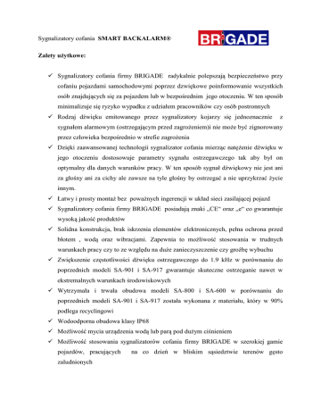 Sygnalizatory cofania SMART BACKALARM® Zalety użytkowe: Sygnalizatory cofania firmy BRIGADE radykalnie polepszają bezpieczeństwo przy cofaniu pojazdami samochodowymi poprzez dzwiękowe poinformowanie wszystkich osób znajdujących się za pojazdem lub w bezpośrednim jego otoczeniu. W ten sposób minimalizuje się ryzyko wypadku z udziałem pracowników czy osób postronnych Rodzaj dźwięku emitowanego przez sygnalizatory kojarzy się jednoznacznie z sygnałem alarmowym (ostrzegającym przed zagrożeniem)i nie może być zignorowany przez człowieka bezpośrednio w strefie zagrożenia Dzięki zaawansowanej technologii sygnalizator cofania mierząc natężenie dźwięku w jego otoczeniu dostosowuje parametry sygnału ostrzegawczego tak aby był on optymalny dla danych warunków pracy. W ten sposób sygnał dźwiękowy nie jest ani za głośny ani za cichy ale zawsze na tyle głośny by ostrzegać a nie uprzykrzać życie innym. Łatwy i prosty montaż bez poważnych ingerencji w układ sieci zasilającej pojazd Sygnalizatory cofania firmy BRIGADE posiadają znaki „CE“ oraz „e“ co gwarantuje wysoką jakość produktów Solidna konstrukcja, brak iskrzenia elementów elektronicznych, pełna ochrona przed błotem , wodą oraz wibracjami. Zapewnia to możliwość stosowania w trudnych warunkach pracy czy to ze względu na duże zanieczyszczenie czy groźbę wybuchu Zwiększenie częstotliwości dźwięku ostrzegawczego do 1.9 kHz w porównaniu do poprzednich modeli SA-901 i SA-917 gwarantuje skuteczne ostrzeganie nawet w ekstremalnych warunkach środowiskowych Wytrzymała i trwała obudowa modeli SA-800 i SA-600 w porównaniu do poprzednich modeli SA-901 i SA-917 została wykonana z materiału, który w 90% podlega recyclingowi Wodoodporna obudowa klasy IP68 Możliwość mycia urządzenia wodą lub parą pod dużym ciśnieniem Możliwość stosowania sygnalizatorów cofania firmy BRIGADE w szerokiej gamie pojazdów, pracujących zaludnionych na co dzień w bliskim sąsiedztwie terenów gęsto Sygnalizatory cofania SMART BACKALARM® Sygnalizator SA - 800 Dane techniczne: napięcie 12V-24V natężenie dźwieku 87dB-112dB częstotliwość dźwięku 1,9kHz pobór prądu 300mA wymiary (mm) 157(szerokość)x85(wysokość)x108(grubość) wodoodporność IP 68 Zalecane do stosowania w ciężarówkach, ładowarko-spycharkach, koparkach, pojazdach budowlanych. Sygnalizator SA - 600 Dane techniczne: natężenie dźwieku 87dB-107dB pozostałe parametry j.w. Sygnalizator SA - 400 Dane techniczne: napięcie 12V-24V natężenie dźwieku 87dB-102dB częstotliwość dźwięku 1,25kHz pobór prądu 200mA wymiary (mm) 100(szerokość) x 72(wysokość) x 32(grubość) wodoodporność IP 68 Zalecane do stosowania w ciężarówkach, budowlanych. Biuro handlowe: F.H. „Amervox” Sp. z o.o. ul. Warszawska 312 25-414 Kielce tel. 041/368-30-67 fax 041/346-21-18 kom.601480950 www.brigade.com.pl e-mail: [email protected]