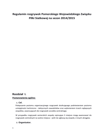 Regulamin rozgrywek Pomorskiego Wojewódzkiego Związku Piłki Siatkowej na sezon 2014/2015 Rozdział I. Postanowienia ogólne: 1. Cel. Polepszanie poziomu organizacyjnego rozgrywek skutkującego podniesieniem poziomu umiejętności techniczno - taktycznych zawodników oraz wyłonieniem trzech najlepszych zespołów, awansujących do rozgrywek szczebla centralnego. W przypadku rozgrywek seniorskich zespoły zajmujące 3 miejsce mogą awansować do rozgrywek centralnych na wolne miejsca – jeśli nie zgłoszą się zespoły z innych okręgów. 2. 1 Organizator. Z polecenia PZPS, organizatorem rozgrywek w WOJEWÓDZTWIE POMORSKIM jest Pomorski Wojewódzki Związek Piłki Siatkowej w Gdańsku. PWZPS organizuje rozgrywki i nimi kieruje, weryfikuje mecze, prowadzi ewidencję grających zawodników i ogłasza tabelę rozgrywek. Rozdział II. Kluby: 1. Kluby uczestniczące w rozgrywkach muszą być członkami PWZPS i PZPS. Warunkami przyjęcia zespołów klubu do rozgrywek są: Posiadanie ważnej licencji przez klub uczestniczący w rozgrywkach – jest to wymóg prawny wynikający z art. 6 ustawy o sporcie kwalifikowanym oraz komunikatem organizacyjnym PZPS. Do wniosku o wydanie licencji dla klubu należy załączyć: wyciąg z Krajowego Rejestru Sądowego lub innego rejestru albo z ewidencji właściwych dla formy organizacyjnej danego klubu, odpis statutu lub umowy spółki, pisemne zobowiązanie do przestrzegania postanowień regulaminu: PWZPS, PZPS i FIVB. Opłata za wydanie licencji wynosi 200,00 złotych jest wnoszona jednorazowo i dotyczy to wszystkich klubów biorących udział w rozgrywkach. Licencje dla klubów uczestniczących w rozgrywkach PL, PLK I i II ligi wydaje PZPS. Dla pozostałych klubów licencje z upoważnienia PZPS wydaje PWZPS. Jeżeli klub przez 3 sezony nie uczestniczy w rozgrywkach – licencja traci ważność i po tym okresie należy powtórzyć całą procedurę wydawania nowej licencji oraz ponowne dokonanie opłaty, pisemne zgłoszenie w określonym przez WGiD terminie, uregulowanie kar finansowych, składek członkowskich oraz innych opłat ustalonych przez PWZPS, terminowe dokonanie opłaty wpisowego, posiadanie przez członków zespołu wymaganych dokumentów określonych w niniejszym komunikacie oraz komunikatach szczegółowych. Warunkiem dopuszczenia drużyny do meczu jest posiadanie przez nią: Formularza zgłoszeniowego do udziału w rozgrywkach F-02 z pieczątką i podpisaną przez osobę do tego odpowiednią z PWZPS, Aktualnych badań lekarskich (w książeczkach zdrowia PZPS) oraz licencji ważnych na sezon 2014/2015 (bądź certyfikatów) zawodników i certyfikatów trenerskich oraz innych członków drużyny uprawnionych do zajmowania miejsca na ławce rezerwowych. Żadne inne zaświadczenia lekarskie nie będą honorowane, Imienną listę startową aktualną na dany mecz zawierającą numery zawodników (narastająco, z zaznaczonym zawodnikiem, pełniącym funkcję kapitana oraz zawodnikiem/kami Libero), nazwisko oraz co najmniej pierwszą literę imienia (w przypadku takich samych nazwisk – imię w pełnym brzmieniu), nazwiska i pierwszą literę imienia członków drużyny, którzy zgodnie z przepisami mają prawo i będą siedzieć na ławce rezerwowych Drużyna zobowiązana jest do przekazania wymienionych dokumentów sędziom, celem weryfikacji najpóźniej 45 min przed meczem. 2 2. Trenerzy. Wszyscy trenerzy prowadzący zespoły uczestniczące w rozgrywkach organizowanych przez PWZPS oraz PZPS winni posiadać: Licencję trenerską. Warunkiem otrzymania licencji jest złożenie następujących dokumentów: a) Oświadczenie o posiadaniu pełnej zdolności do czynności prawnych oraz korzystaniu z praw publicznych, b) kopie dokumentów potwierdzających posiadane kwalifikacje instruktora piłki siatkowej lub trenera piłki siatkowej kl. II, I lub mistrzowskie, c) Zaświadczenie lekarskie o zdolności do wykonywania obowiązków trenera (wydaje lekarz specjalista w dziedzinie medycyny sportowej albo lekarz posiadający certyfikat w zakresie orzecznictwa sportowo-lekarskiego nadany przez Polskie Towarzystwo Medycyny Sportowej), d) Opłata za wydanie licencji trenerskiej wynosi 100,00zł i pobierana jest jednorazowo. Dotyczy to wyłącznie tych trenerów i instruktorów, którzy prace szkoleniową w ramach PWZPS rozpoczynają po raz pierwszy lub mieli przerwę dłuższą niż trzy sezony. Dla pozostałych osób licencja wydawana będzie nieodpłatnie po przedłożeniu w/w dokumentów. Certyfikat trenerski. a) Wszyscy trenerzy i instruktorzy prowadzący zespoły, wpisani do protokółów zawodów jako I trener (C) oraz II trener (AC) muszą posiadać certyfikat, który wydawany jest na każdy sezon. Koszt za wydanie certyfikatu na sezon 2014/2015 wynosi: 20,00 złotych (dla osób, które zaliczą szkolenie licencyjne) i 150,00 złotych dla pozostałych osób, b) Warunkiem otrzymania certyfikatu jest posiadanie licencji trenerskiej. 3. Zawodnicy. W celu zarejestrowania zawodnika przez WGiD – klub rejestrujący zgodnie z Ustawą o sporcie kwalifikowanym musi bezwzględnie przedstawić n/w dokumenty: 3 Badania lekarskie (w książeczkach zdrowia PZPS), których ważność nie może przekroczyć 6 m-cy. Zaświadczenie lekarskie o braku przeciwwskazań do uprawiania określonej dyscypliny sportu wydaje lekarz specjalista w dziedzinie medycyny sportowej albo lekarz posiadający certyfikat w zakresie orzecznictwa sportowo-lekarskiego nadany przez Polskie Towarzystwo Medycyny Sportowej na udzielanie świadczeń zdrowotnych z zakresu medycyny sportowej – zgodnie Rozporządzeniem * Ministra Zdrowia z dnia 7.11.2002 r w sprawie zasad kwalifikacji do poszczególnych dyscyplin sportu, zakresu koniecznych badań lekarskich oraz ich częstotliwości w stosunku do dzieci i młodzieży do ukończenia 21 roku życia uprawiających sport amatorski /Dz.U. nr 191, poz. 1603 z 2002r. Dokument tożsamości. Ważnymi dokumentami tożsamości są: a) dowód osobisty, 