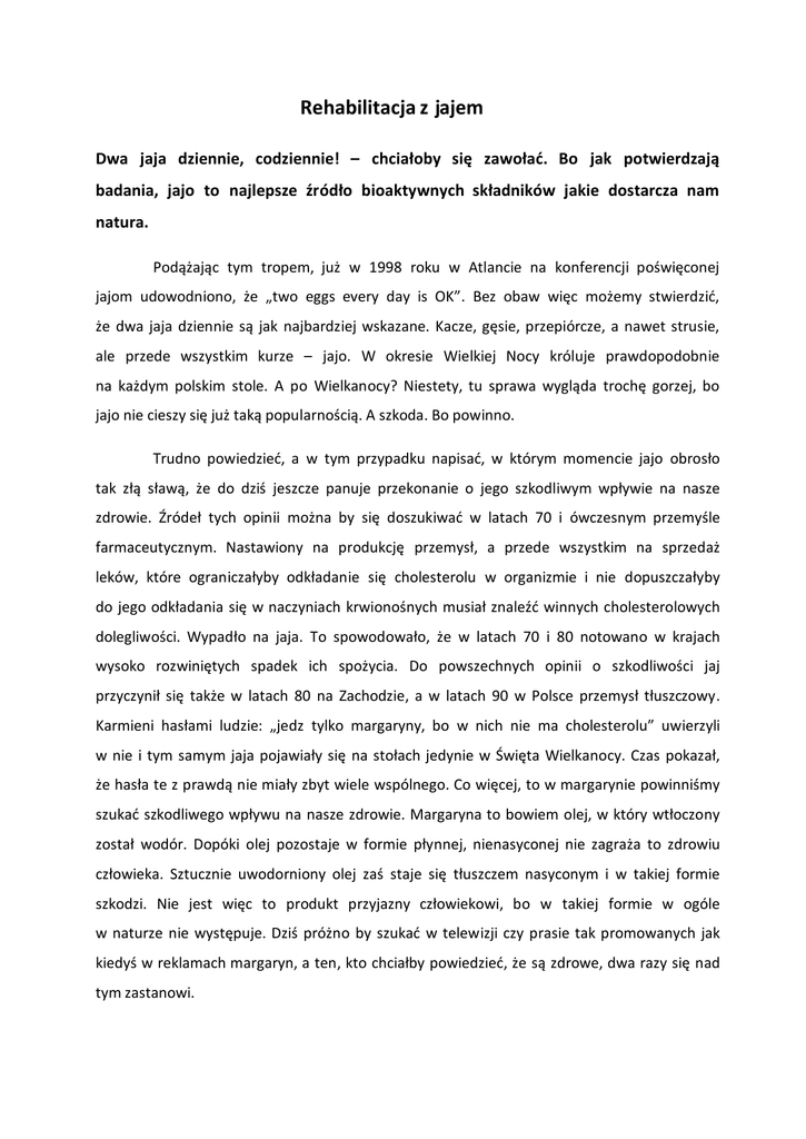 Rehabilitacja z jajem Dwa jaja dziennie, codziennie! – chciałoby się zawołać. Bo jak potwierdzają badania, jajo to najlepsze źródło bioaktywnych składników jakie dostarcza nam natura. Podążając tym tropem, już w 1998 roku w Atlancie na konferencji poświęconej jajom udowodniono, że „two eggs every day is OK”. Bez obaw więc możemy stwierdzić, że dwa jaja dziennie są jak najbardziej wskazane. Kacze, gęsie, przepiórcze, a nawet strusie, ale przede wszystkim kurze – jajo. W okresie Wielkiej Nocy króluje prawdopodobnie na każdym polskim stole. A po Wielkanocy? Niestety, tu sprawa wygląda trochę gorzej, bo jajo nie cieszy się już taką popularnością. A szkoda. Bo powinno. Trudno powiedzieć, a w tym przypadku napisać, w którym momencie jajo obrosło tak złą sławą, że do dziś jeszcze panuje przekonanie o jego szkodliwym wpływie na nasze zdrowie. Źródeł tych opinii można by się doszukiwać w latach 70 i ówczesnym przemyśle farmaceutycznym. Nastawiony na produkcję przemysł, a przede wszystkim na sprzedaż leków, które ograniczałyby odkładanie się cholesterolu w organizmie i nie dopuszczałyby do jego odkładania się w naczyniach krwionośnych musiał znaleźć winnych cholesterolowych dolegliwości. Wypadło na jaja. To spowodowało, że w latach 70 i 80 notowano w krajach wysoko rozwiniętych spadek ich spożycia. Do powszechnych opinii o szkodliwości jaj przyczynił się także w latach 80 na Zachodzie, a w latach 90 w Polsce przemysł tłuszczowy. Karmieni hasłami ludzie: „jedz tylko margaryny, bo w nich nie ma cholesterolu” uwierzyli w nie i tym samym jaja pojawiały się na stołach jedynie w Święta Wielkanocy. Czas pokazał, że hasła te z prawdą nie miały zbyt wiele wspólnego. Co więcej, to w margarynie powinniśmy szukać szkodliwego wpływu na nasze zdrowie. Margaryna to bowiem olej, w który wtłoczony został wodór. Dopóki olej pozostaje w formie płynnej, nienasyconej nie zagraża to zdrowiu człowieka. Sztucznie uwodorniony olej zaś staje się tłuszczem nasyconym i w takiej formie szkodzi. Nie jest więc to produkt przyjazny człowiekowi, bo w takiej formie w ogóle w naturze nie występuje. Dziś próżno by szukać w telewizji czy prasie tak promowanych jak kiedyś w reklamach margaryn, a ten, kto chciałby powiedzieć, że są zdrowe, dwa razy się nad tym zastanowi. A jajo? Zdaje się wracać do łask i to nie tylko za sprawą badań. Bo jajo broni się samo. „Lista zasług” jaja dla zdrowia jest długa. Zawiera w sobie precyzyjnie zaplanowany komplet białek, kwasów tłuszczowych, związków mineralnych, witamin, a wszystko to w idealnych proporcjach. Już po spożyciu jedynie dwóch jaj dziennie dawkujemy naszemu organizmowi „zastrzyk zdrowia”. Taka już bowiem ilość jaj pokrywa całkowicie zapotrzebowanie naszego organizmu na cholinę chroniącą wątrobę oraz na aminokwasy, które przyczyniają się do odbudowy komórek czy tkanek. To właśnie w jajach, nie w mleku, mięsie, roślinach występuje najwięcej aminokwasów. A skoro organizm nie potrafi wytworzyć sam tych kilkunastu aminokwasów niezbędnych do życia, musi pozyskiwać je z zewnątrz, między innymi lub może przede wszystkim z jaj. Jaja to także źródło licznych fosfolipidów. Lecytyny, która zapewnia sprawne funkcjonowanie mózgu i układu nerwowego, składników mineralnych, tj. fosforu i żelaza oraz niemal wszystkich witamin, w tym całej gamy witamin B, a przede wszystkim B12. To ona bowiem bierze udział w metabolizmie, a w szczególności tłuszczu i cukrów. Dwa jaja dziennie to połowa naszego zapotrzebowania na witaminy A i E oraz źródło luteiny, która wzmacnia wzrok. Co ciekawe, kompilacja jajo-jabłko także potrafi zaopatrzyć nasz organizm w witaminy. Jajo zagryzione jabłkiem wypełnia lukę i tym samym zaopatruje nas w witaminę C, której w jaju brak. Pisząc o zaletach jaj i ich pozytywnym wpływie na nasz organizm, warto także przyjrzeć się bliżej problemowi cholesterolu, a który od lat towarzyszy tematowi jaj i w pewien sposób degraduje ich szczególną rolę. Bo tak naprawdę „epidemia” cholesterolowa nie ma naukowego podłoża, a jedynym jej plusem jest wpływ na poszerzenie zaawansowanych badań nad cholesterolem, które tym samym obaliły pewne tezy. To prawda, że cholesterol przyczynia się do rozwoju miażdżycy czy chorób wieńcowych serca, ale należy, a wręcz trzeba dodać, że zdarza się to jedynie u osób obciążonych genetycznie hipercholesterolemią. Niezaprzeczalny też fakt to ten, że u pewnej grupy ludzi organizm nie jest w stanie poradzić sobie z nadprodukcją cholesterolu i odkłada go w naczyniach. Ale w przypadku osób zdrowych i sprawnych, organizm bez względu na to, jaką ilość produktów zawierających cholesterol spożyje, sam potrafi regulować jego poziom. I fakt bodajże najważniejszy! To nie cholesterol zawarty w jajach jest głównym sprawcą zła, tylko ten, wytwarzany przez wątrobę, czyli produkowany przez nas samych. A proporcje mówią same za siebie. Organizm nasz produkuje dziennie mnie więcej tyle samo cholesterolu, ile znajduje się w piętnastu jajach! Co ważne, a o czym często zapominamy to to, że cholesterol jest nam także do życia niezbędny. Występuje bowiem w każdej błonie komórkowej, w komórkach, uczestniczy w tworzeniu hormonów płciowych, kwasów żółciowych i witaminy D. Cholesterol również, w pewien sposób potrzebuje też jaj. Jajo bowiem to źródło dużej ilości korzystnego HDL-u. Związku fosfolipidowego, który wraz z LDL-em pełni rolę nośnika. Cholesterol nie jest bowiem w stanie samoistnie przepływać w systemie krwionośnym. Z pomocą przychodzą mu właśnie wspomniane związki fosfolipidowe. LDL zwany potocznie „złym cholesterolem” transportuje cholesterol z wątroby do komórek i tym samym przyczynia się do jego odkładania w naczyniach. „Dobry cholesterol” czyli HDL usuwa cały n