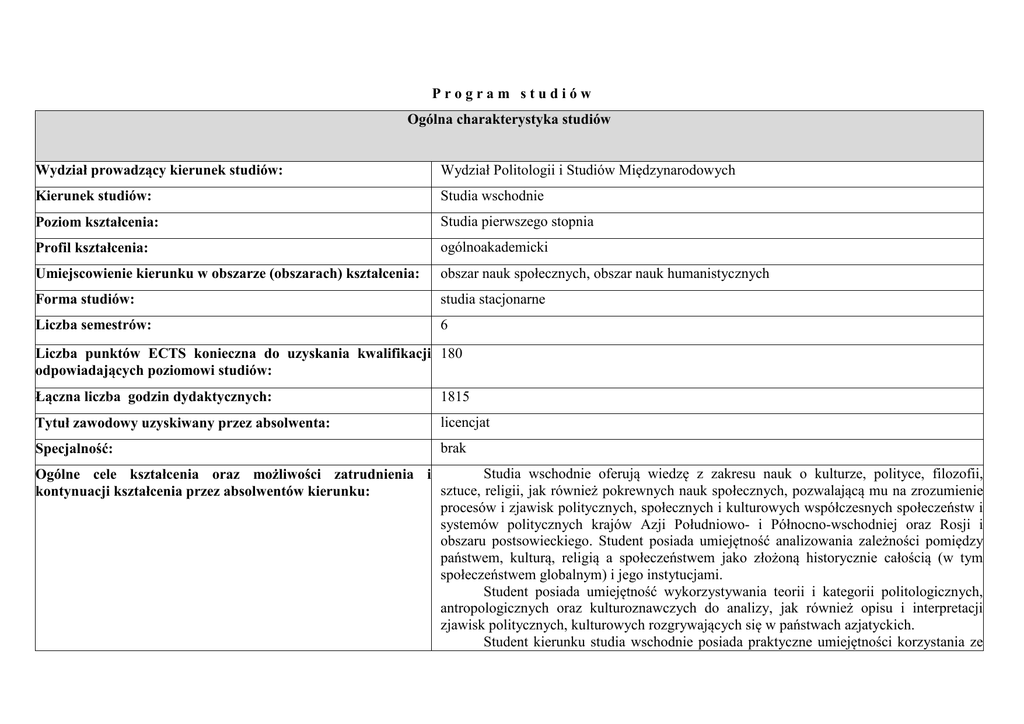 Program studiów Ogólna charakterystyka studiów Wydział prowadzący kierunek studiów: Wydział Politologii i Studiów Międzynarodowych Kierunek studiów: Studia wschodnie Poziom kształcenia: Studia pierwszego stopnia Profil kształcenia: ogólnoakademicki Umiejscowienie kierunku w obszarze (obszarach) kształcenia: obszar nauk społecznych, obszar nauk humanistycznych Forma studiów: studia stacjonarne Liczba semestrów: 6 Liczba punktów ECTS konieczna do uzyskania kwalifikacji 180 odpowiadających poziomowi studiów: Łączna liczba godzin dydaktycznych: 1815 Tytuł zawodowy uzyskiwany przez absolwenta: licencjat Specjalność: brak Studia wschodnie oferują wiedzę z zakresu nauk o kulturze, polityce, filozofii, Ogólne cele kształcenia oraz możliwości zatrudnienia i sztuce, religii, jak również pokrewnych nauk społecznych, pozwalającą mu na zrozumienie kontynuacji kształcenia przez absolwentów kierunku: procesów i zjawisk politycznych, społecznych i kulturowych współczesnych społeczeństw i systemów politycznych krajów Azji Południowo- i Północno-wschodniej oraz Rosji i obszaru postsowieckiego. Student posiada umiejętność analizowania zależności pomiędzy państwem, kulturą, religią a społeczeństwem jako złożoną historycznie całością (w tym społeczeństwem globalnym) i jego instytucjami. Student posiada umiejętność wykorzystywania teorii i kategorii politologicznych, antropologicznych oraz kulturoznawczych do analizy, jak również opisu i interpretacji zjawisk politycznych, kulturowych rozgrywających się w państwach azjatyckich. Student kierunku studia wschodnie posiada praktyczne umiejętności korzystania ze zdobytej wiedzy. Jego cechą jest umiejętność komunikowania się, negocjowania, argumentowania oraz pracy w zespole. Zna języki obce na poziomie biegłości B2 Europejskiego Systemu Opisu Kształcenia Językowego Rady Europy oraz posiada podstawy w posługiwaniu się językiem specjalistycznym z zakresu problematyki azjatyckiej. Ponadto dysponuje znajomością języka jednego z regionów Azji Południowo- i Północno-wschodniej lub Rosji. Kształcenie na kierunku studia wschodnie przygotowuje absolwentów przede wszystkim do pracy: • na stanowiskach analityka i specjalisty w administracji państwowej, • na stanowiskach specjalisty i konsultanta w zakresie stosunków międzynarodowych, • na stanowiskach specjalisty i konsultanta w zakresie komunikacji międzykulturowej, • w organizacjach i instytucjach krajowych, także tych współpracujących z zagranicą lub międzynarodowych, • na stanowiskach doradców politycznych i kulturalnych. Wskazanie związku programu kształcenia z misją i strategią Program kształcenia dla kierunku Studia wschodnie jest zgodny z przyjętym przez Senat UMK: UMK w dniu 28 XI 2000 roku misją Uczelni. Świadczyć o tym program kształcenia utworzony dla Studiów wschodnich odpowiadający przyjętej misji i strategii rozwoju Uniwersytetu Mikołaja Kopernika w Toruniu. W ramach kierunku prowadzone będą badania naukowe w zakresie studiów wschodnich oraz udostępnianie ich wyników. Ponadto nauczanie na poziomie akademickim odbywać się będzie według ogólno przyjętych standardów naukowych zmierzających do uzyskania najlepszych wyników dydaktycznych w zakresie wiedzy studentów, jak również ich umiejętności oraz kompetencji społecznych. Studenci kierunku Studia wschodnie będę się legitymizować przestrzeganiem uniwersalnych zasad etycznych oraz prawa z zakresu ochrony własności intelektualnej, a także dbaniem o dobre imię Uniwersytetu. Wskazanie, czy w procesie definiowania efektów kształcenia Efekty kształcenia oraz pogram studiów zostały opracowane w oparciu o prace Komisji ds. oraz w procesie przygotowania i udoskonalania programu Jakości Kształcenia na Wydziale Politologii i Studiów Międzynarodowych UMK. Prace nad studiów uwzględniono opinie interesariuszy, w tym w efektami kształcenia oraz programem studiów konsultowane były z przedstawicielami Samorządu Studenckiego UMK. Powołanie nowego kierunku studiów, jakim mają być Studia szczególności studentów, absolwentów, pracodawców: wschodnie stanowi odpowiedź na trendy współczesnej ekonomii i polityki, które w coraz większym stopniu zwracają się ku rynkom Azji Wschodniej, Azji Centralnej oraz Europy Wschodniej. Znacznie Studiów wschodnich polega także na wspieraniu rozwoju naszego regionu, w którym funkcjonują już firmy pochodzące z Azji Wschodniej. A w związku z tym efekty kształcenia oraz program studiów są skonstruowane w taki sposób, aby absolwenci kierunku mogli podejmować pracę w charakterze konsultantów czy ekspertów w kontaktach z azjatyckimi kontrahentami. Zakładane efekty kształcenia Przynależność do obszaru kształcenia S –n. społeczne H- n.humanistycznne Liczba punktów ECTS Przedmioty Charakter zajęć obligatoryjny (O fakultatywny (F) Moduł kształcenia I Wprowadzenie do studiów wschodnich Moduły kształcenia Moduły kształcenia wraz z zakładanymi efektami kształcenia Politologiczna analiza państwa i społeczeństwa Wprowadzenie do stosunków międzynarodowych Wstęp do azjoznawstwa 4 O S 4 O S 3 O S Teorie modernizacji społeczeństw azjatyckich 3 O S Wybrane zagadnienia z filozofii 3 O H Wprowadzenie do religioznawstwa 3 O H Geografia polityczna Eurazji 3 O S Podstawowe zagadnienia antropologii społecznej 3 O S Wiedza: Ma podstawową wiedzę o miejscu i znaczeniu Studiów wschodnich, jej źródeł oraz związków z innymi naukami. Posiada uporządkowaną wiedzę o historii badań nad społecznościami azjatyckimi i należącymi do Europy Wschodniej. Posiada elementarną wiedzę dotyczącą metodologii badań interkulturowych. Ma uporządkowaną wiedzę na temat podobieństw i różnic dotyczących systemów filozoficznych i kulturowych państw regionu Azji i Europy Wschodniej a myślą zachodnią. Umiejętności: Posługuje się podstawowymi