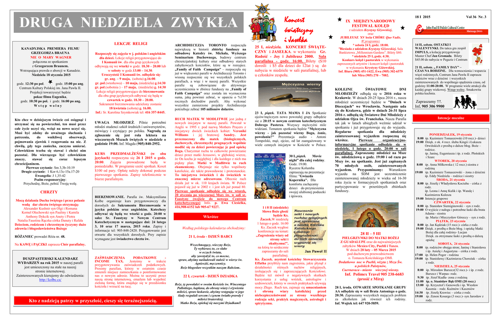DRUGA NIEDZIELA ZWYKŁA LEKCJE RELIGI KANADYJSKA PREMIERA FILMU GRZEGORZA BRAUNA NIE O MARY WAGNER połączona ze spotkaniem z Grzegorzem Braunem. Wstrząsająca prawda o aborcji w Kanadzie. Niedziela 18 stycznia 2015 godz. 12:30 po pol. godz. 15:00 po ang. Centrum Kultury Polskiej im. Jana Pawła II. Projekcji towarzyszyć będzie pokaz filmu Eugenika, godz. 10:30 po pol. i godz. 16:00 po ang. Wstęp wolny Kto chce w dzisiejszym świecie coś osiągnąć i utrzymać się na powierzchni, ten musi przez całe życie uczyć się, wciąż na nowo uczyć się. Musi być zdolny do uważnego słuchania i patrzenia, do wnikliwej obserwacji, pojmowania zjawisk i reagowania na nie. Z chwilą, gdy tego zaniecha, zaczyna umierać. Człowiekiem trzeba się stawać i chcieć nim pozostać. Dla wierzącego być człowiekiem znaczy, stawać się coraz lepszym chrześcijaninem. Pierwsze czytanie: Sm 3,3b-10.19 Drugie czytanie: 1 Kor 6,13c-15a.17-20 Ewangelia: J 1,35-42 Psalm responsoryjny: Przychodzę, Boże, pełnić Twoją wolę. Rozpoczęły się zajęcia w j. polskim i angielskim dla dzieci. Lekcje religii przygotowujące do I Komunii św. dla obu grup językowych odbywają się we wtorki w godz. 18.30 – 20.00 lub w soboty w godz.13.00 – 14.30. Uroczystość I Komunii św. odbędzie się: gr. ang. – 9 maja, (sobota) g.16:00. gr. pol.(wtorkowa) – 10 maja, (niedziela) g.14:30 gr. pol.(sobotnia ) – 17 maja, (niedziela) g. 14:30 Lekcje religii przygotowujące do bierzmowania dla obu grup językowych odbywać się będą w czwartek w godz. 18.30 – 20.00. Sakrament bierzmowania udzielony zostanie 18 kwietnia (sobota) g. 16.00. Inf.: Sr. Karolina Szymkowiak tel: 416 357-8445. UWAGA MŁODZIEŻ. Pilnie potrzebni młodzi studenci szkół średnich i uniwersytetów, mówiący i czytający po polsku. Nagrodą za zgłoszenie się jest rola lektora na wieczornych Mszach świętych w niedziele o godzinie 19:00. Inf. Magda (905) 848-2952. KURS PRZEDMAŁŻEŃSKI (w obu językach) rozpoczyna się 26 I 2015 o godz. 20:00. Zajęcia prowadzone będą w poniedziałki. W programie sześć spotkań. Koszt $100 od pary. Opłatę należy dokonać podczas pierwszego spotkania. Zapisy telefonicznie w biurze parafialnym. CHRZTY Mocą działania Ducha świętego i przez polanie wodą dar chrztu świętego otrzymają: Alexander Kushnir syn Olgi i Romana Kornel Olechowski syn Pauliny i Kamila Anthony Dykcik syn Anety i Piotra Natalia Faustina Rączka córka Danuty i Rafała Dzieciom, rodzicom i chrzestnym życzymy dużo zdrowia i błogosławieństwa Bożego RÓŻANIEC prowadzi Róża nr. 48. BIERZMOWANIE. Parafia św. Maksymiliana Kolbe organizuje kurs przygotowawczy dla dorosłych do Sakramentu Bierzmowania w języku polskim oraz angielskim. Katechezy odbywać się będą we wtorki o godz. 20:00 w salce Sr. Faustyny w Nowym Centrum Katechetycznym w następujące dni: 24 lutego 3, 10 oraz 17 marca, 2015 roku. Zapisy i informacje tel: 905-848-2420. Przygotowanie jest otwarte dla wszystkich dorosłych. Przy zapisie wymagane jest świadectwo chrztu św. Na KAWĘ i PĄCZKI zaprasza Chór parafialny. DUSZPASTERSKI KALENDARZ WYDARZEŃ na rok 2015 w naszej parafii jest umieszczony na stałe na naszej stronie internetowej. Zainteresowanych kierujemy do odwiedzenia: http://kolbe.ca/ ZAŚWIADCZENIA PODATKOWE INCOME TAX. Jesteśmy w trakcie przygotowywania zaświadczeń podatkowych. Prosimy parafian, którzy w ostatnim czasie zmienili miejsce zamieszkania o poinformowanie nas o nowym adresie. Można to uczynić przez naszą stronę internetową, emailem lub wypełnić zieloną formę, która znajduje się w przedsionku kościoła i wrzucić na tacę. Kto z nadzieją patrzy w przyszłość, cieszy się teraźnejszością. a gwiazdę patrząc przewodnią, z dalekiej Mędrce mkną ziemi. Szukają światła z pochodnią, czczą Boga dary hojnymi…” ARCHIDIECEZJA TORONTO rozpoczęła największą w historii zbiórkę funduszy na odbudowę Katedry św. Michała, Wyższego Seminarium Duchownego, budowy centrum chrześcijańskiej kultury oraz odbudowy starych zabytkowych kościołów, które są w rozsypce. „Family of Faith Campaign” – rozpoczęła się już w większości parafii w Archidiecezji Toronto i wiosną rozpocznie się we wszystkich polskich parafiach, a więc i w naszej parafii. Wszystkie parafie są zobowiązane do aktywnego uczestniczenia w zbiórce funduszy na „Family of Faith Campaign” oraz została im wyznaczona suma, jaką powinni zebrać, w oparciu o %130 rocznych dochodów parafii. Aby wykonać wszystkie zamierzone projekty Archidiecezja potrzebuje zebrać 105 milionów dolarów. RUCH MATEK W MODLITWIE jest jedną z nowych inicjatyw w naszej parafii. Powstał w Anglii w 1995 r. pod nazwą Mothers Prayers z inicjatywy dwóch świeckich kobiet: Veroniki Williams i jej bratowej Sandry. Jest przeznaczony dla matek (biologicznych, duchowych, chrzestnych) pragnących wspólnie modlić się za dzieci powierzając je pod opiekę Boga. Charyzmat ruchu to całkowite powierzanie dzieci przez matki Jezusowi, w głębokiej wierze, że On kocha je najgłębiej i dla każdego z nich ma piękny plan. Matki w Modlitwie to ruch ekumeniczny. Obejmuje nie tylko wspólnoty katolickie, ale także prawosławne i protestanckie. To inicjatywa świeckich i do świeckich w znacznej mierze adresowana. Obecnie ruch działa już w ok. 110 krajach świata. W Polsce pojawił się już w 2002 r. i jest ich już ponad 80. Pierwsze spotkanie odbędzie się we wtorek, 20 stycznia po wieczornej Mszy św. w sali sr. Faustyny (wejście do nowego Centrum katechetycznego) Info. p. Ewa Ciesielka, 416,908-6152 lub 905-67 9227. Wkrótce Według polskiego kalendarza obchodzimy: 21 I, środa - DZIEŃ BABCI Wszechmogący, wieczny Boże, Ty wybierasz to, co słabe w oczach świata, aby zawstydzić to, co mocne, spraw, abyśmy naśladowali stałość w wierze św. Agnieszki, męczennicy. Boże błogosław wszystkim naszym Babciom. 22 I, czwartek - DZIE