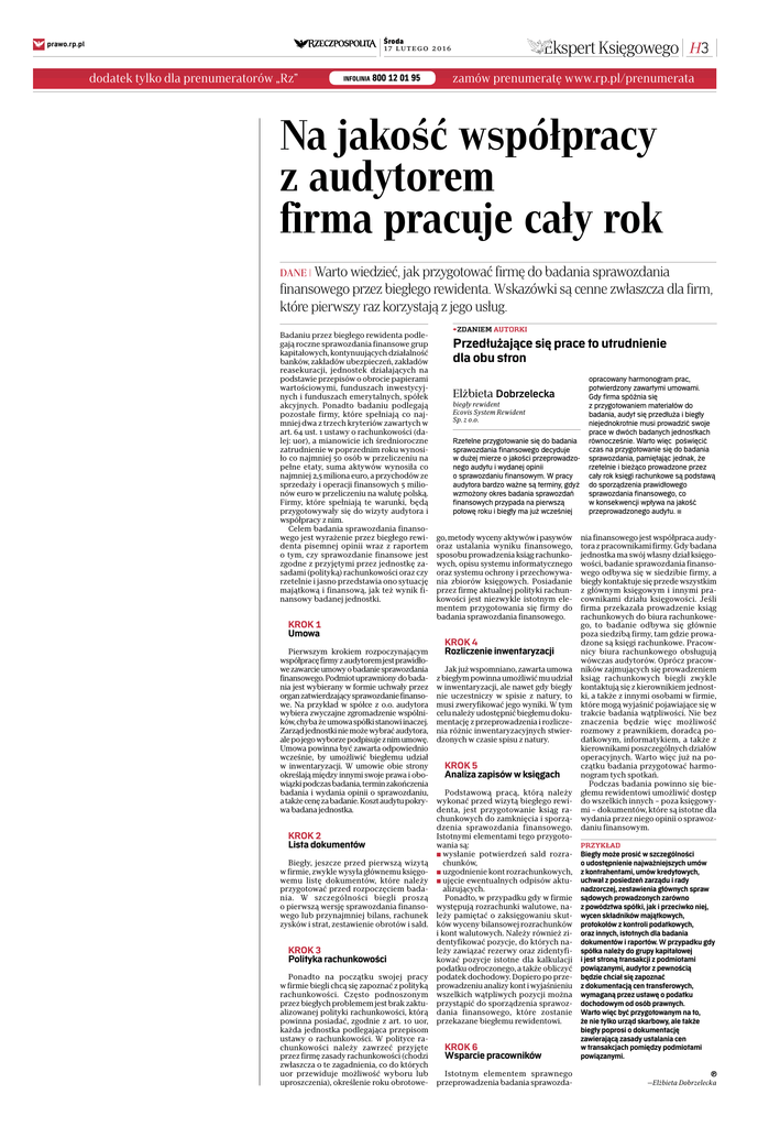 Środa ◊ prawo.rp.pl Ekspert Księgowego H3 17 lutego 2016 dodatek tylko dla prenumeratorów „Rz” infolinia 800 12 01 95 zamów prenumeratę www.rp.pl/prenumerata Na jakość współpracy z audytorem firma pracuje cały rok DANE | Warto wiedzieć, jak przygotować firmę do badania sprawozdania finansowego przez biegłego rewidenta. Wskazówki są cenne zwłaszcza dla firm, które pierwszy raz korzystają z jego usług. Badaniu przez biegłego rewidenta podlegają roczne sprawozdania finansowe grup kapitałowych, kontynuujących działalność banków, zakładów ubezpieczeń, zakładów reasekuracji, jednostek działających na podstawie przepisów o obrocie papierami wartościowymi, funduszach inwestycyjnych i funduszach emerytalnych, spółek akcyjnych. Ponadto badaniu podlegają pozostałe firmy, które spełniają co najmniej dwa z trzech kryteriów zawartych w art. 64 ust. 1 ustawy o rachunkowości (dalej: uor), a mianowicie ich średnioroczne zatrudnienie w poprzednim roku wynosiło co najmniej 50 osób w przeliczeniu na pełne etaty, suma aktywów wynosiła co najmniej 2,5 miliona euro, a przychodów ze sprzedaży i operacji finansowych 5 milionów euro w przeliczeniu na walutę polską. Firmy, które spełniają te warunki, będą przygotowywały się do wizyty audytora i współpracy z nim. Celem badania sprawozdania finansowego jest wyrażenie przez biegłego rewidenta pisemnej opinii wraz z raportem o tym, czy sprawozdanie finansowe jest zgodne z przyjętymi przez jednostkę zasadami (polityką) rachunkowości oraz czy rzetelnie i jasno przedstawia ono sytuację majątkową i finansową, jak też wynik finansowy badanej jednostki. Krok 1 Umowa Pierwszym krokiem rozpoczynającym współpracę firmy z audytorem jest prawidłowe zawarcie umowy o badanie sprawozdania finansowego. Podmiot uprawniony do badania jest wybierany w formie uchwały przez organ zatwierdzający sprawozdanie finansowe. Na przykład w spółce z o.o. audytora wybiera zwyczajne zgromadzenie wspólników, chyba że umowa spółki stanowi inaczej. Zarząd jednostki nie może wybrać audytora, ale po jego wyborze podpisuje z nim umowę. Umowa powinna być zawarta odpowiednio wcześnie, by umożliwić biegłemu udział w inwentaryzacji. W umowie obie strony określają między innymi swoje prawa i obowiązki podczas badania, termin zakończenia badania i wydania opinii o sprawozdaniu, a także cenę za badanie. Koszt audytu pokrywa badana jednostka. KROK 2 Lista dokumentów Biegły, jeszcze przed pierwszą wizytą w firmie, zwykle wysyła głównemu księgowemu listę dokumentów, które należy przygotować przed rozpoczęciem badania. W szczególności biegli proszą o pierwszą wersję sprawozdania finansowego lub przynajmniej bilans, rachunek zysków i strat, zestawienie obrotów i sald. KROK 3 Polityka rachunkowości Ponadto na początku swojej pracy w firmie biegli chcą się zapoznać z polityką rachunkowości. Często podnoszonym przez biegłych problemem jest brak zaktualizowanej polityki rachunkowości, którą powinna posiadać, zgodnie z art. 10 uor, każda jednostka podlegająca przepisom ustawy o rachunkowości. W polityce rachunkowości należy zawrzeć przyjęte przez firmę zasady rachunkowości (chodzi zwłaszcza o te zagadnienia, co do których uor przewiduje możliwość wyboru lub uproszczenia), określenie roku obrotowe- >zdaniem autorki Przedłużające się prace to utrudnienie dla obu stron Elżbieta Dobrzelecka biegły rewident Ecovis System Rewident Sp. z o.o. Rzetelne przygotowanie się do badania sprawozdania finansowego decyduje w dużej mierze o jakości przeprowadzonego audytu i wydanej opinii o sprawozdaniu finansowym. W pracy audytora bardzo ważne są terminy, gdyż wzmożony okres badania sprawozdań finansowych przypada na pierwszą połowę roku i biegły ma już wcześniej go, metody wyceny aktywów i pasywów oraz ustalania wyniku finansowego, sposobu prowadzenia ksiąg rachunkowych, opisu systemu informatycznego oraz systemu ochrony i przechowywania zbiorów księgowych. Posiadanie przez firmę aktualnej polityki rachunkowości jest niezwykle istotnym elementem przygotowania się firmy do badania sprawozdania finansowego. KROK 4 Rozliczenie inwentaryzacji Jak już wspomniano, zawarta umowa z biegłym powinna umożliwić mu udział w inwentaryzacji, ale nawet gdy biegły nie uczestniczy w spisie z natury, to musi zweryfikować jego wyniki. W tym celu należy udostępnić biegłemu dokumentację z przeprowadzenia i rozliczenia różnic inwentaryzacyjnych stwierdzonych w czasie spisu z natury. KROK 5 Analiza zapisów w księgach Podstawową pracą, którą należy wykonać przed wizytą biegłego rewidenta, jest przygotowanie ksiąg rachunkowych do zamknięcia i sporządzenia sprawozdania finansowego. Istotnymi elementami tego przygotowania są: ∑ wysłanie potwierdzeń sald rozrachunków, ∑ uzgodnienie kont rozrachunkowych, ∑ ujęcie ewentualnych odpisów aktualizujących. Ponadto, w przypadku gdy w firmie występują rozrachunki walutowe, należy pamiętać o zaksięgowaniu skutków wyceny bilansowej rozrachunków i kont walutowych. Należy również zidentyfikować pozycje, do których należy zawiązać rezerwy oraz zidentyfikować pozycje istotne dla kalkulacji podatku odroczonego, a także obliczyć podatek dochodowy. Dopiero po przeprowadzeniu analizy kont i wyjaśnieniu wszelkich wątpliwych pozycji można przystąpić do sporządzenia sprawozdania finansowego, które zostanie przekazane biegłemu rewidentowi. KROK 6 Wsparcie pracowników Istotnym elementem sprawnego przeprowadzenia badania sprawozda- opracowany harmonogram prac, potwierdzony zawartymi umowami. Gdy firma spóźnia się z przygotowaniem materiałów do badania, audyt się przedłuża i biegły niejednokrotnie musi prowadzić swoje prace w dwóch badanych jednostkach równocześnie. Warto więc poświęcić czas na przygotowanie się do badania sprawozdania, pamiętając jednak, że rzetel