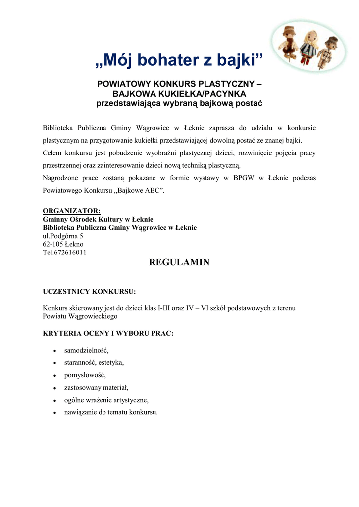 „Mój bohater z bajki” POWIATOWY KONKURS PLASTYCZNY – BAJKOWA KUKIEŁKA/PACYNKA przedstawiająca wybraną bajkową postać Biblioteka Publiczna Gminy Wągrowiec w Łeknie zaprasza do udziału w konkursie plastycznym na przygotowanie kukiełki przedstawiającej dowolną postać ze znanej bajki. Celem konkursu jest pobudzenie wyobraźni plastycznej dzieci, rozwinięcie pojęcia pracy przestrzennej oraz zainteresowanie dzieci nową techniką plastyczną. Nagrodzone prace zostaną pokazane w formie wystawy w BPGW w Łeknie podczas Powiatowego Konkursu „Bajkowe ABC”. ORGANIZATOR: Gminny Ośrodek Kultury w Łeknie Biblioteka Publiczna Gminy Wągrowiec w Łeknie ul.Podgórna 5 62-105 Łekno Tel.672616011 REGULAMIN UCZESTNICY KONKURSU: Konkurs skierowany jest do dzieci klas I-III oraz IV – VI szkół podstawowych z terenu Powiatu Wągrowieckiego KRYTERIA OCENY I WYBORU PRAC: samodzielność, staranność, estetyka, pomysłowość, zastosowany materiał, ogólne wrażenie artystyczne, nawiązanie do tematu konkursu. WARUNKI UDZIAŁU W KONKURSIE: Prace oceniane będą w dwóch kategoriach wiekowych: Klasy I-III, Klasy IV - VI Zgłaszane prace muszą być wykonane indywidualnie (prace zespołowe nie będą oceniane), Każdy uczestnik konkursu może złożyć tylko JEDNĄ pracę, Wszystkie nadesłane prace oraz prawa autorskie przechodzą na własność Organizatora, który będzie wykorzystywał kukiełki/pacynki podczas organizowanych przez GOK i BPGW w Łeknie zajęć oraz przedstawień, Kukiełka/pacynka musi przedstawiać dowolnie wybraną bajkową postać, Kukiełka/pacynka musi mieć formę przestrzenną, Dopuszcza się wykonanie kukiełki/pacynki z następujących materiałów: papier, tkanina, drut, drewno, techniki łączone, Do każdej pracy należy dołączyć starannie przymocowaną małą metryczkę z następującymi informacjami: imię i nazwisko, klasa, szkoła, nr telefonu oraz postać jaką przedstawia kukiełka, Wielkość wykonanych prac: od 0,30 – 0,50 metra + kij, na którym będą osadzone, Udział w konkursie jest równocześnie zgodą na filmowanie, fotografowanie oraz publikację prac, Ogłoszenie wyników i wręczenie nagród nastąpi 16 marca 2016 r. podczas powiatowego konkursu „Bajkowe ABC” w siedzibie Organizatora. Organizator zastrzega sobie możliwość zmiany terminów ogłoszenia wyników oraz wręczenia nagród. Prace prosimy dostarczyć do 9.03.2016 r. do: Gminnego Ośrodka Kultury w Łeknie, ul. Podgórna 5 , 62-105 Łekno tel. 672616011 w godzinach: pon -pt 8.00-17.00, sob – 9.00-14.00